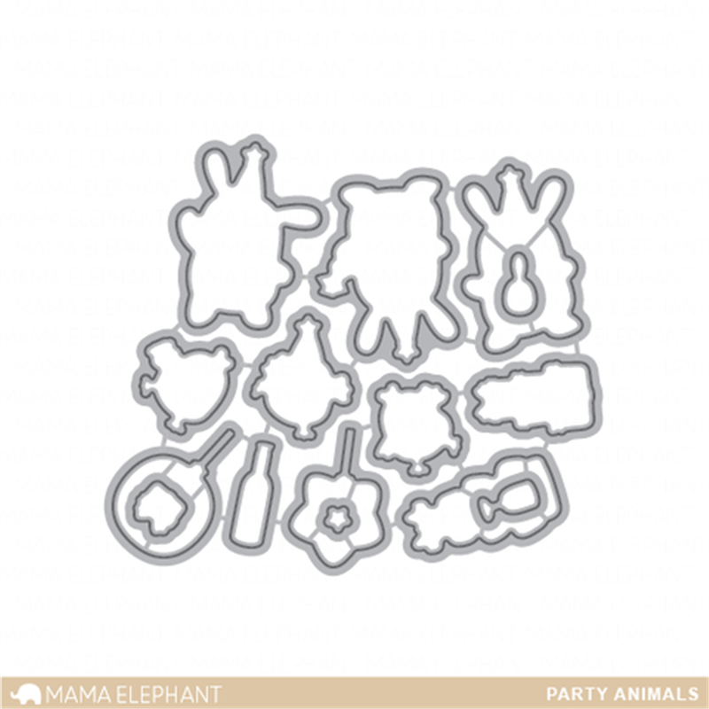 Dette die sæt fra Mama Elephant hedder Party Animals og passer perfekt til stempelsættet af samme navn fra Mama Elephant. Matchende dies gør det super hurtigt og nemt at skære dine stemplede motiver ud eller lave andre teknikker. Kaninerne måler ca. 3,7x4,9 cm, kyllingerne måler ca. 2,4x2,5 cm og kagen måler ca. 2,2x3,9 cm.