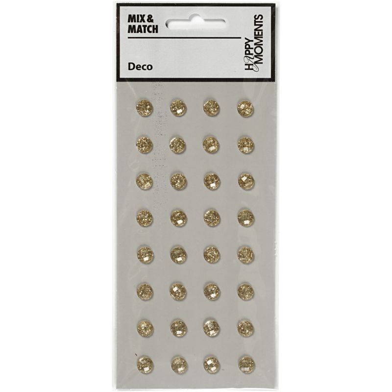 Gold Rhinestones Deco fra Happy Moments indeholder 32 halvperler med guld glitter effekt og en smuk facetsleben overflade der give en rigtig lækker effekt når man ser det i lyset. Hver rhinsten måler ca. 8 mm i diameter og er perfekte til at dekorere både kort og layouts.