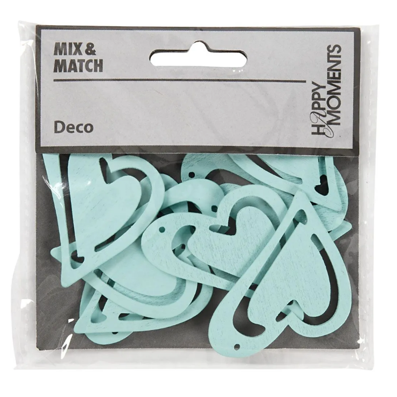 Happy Moments Stort Skævt hjerte er fine træhjerter i tyrkis. Pakken indeholder 10 hjerter. Hjerterne måler 55 x 45 mm. Hjerterne kan bruges som pynt enten til borddækning, indbydelser eller bordkort.