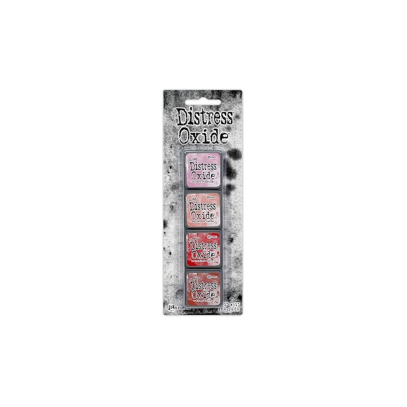 Pakken indeholder: Distress Mini Oxide i farverne - Kitch Flamingo, Saltwater Taffy, Candied Apple og Fired Brick.