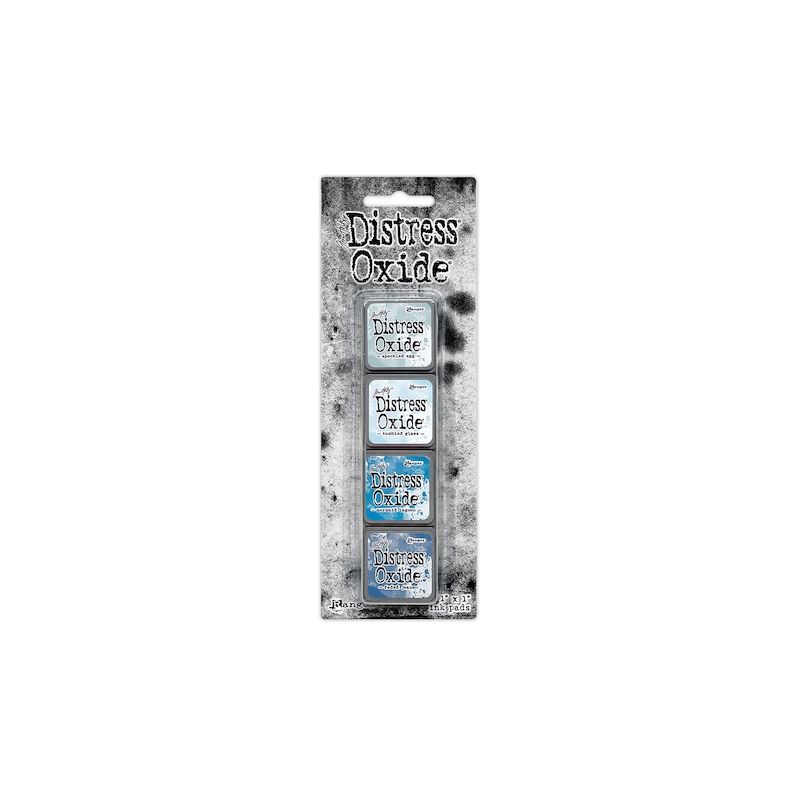 Pakken indeholder: Distress Mini Oxide i farverne - Speckled Egg, Tumbled Glass, Mermaid Lagoon og Faded Jeans.