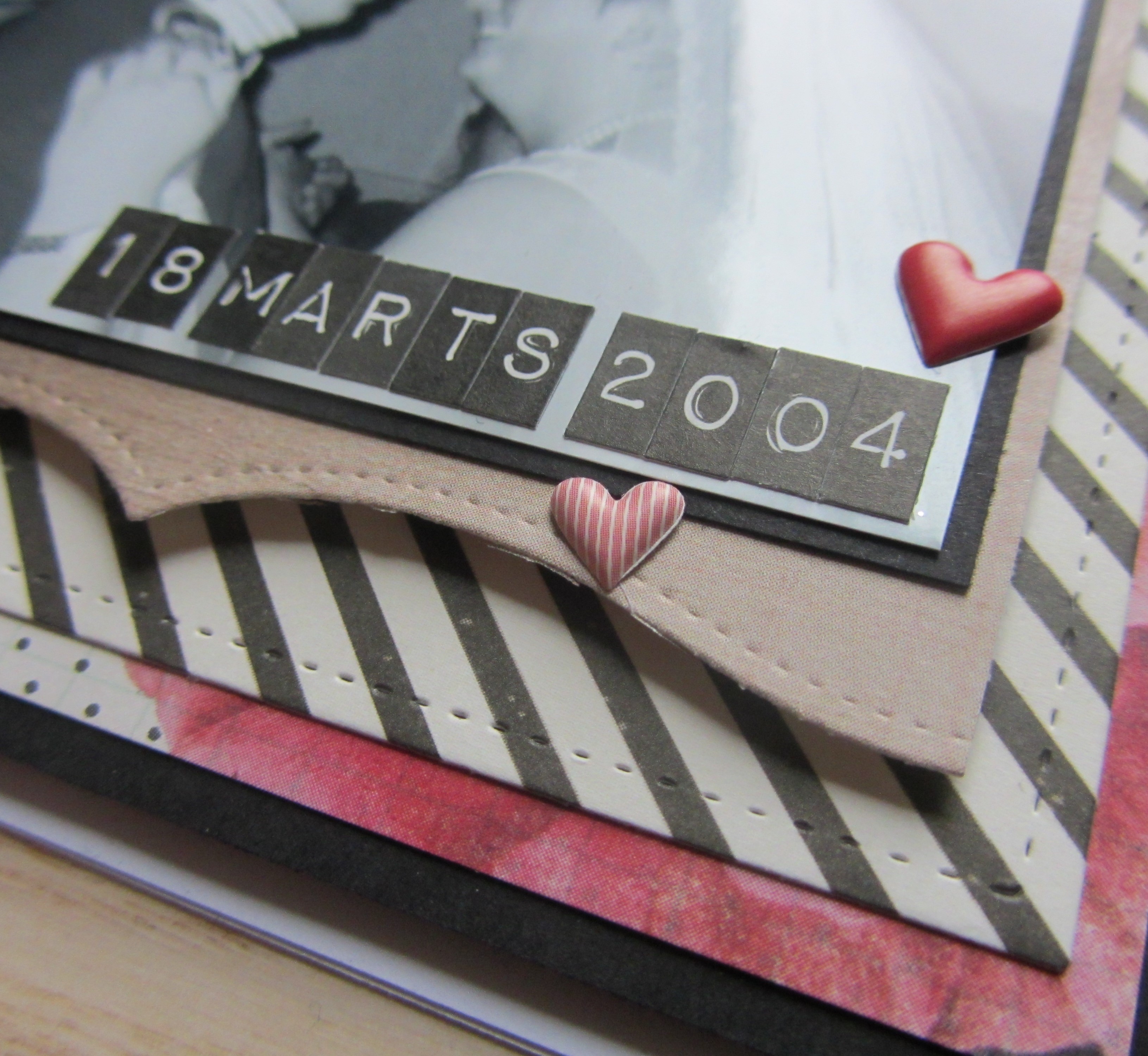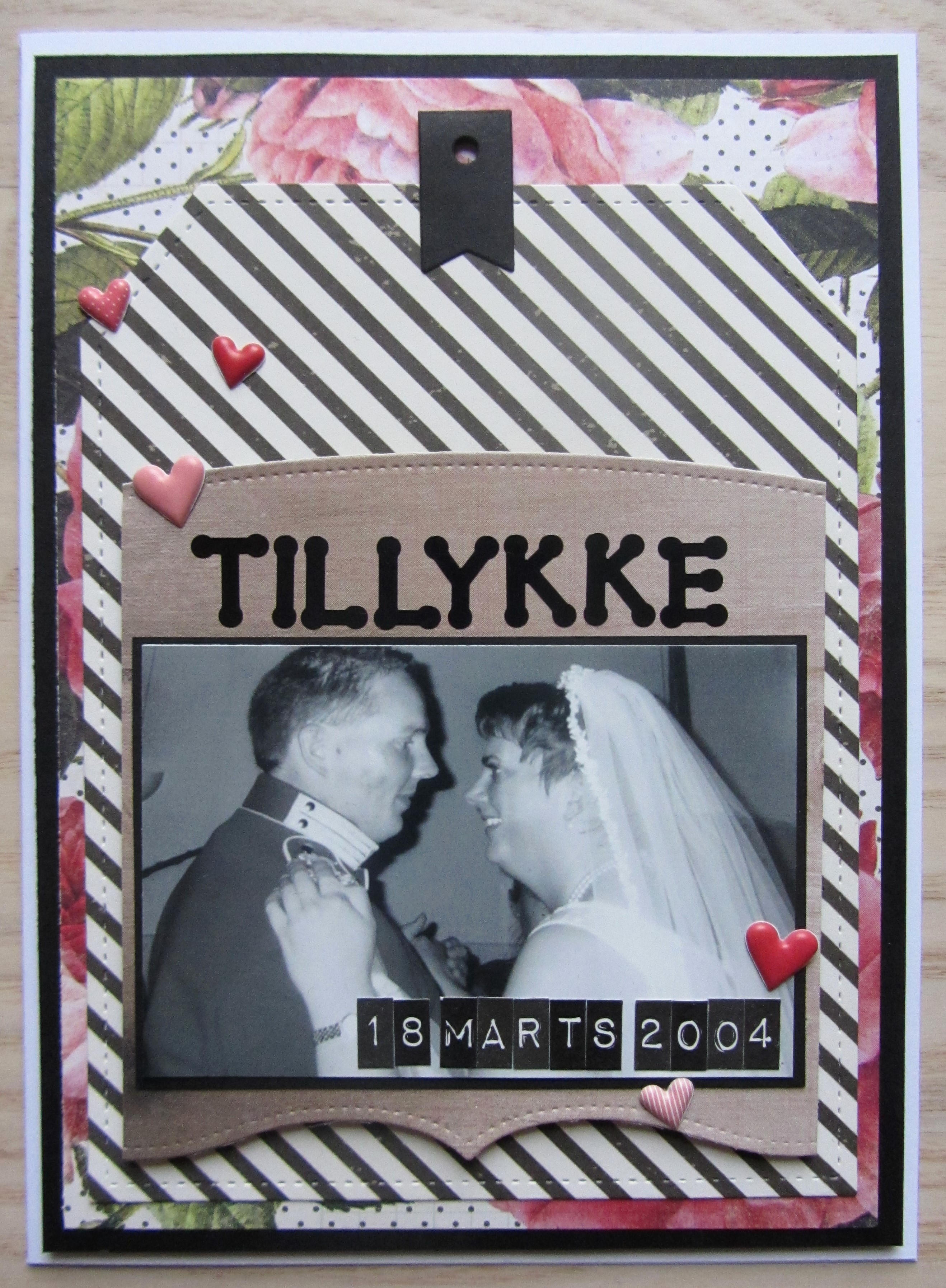 De små bogstaver er fra Tim Holtz. Hjerterne og Tillykke er fra mit eget stash.