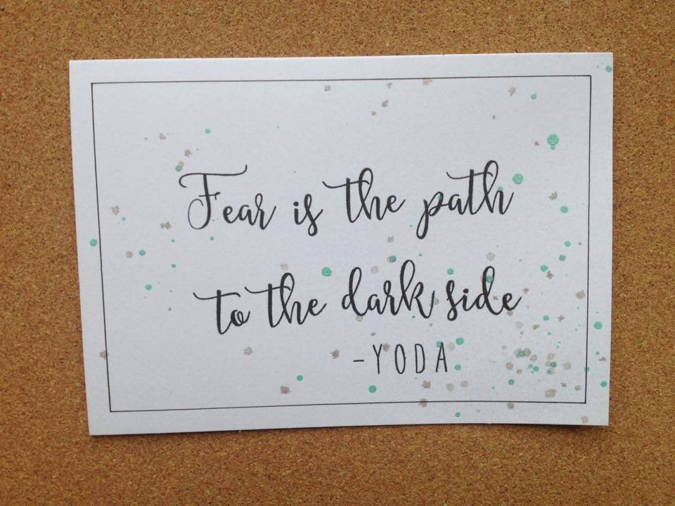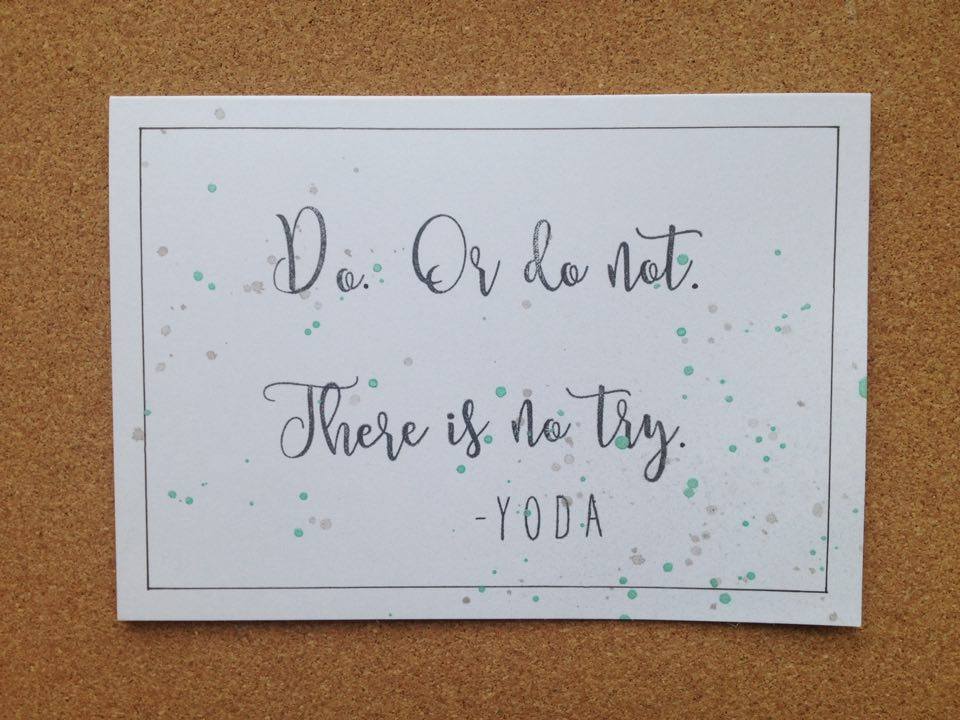 Jeg har brugt Calli letters alfabetet fra mama elephant til at skrive selve citatet, og Bella letters til at skrive Yoda.