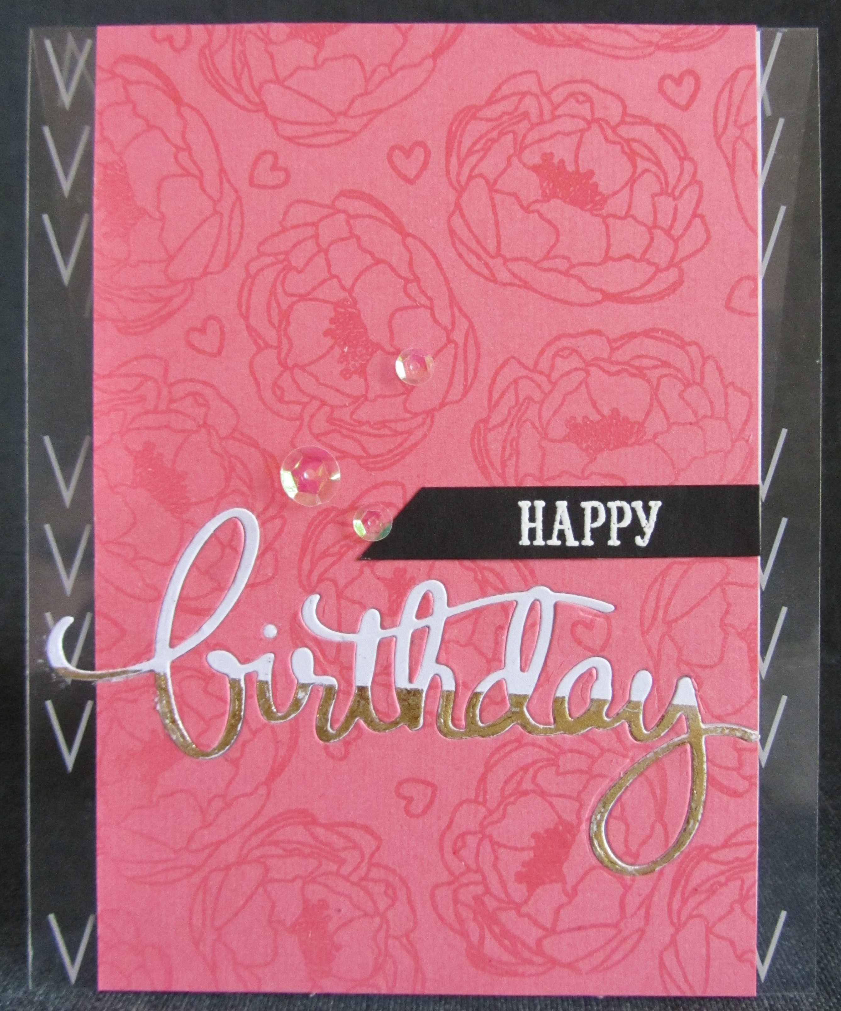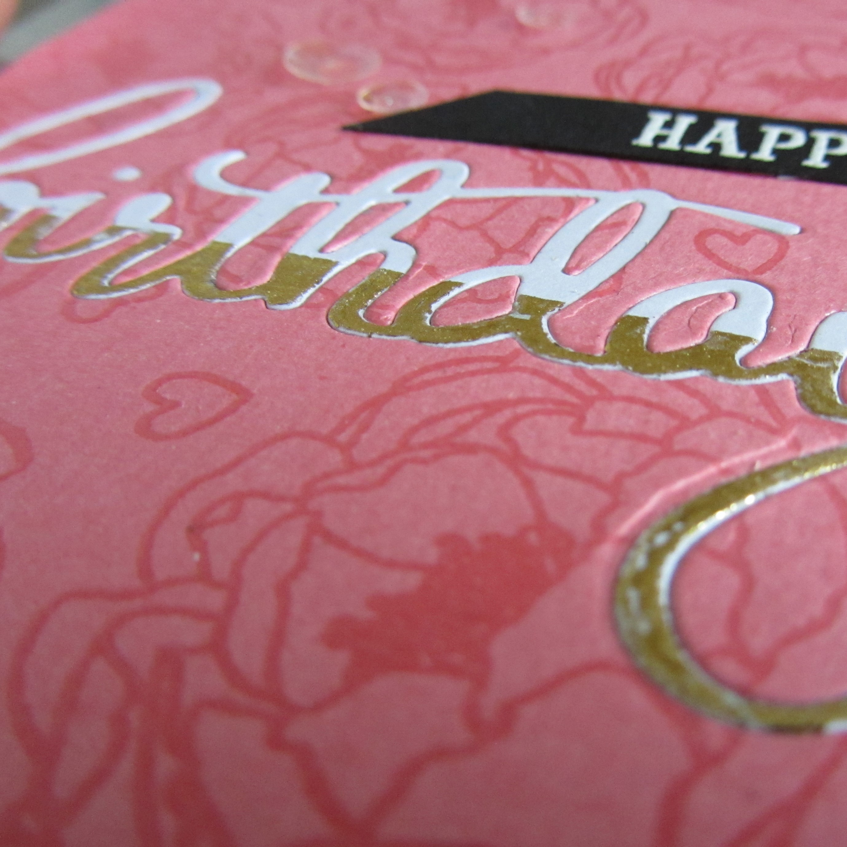 Birthday er en die fra Mama Elephant. Inden jeg skar den ud, satte jeg et stykke dobbeltklæbende ark på den nederste del. Derefter skal jeg dien ud, og puttede guldfarvet folie fra Decofoil ovenpå.