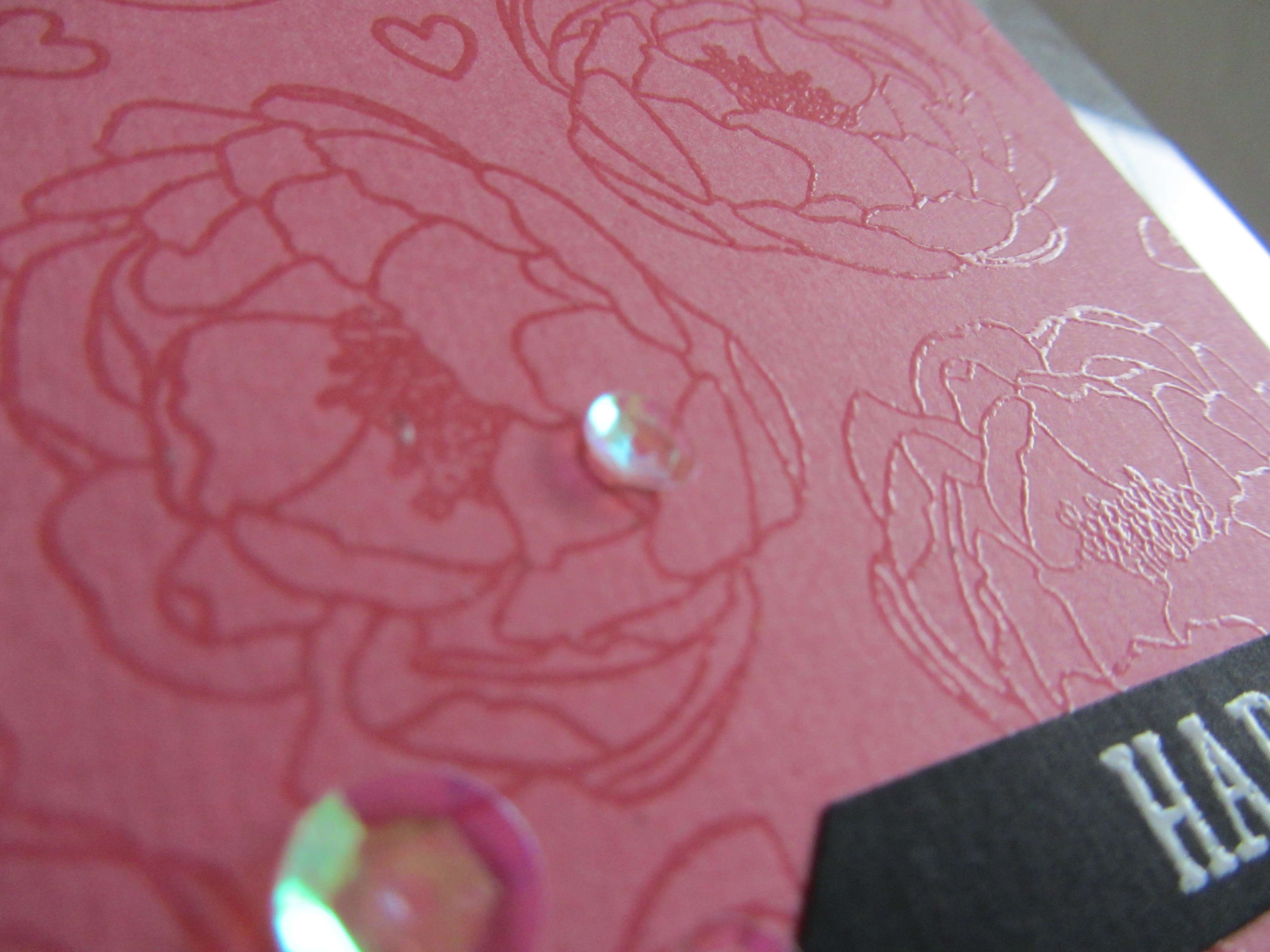 Kortbasen er et stykke acetate (plastik) med hvide "pile". Til forsiden har jeg brugt et stykke lyserødt karton. På det har jeg med Versamark stemplet en blomst fra Concord and 9th's Shine Brighter stempelsæt. Jeg har herefter embosset blomsterne med et embossingpulver i Clear. På den måde matcher blomsterne kartonet, da de kun giver en mørkere tone. De små hjerter er lavet med samme fremgangsmåde. De stammer fra Mama Elephants Lunar Animals sæt.