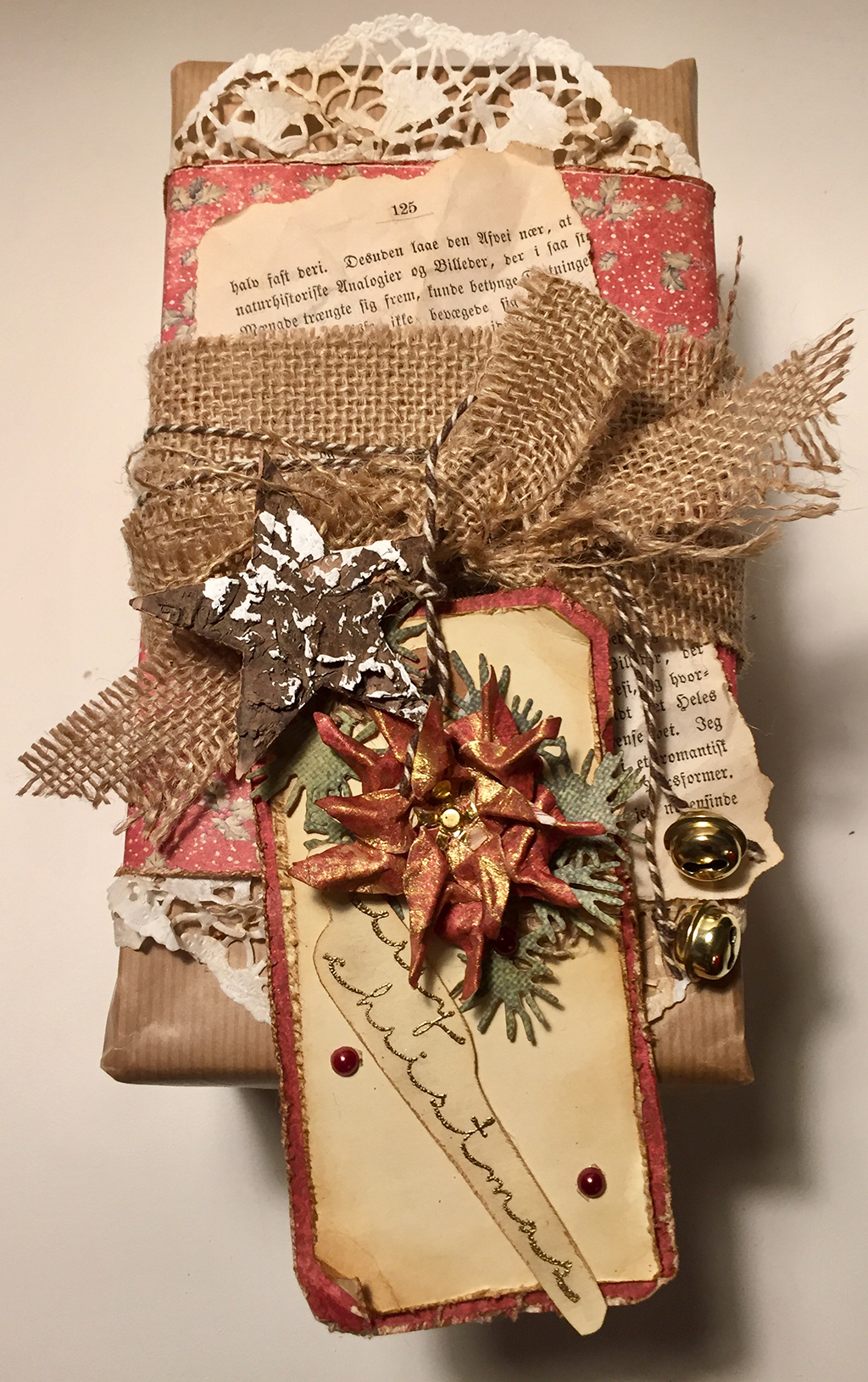 Derefter en krøllet og sværtet kageserviet/dolie i toppen og bunden af et stykke Maja Design julepapir.
