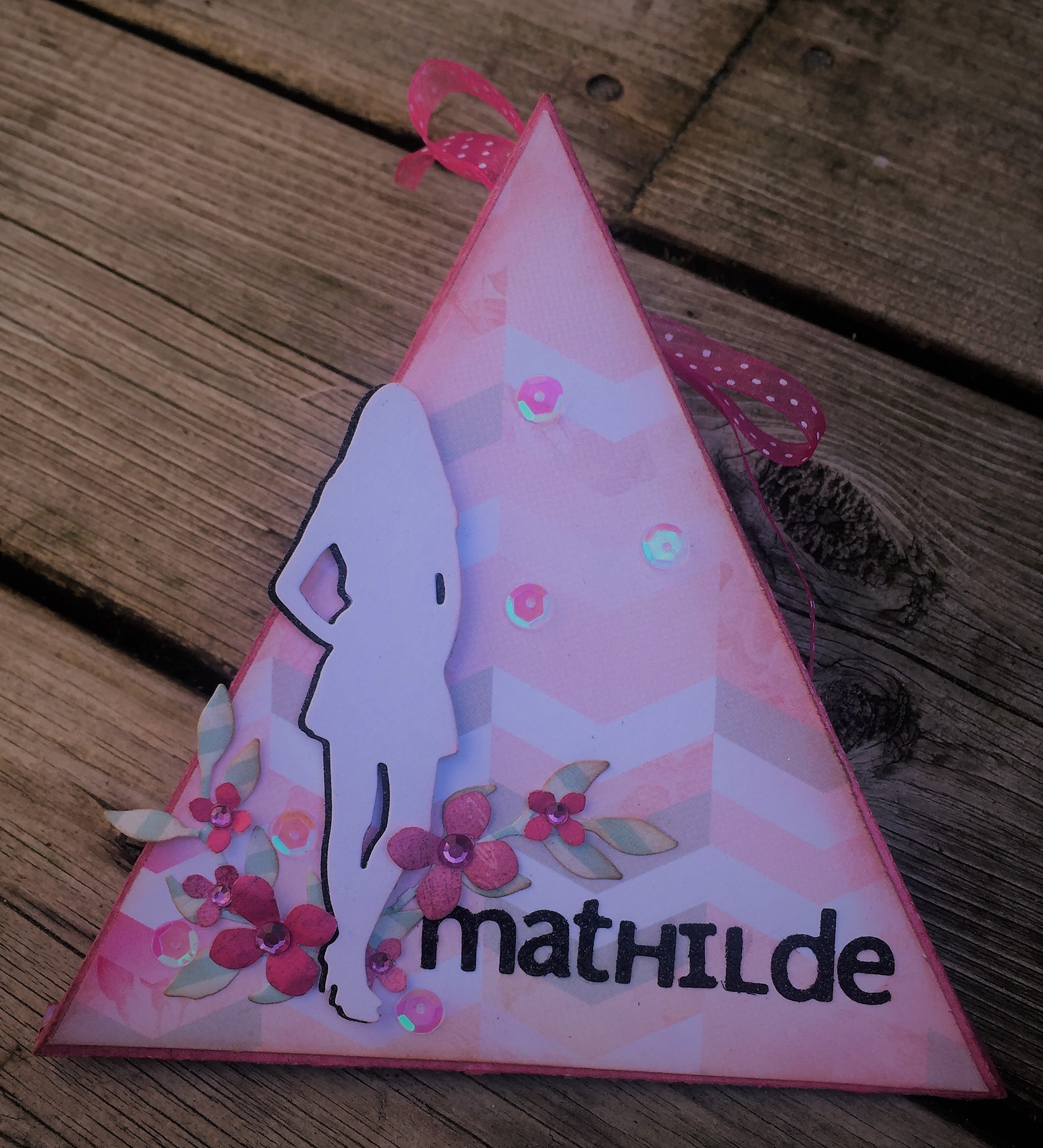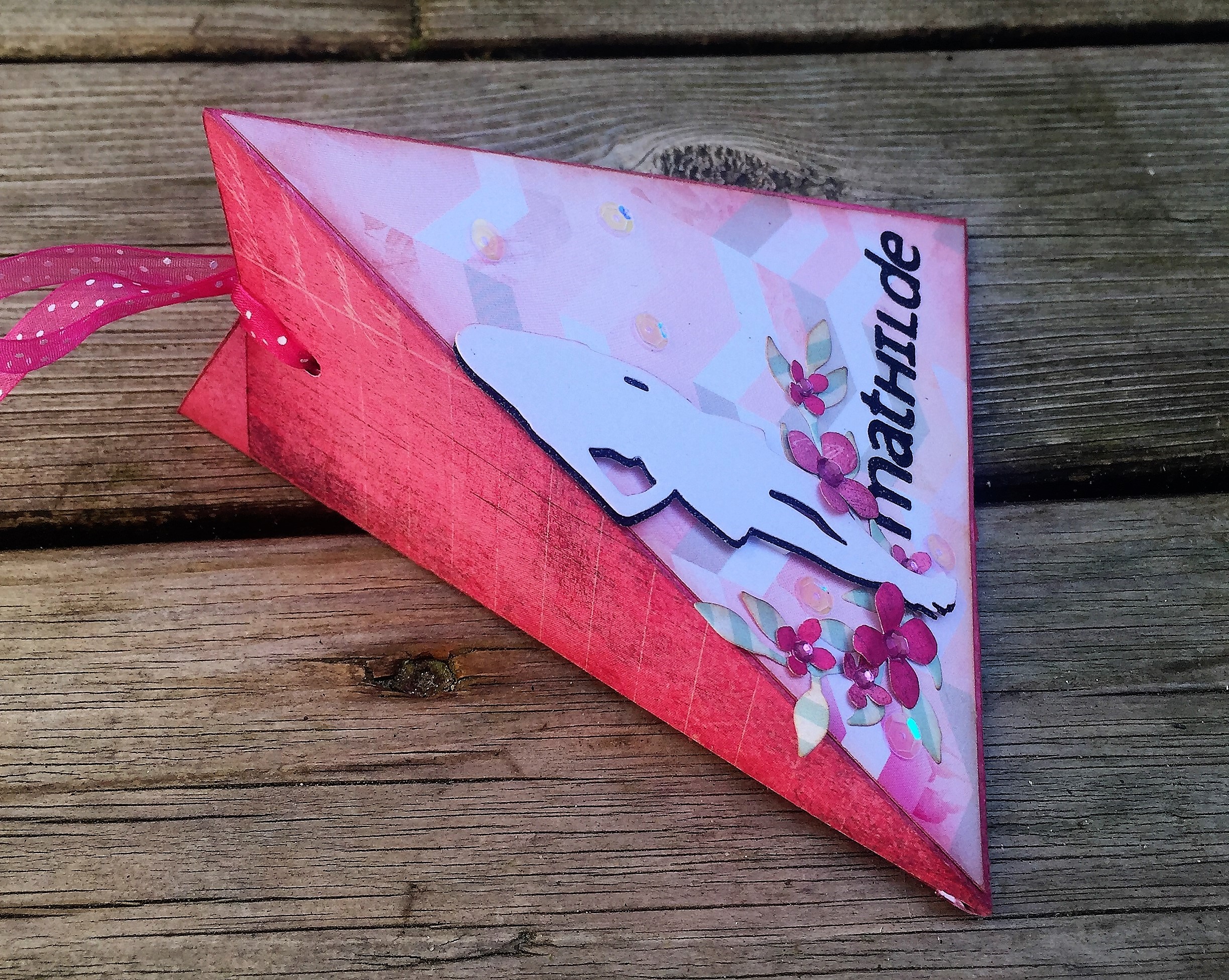 Første æske i pink/lyserød til pigekonfirmanten og pyntet med små blomster, palietter og lidt bling.