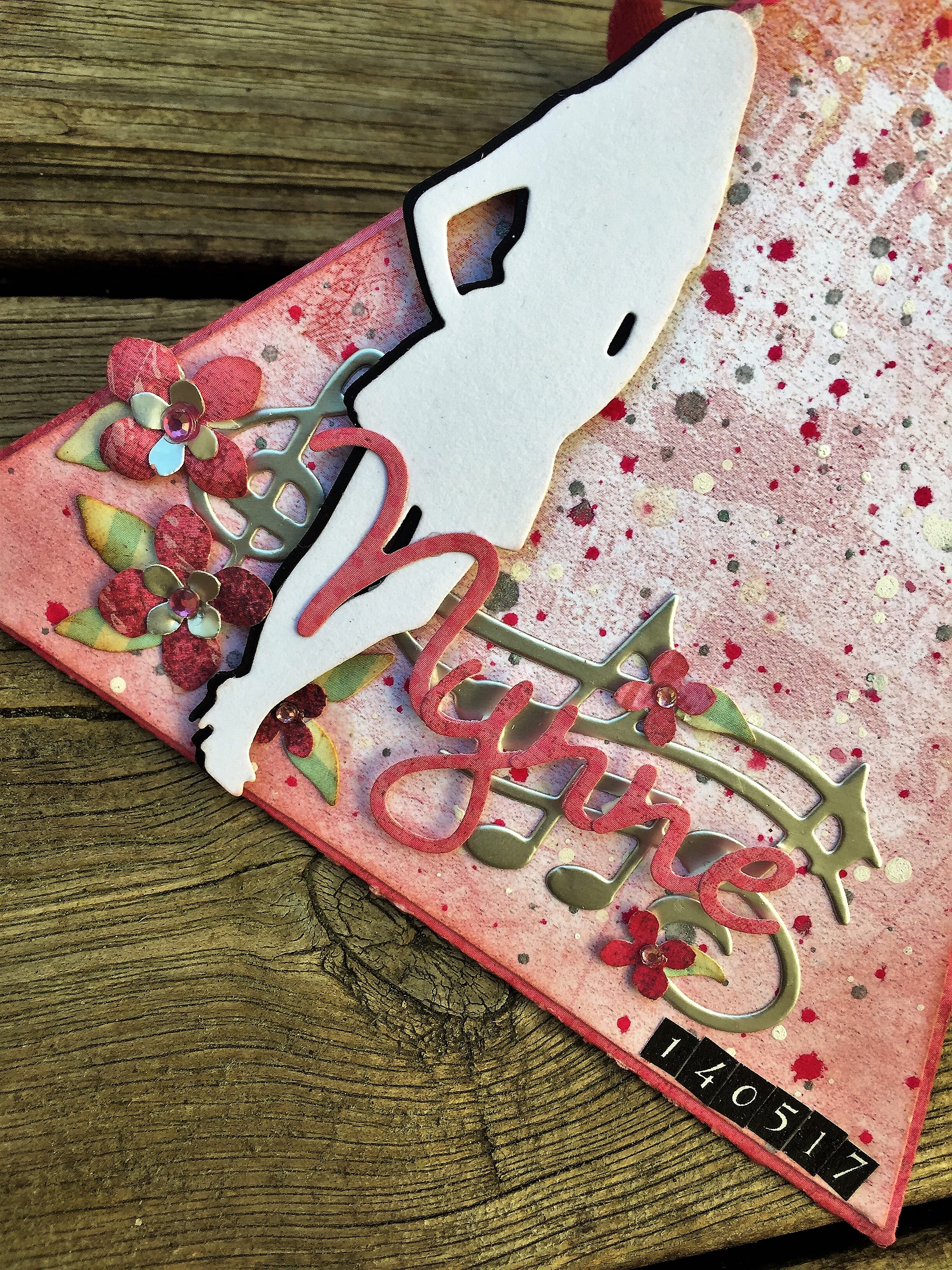 Derfor har jeg valgt at pynte med noder, lidt blomster og papiret har fået en masse splatter i sølv, hvis og pink.