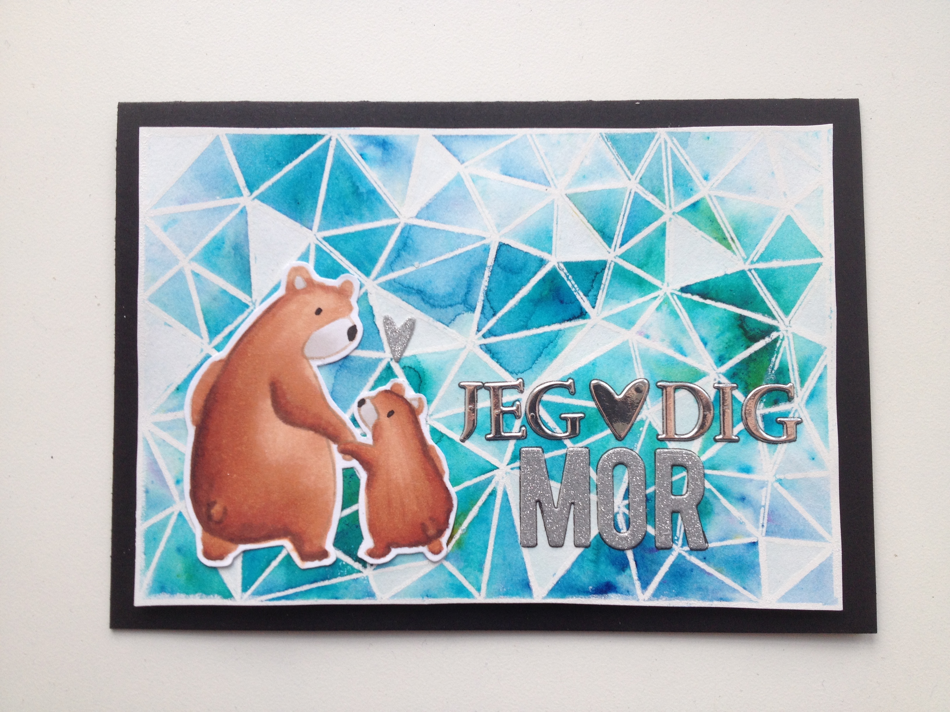 Til motivet på kortet har jeg brugt et Mama Elephant stempel, bear hugs, som jeg har farvelagt med copic.