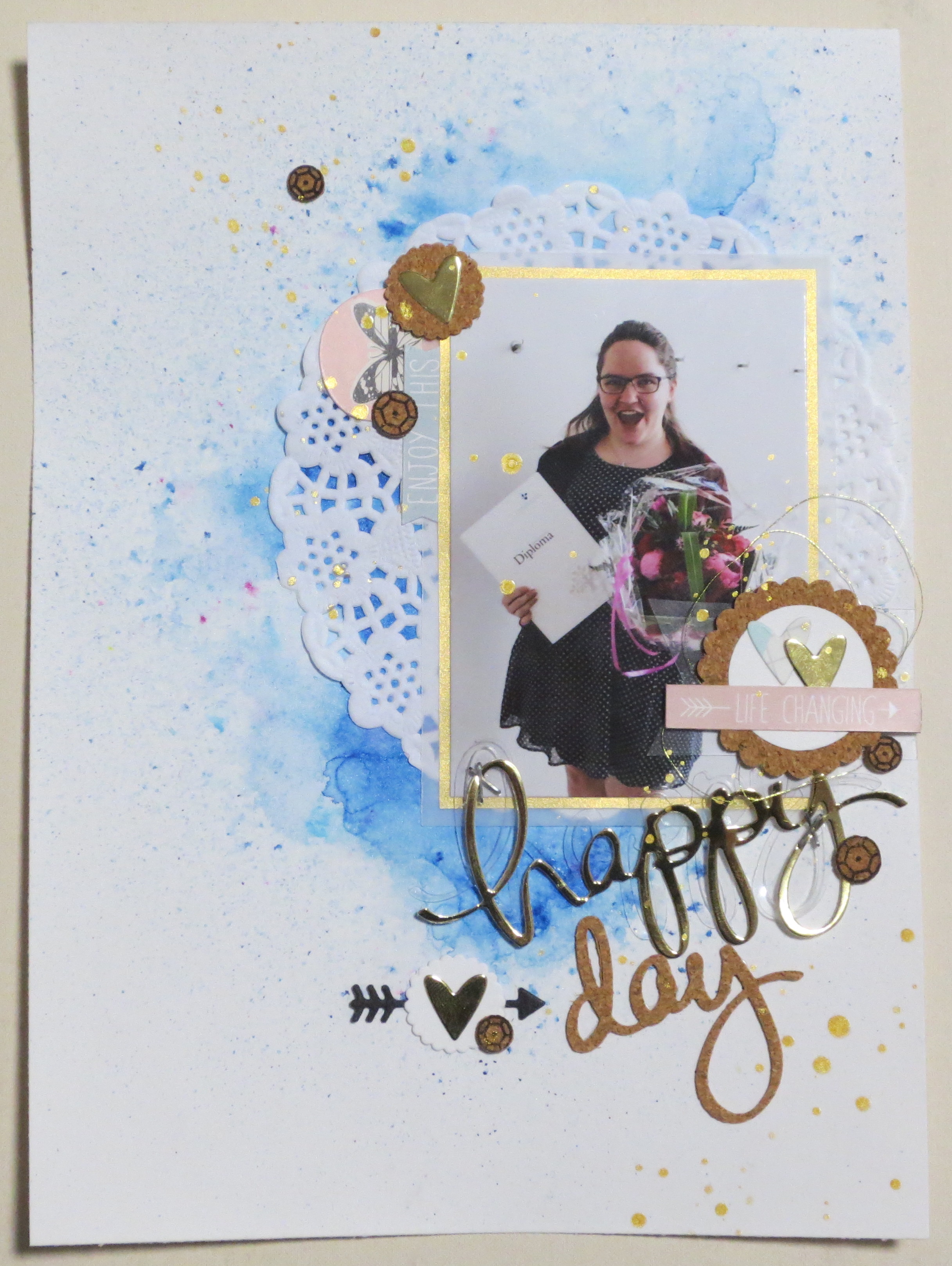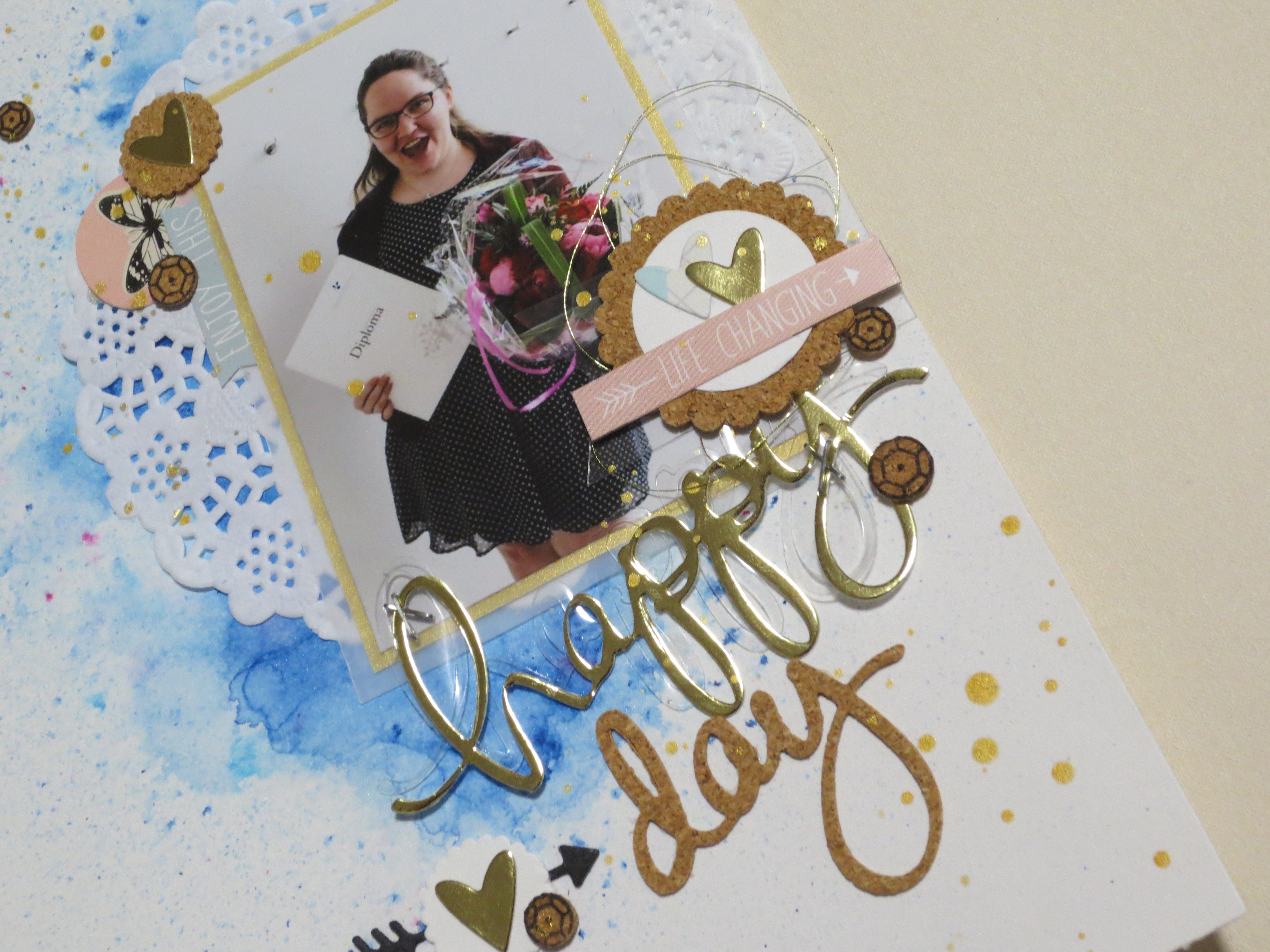 Min titel består af forskellige die-cuts fra Mama Elephants scripty dies, nemlig happy og birthday. Jeg har skåret happy ud af guld karton og acetate, mens jeg klippede et stykke kork ud og nøjedes med at skære day ud fra birthday.