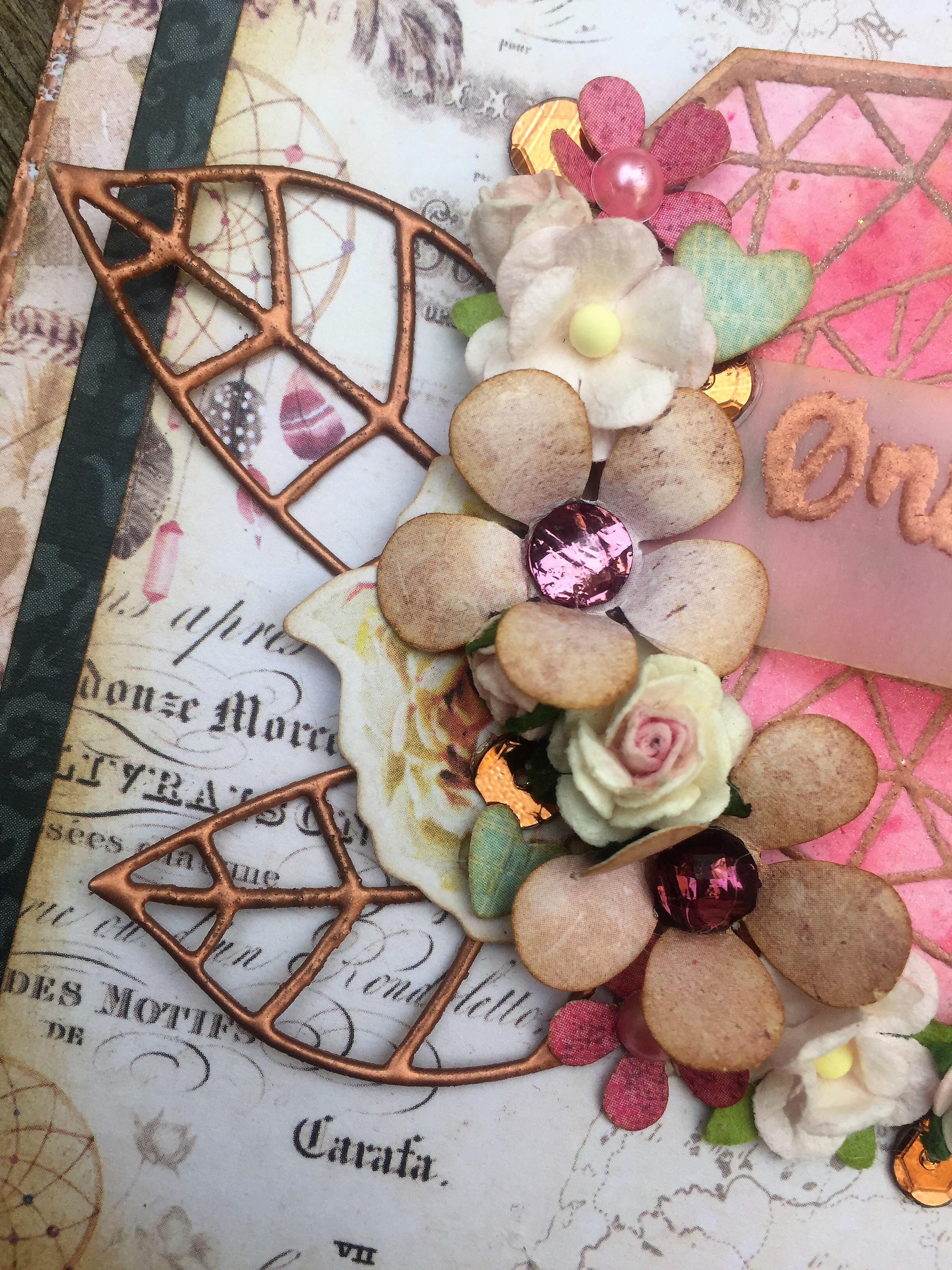 Pynten består af de lækre blade, som også er embosset med kobber, et hav af forskellige blomster fyldt med perler, rhimsten og palietter.