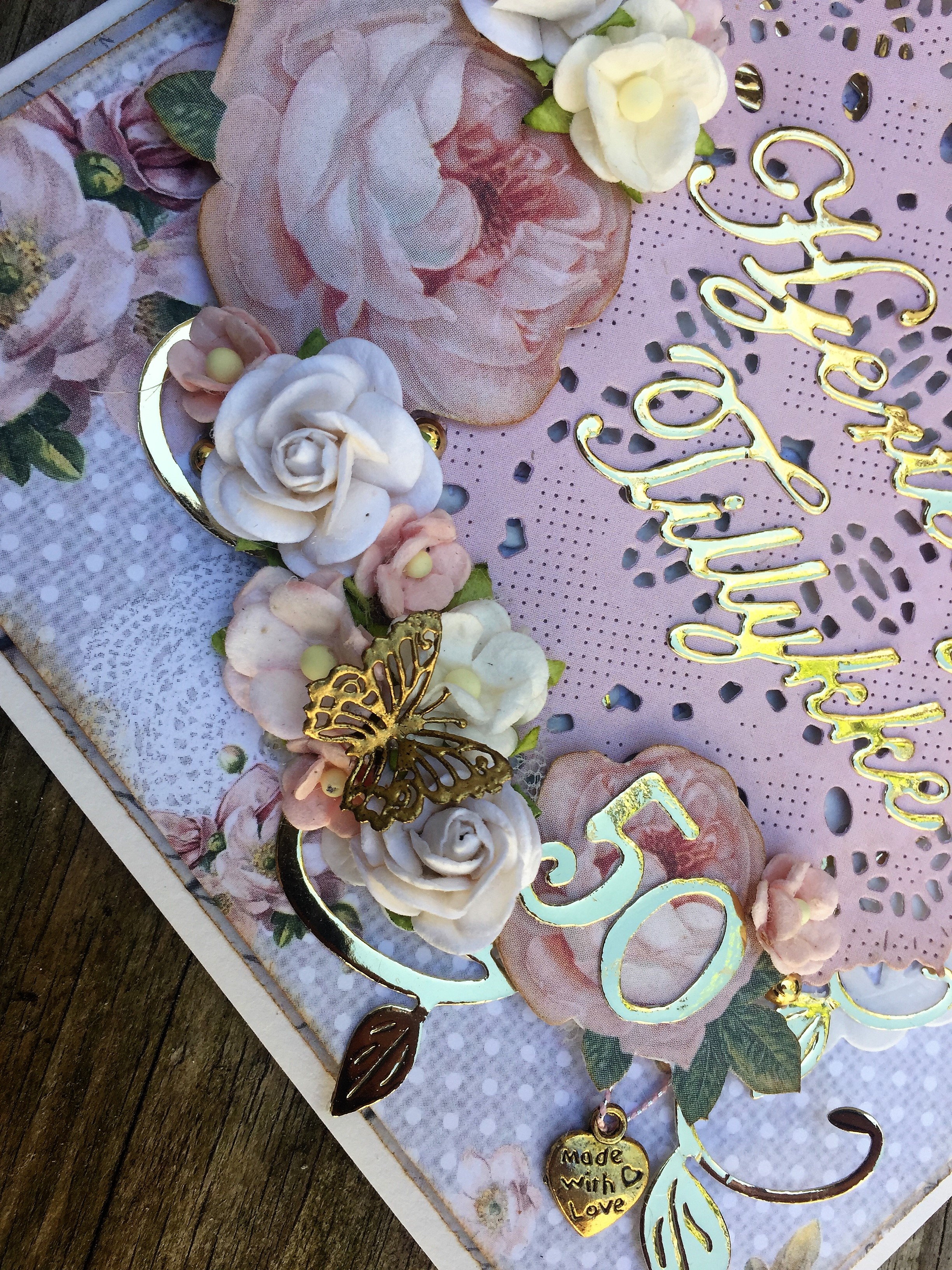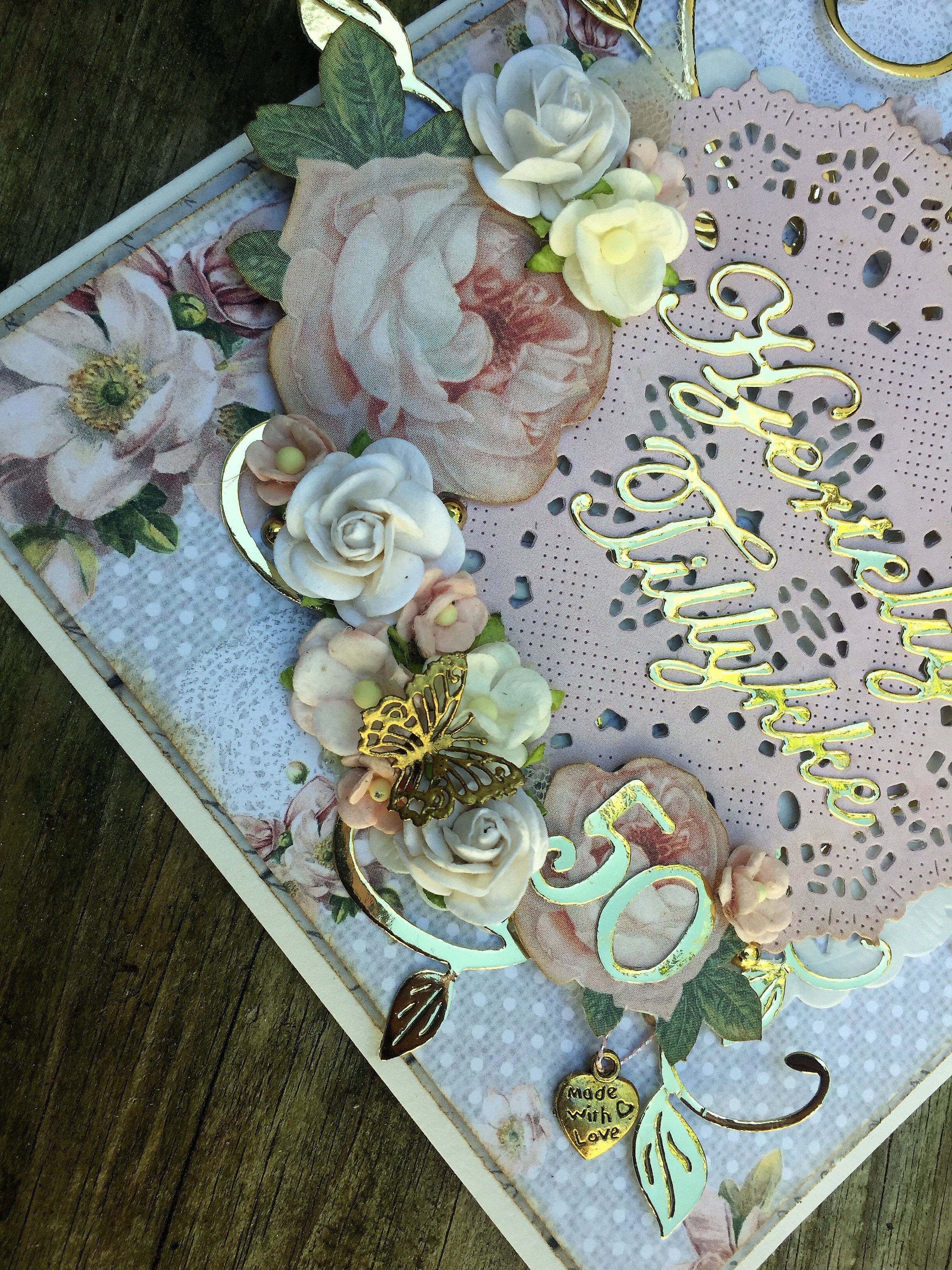 Kortet er pyntet med blomster i hvide og sart lyserøde sammen med en masse lækre gulddetaljer.