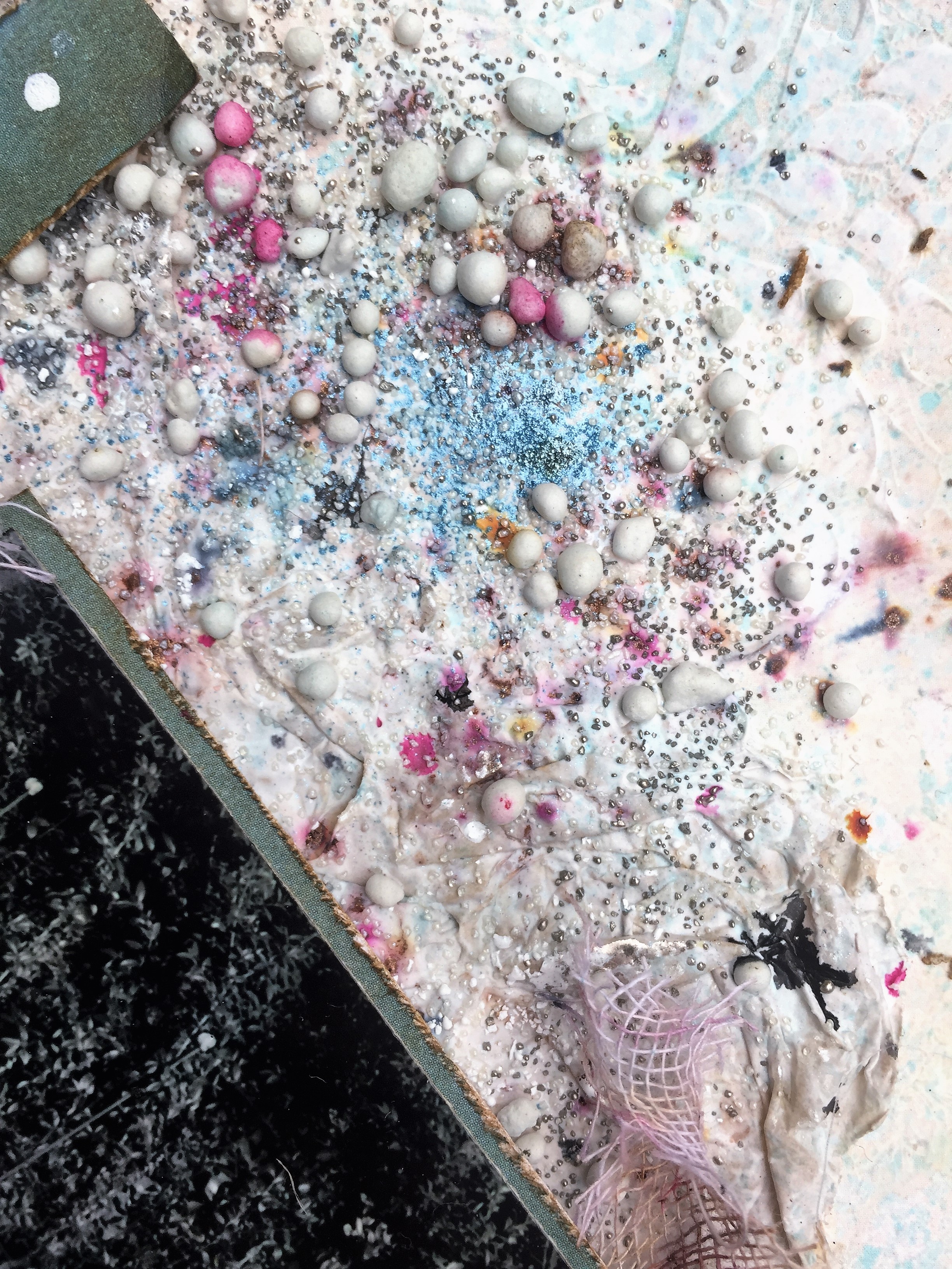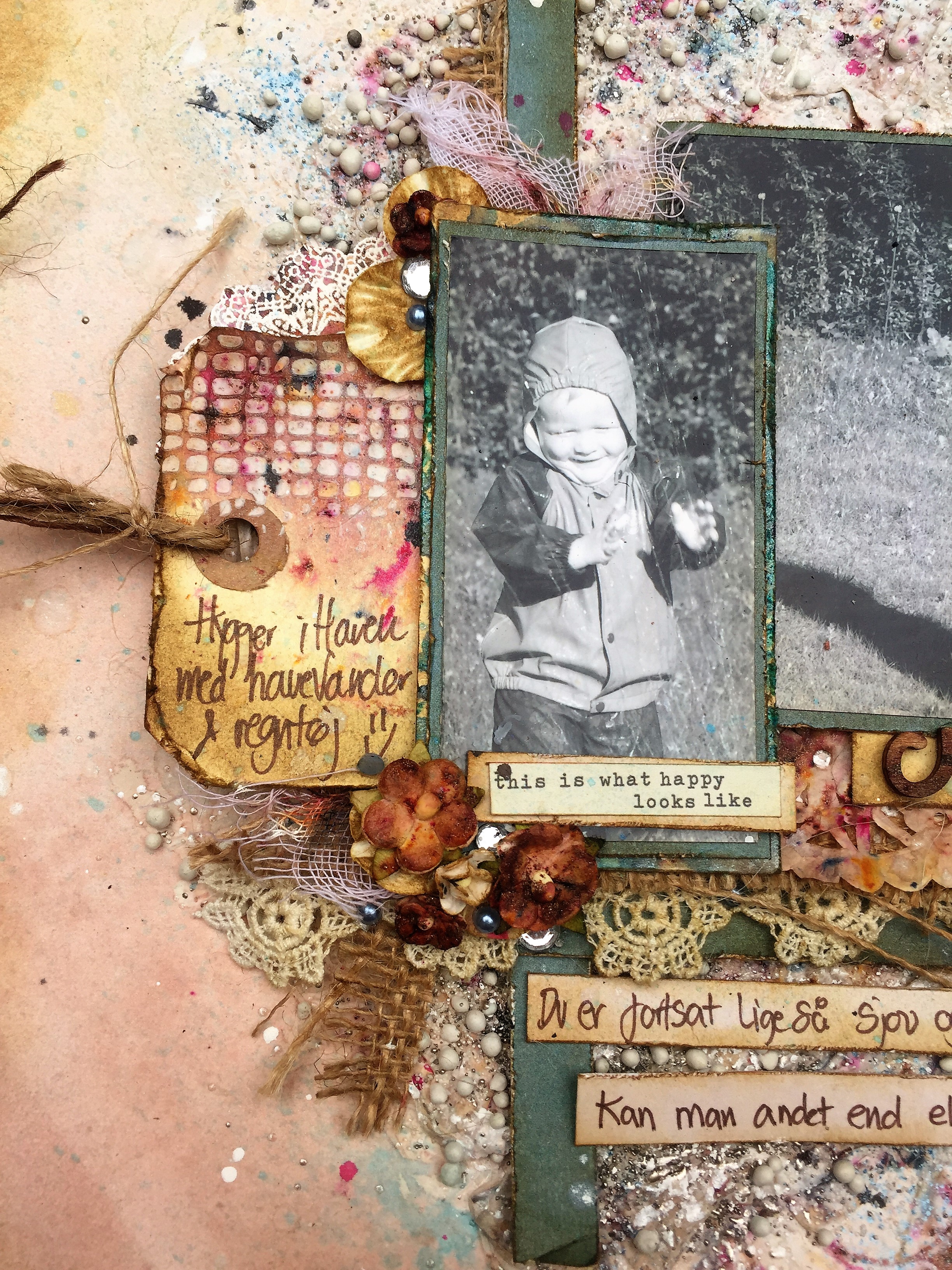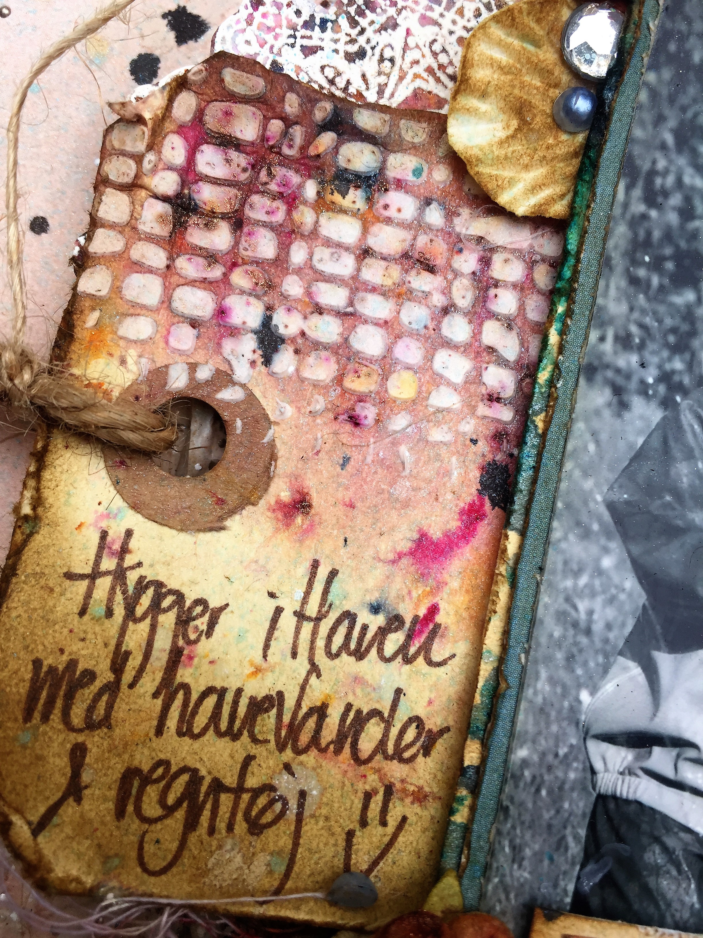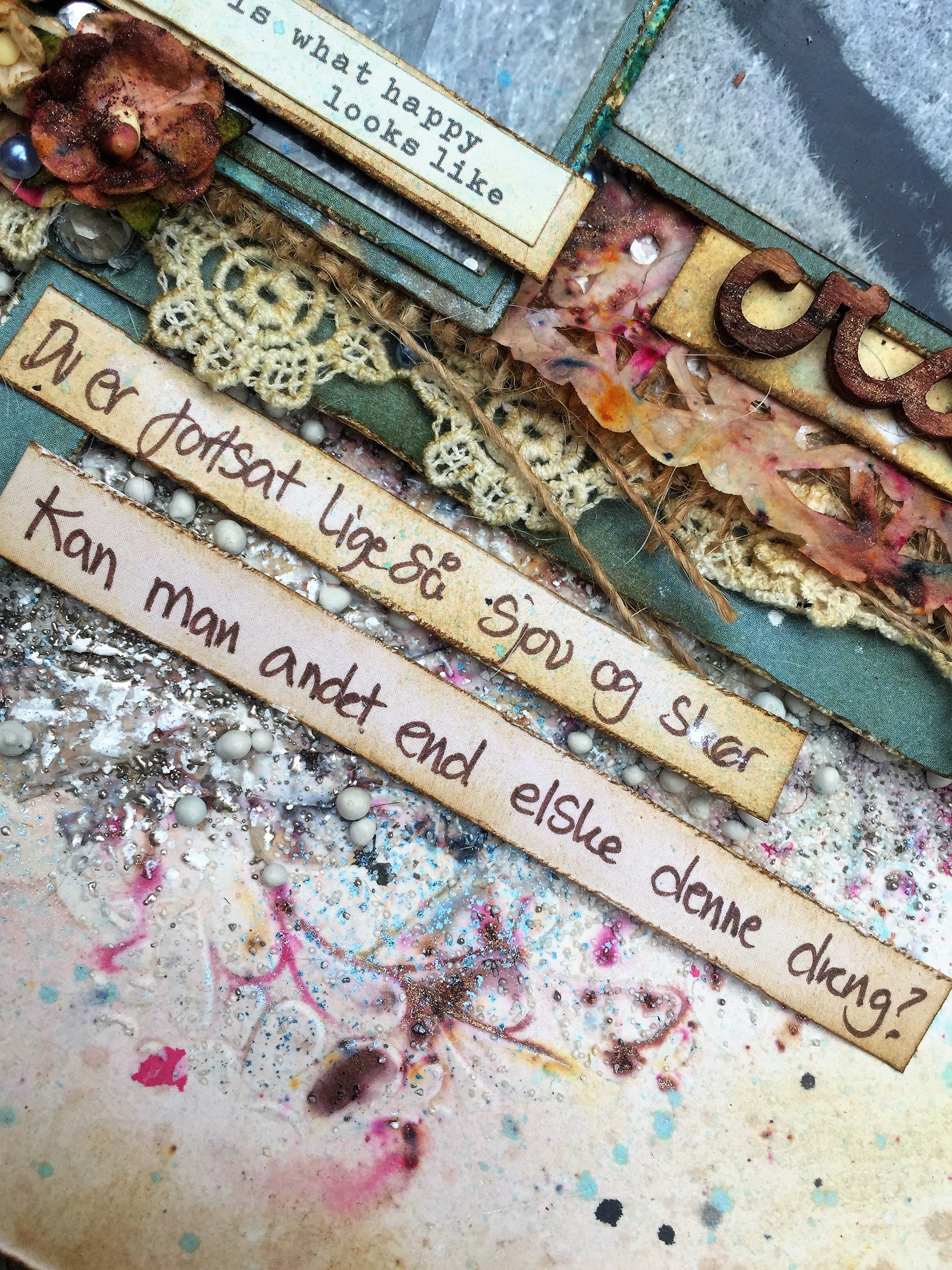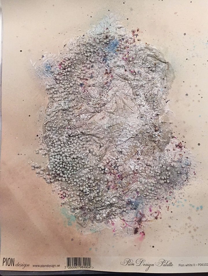 Baggrunden er et stykke råhvid mønsterpapir fra Pion design, hvor jeg har "pyntet" midten med et stykke krøllet silkepapir, masser af modelingpaste/gesso, Små 3-D balls, Lindys shaker i brun, pigment powder i blå, brune & blå glimmermist og UTEE i sølv, pearl og hvid.