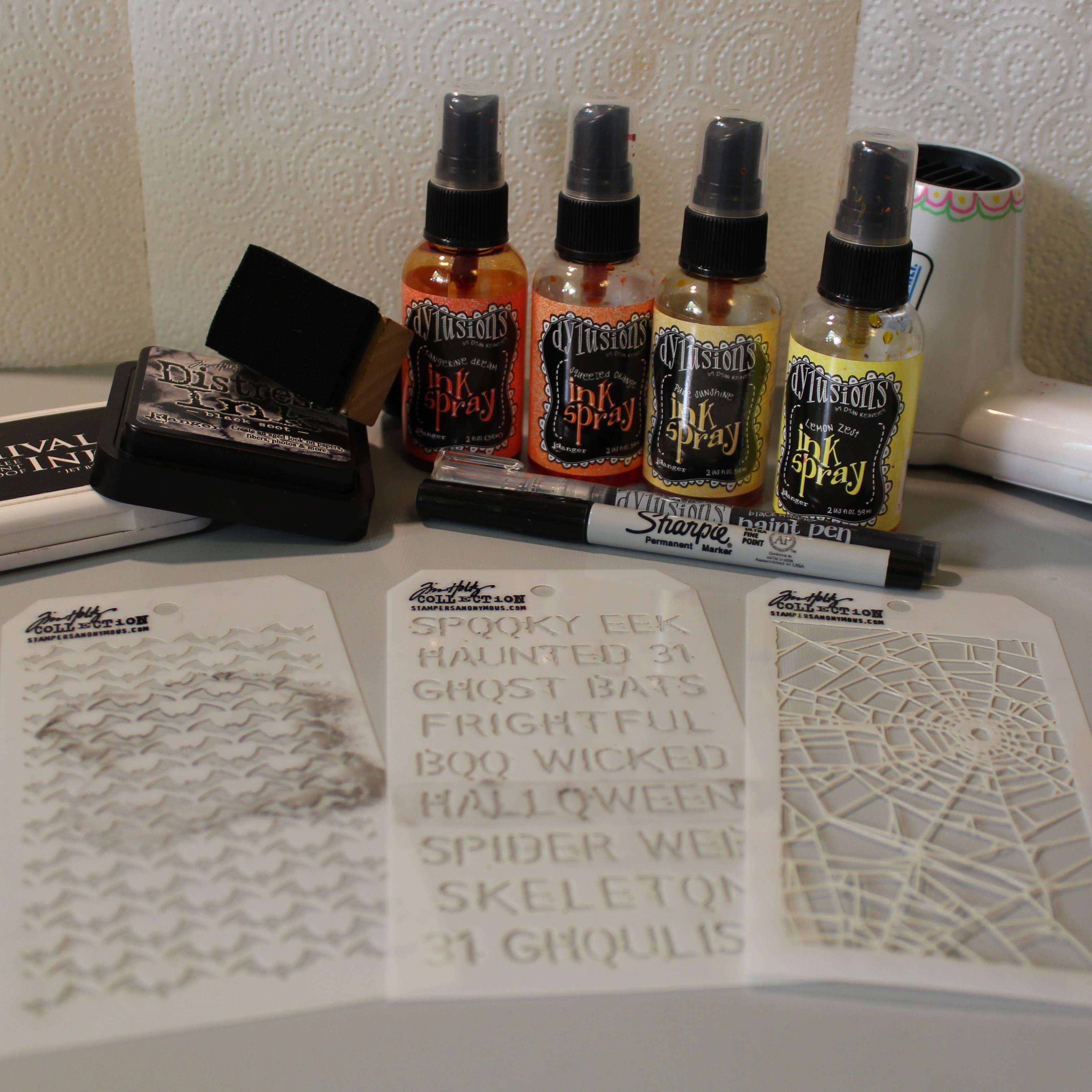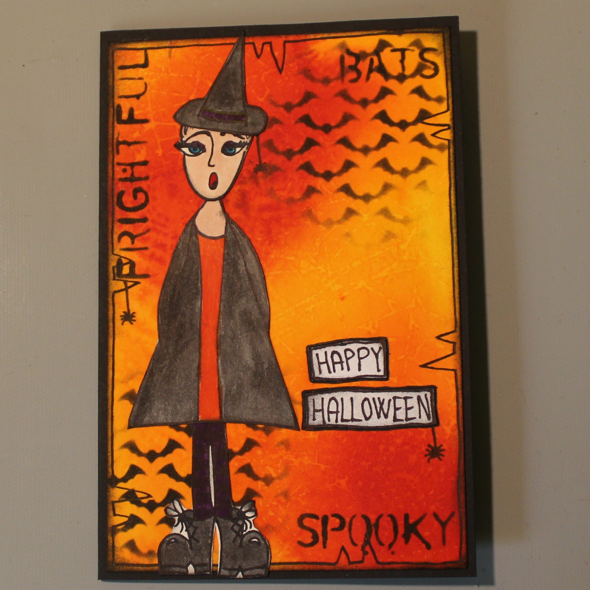 Heksens hoved, ben og sko er et stempel fra Dylusions. Resten er tegnet med en sharpie. Hun er farvelagt med Dylusions ink, der er fyldt over i vandpensler. "Happy halloween" og edderkopperne er også tegnet med en sharpie.