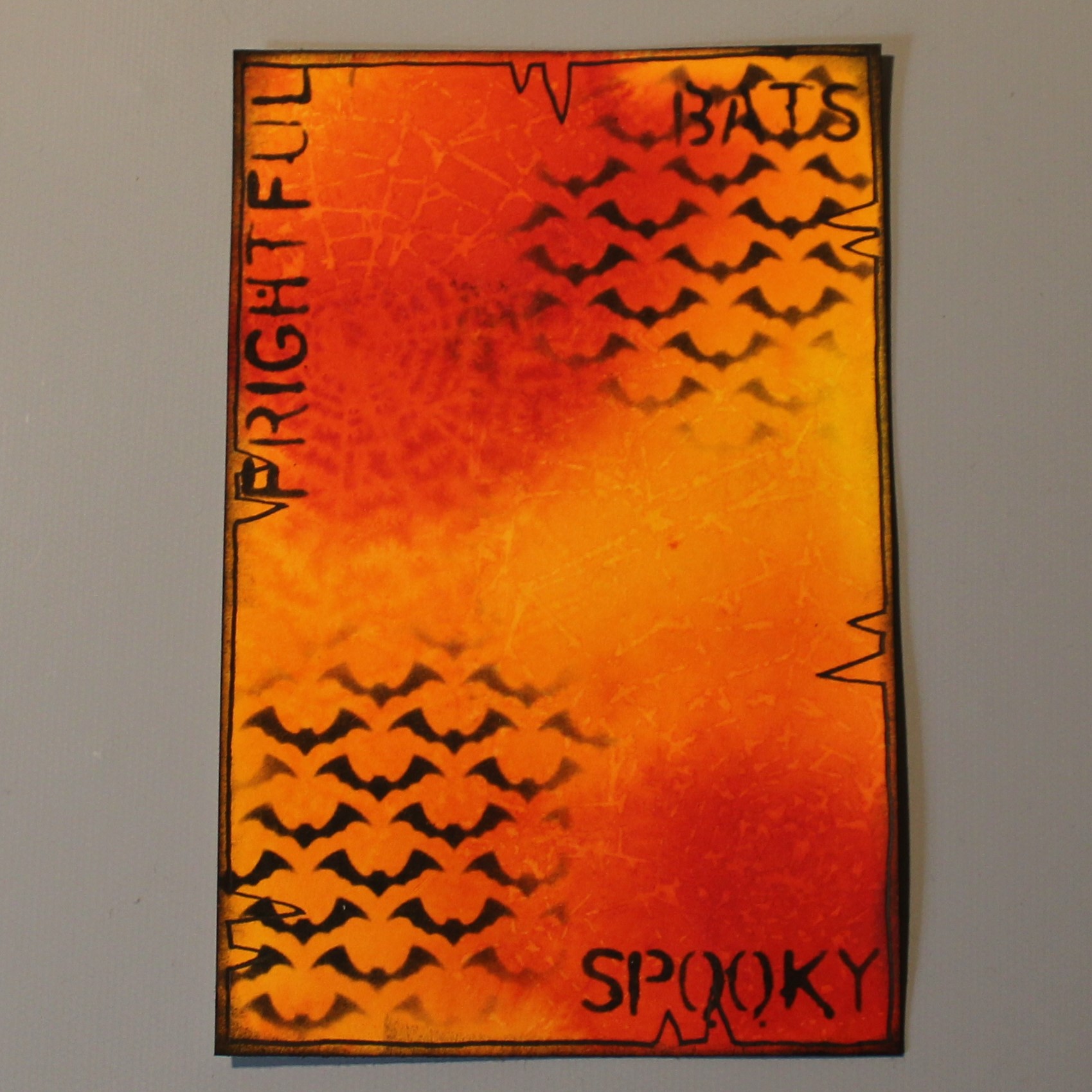 For at lave baggrunden har jeg sprayet lidt vand på mit karton efterfulgt af de 4 farver jeg havde valgt. Derefter tørrede jeg det med min køkkenrulle, som jeg bare ruller over mit kort (hele Rullen). Derefter gav jeg det en gang mere med mine farver og tørrede det med min varmepistol. Jeg har sprayet min spindelvævsstencil med vand, lagt den på kortet, løftet den af, ladet vandet blive i 10-15 sekunder og rullet med min køkkenrulle for at løfte farven af. teknikken kaldes ghosting og den er jeg meget stor fan af. Flagremusene og teksten er lavet med stencils fra samme sæt og distress ink. Kanten udenom er tegnet med en Dylusions paint pen.