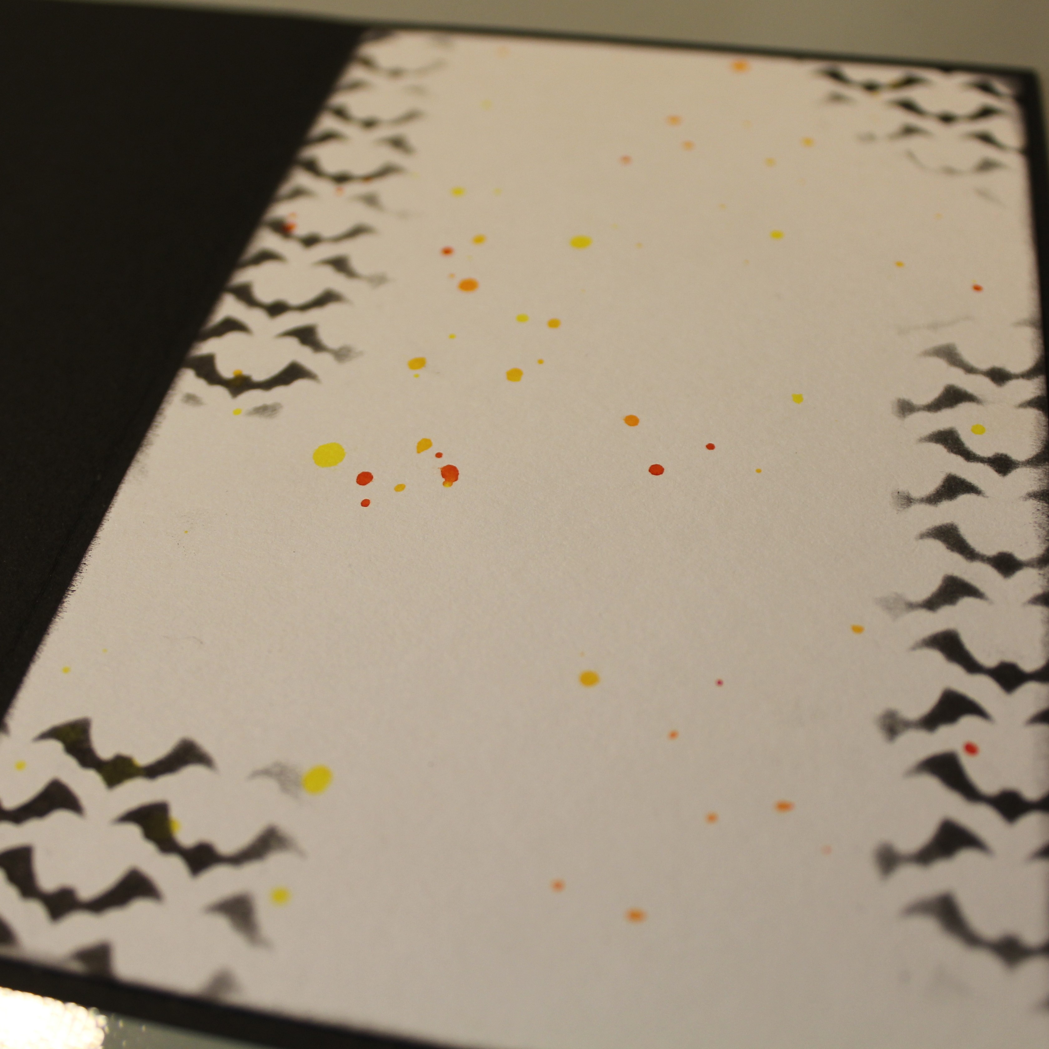 Inde i kortet har jeg holdt fast i halloweentemaet. Flagremusene er den samme stencil som udenpå. For at lave splats der passede i farverne, har jeg bare skruet toppen af mine Dylusions, og brugt dem til splats.