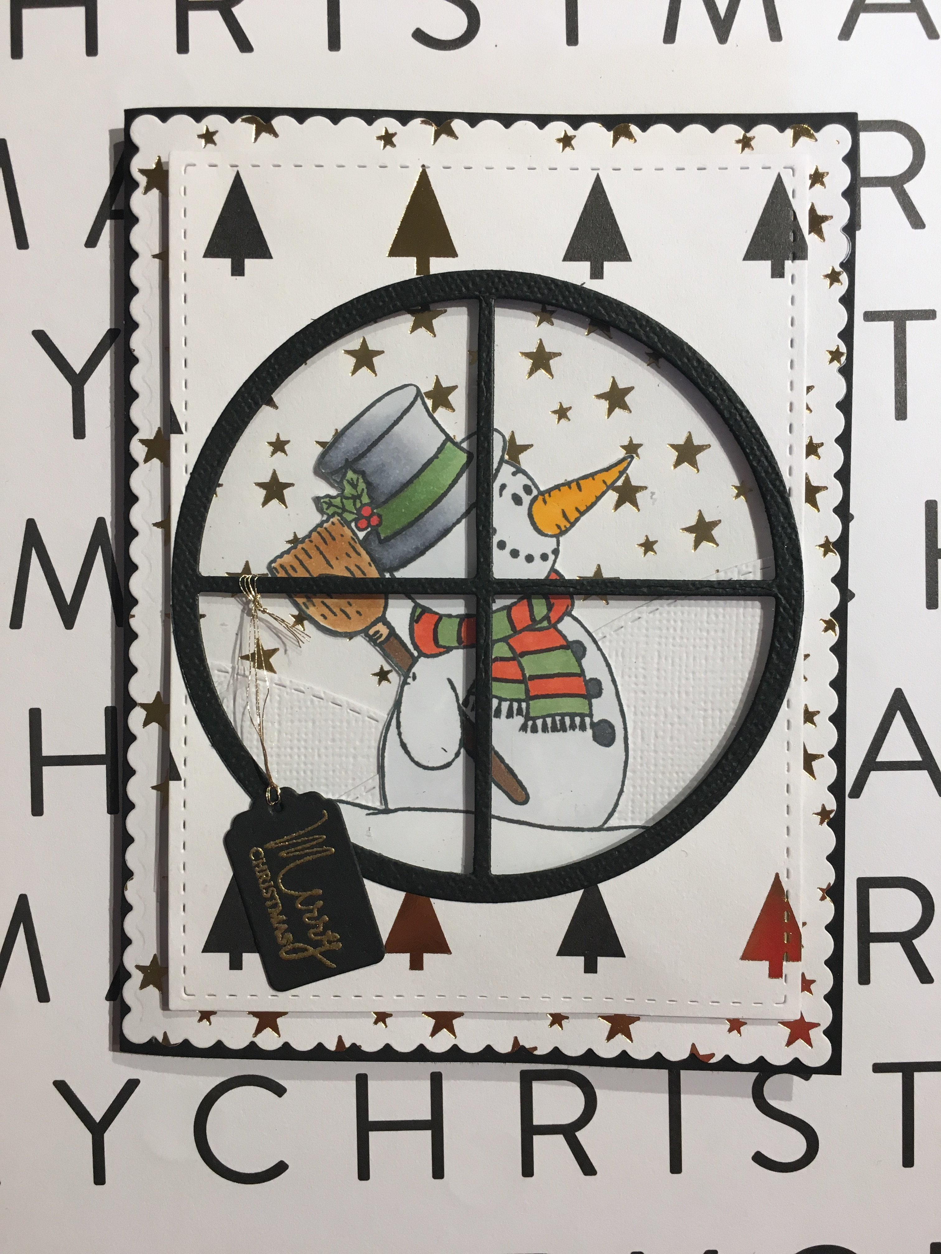 Af dies har jeg brugt Mama Elephant Basic Set – som jeg bruger konstant. I det øverste lag papir har jeg skåret en cirkel ud, hvor jeg så har placeret et rundt vindue. Jeg har i øvrigt ”tildækket” vinduet med gennemsigtig acetate for at markere ruden.