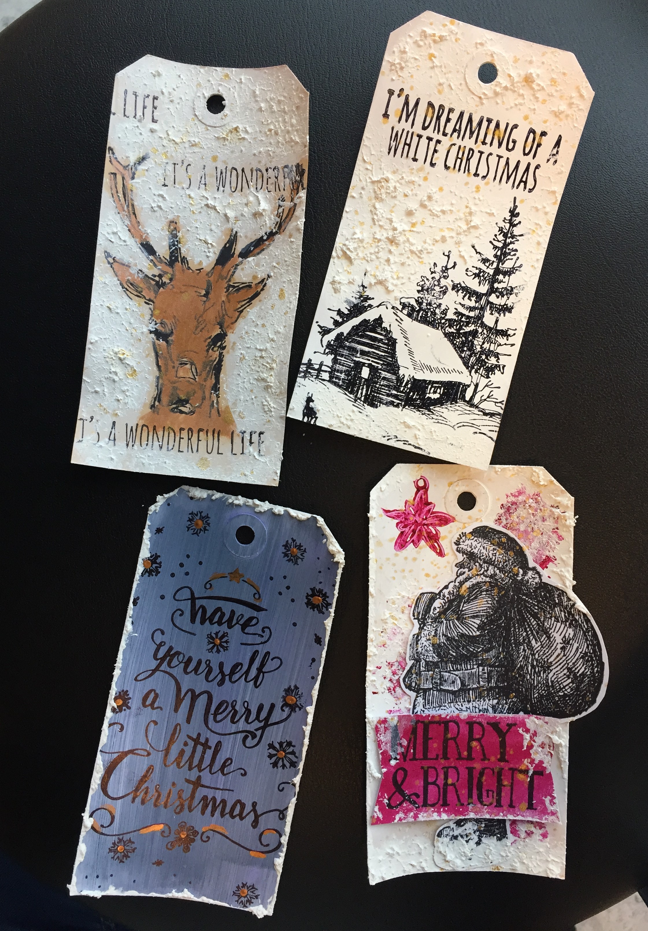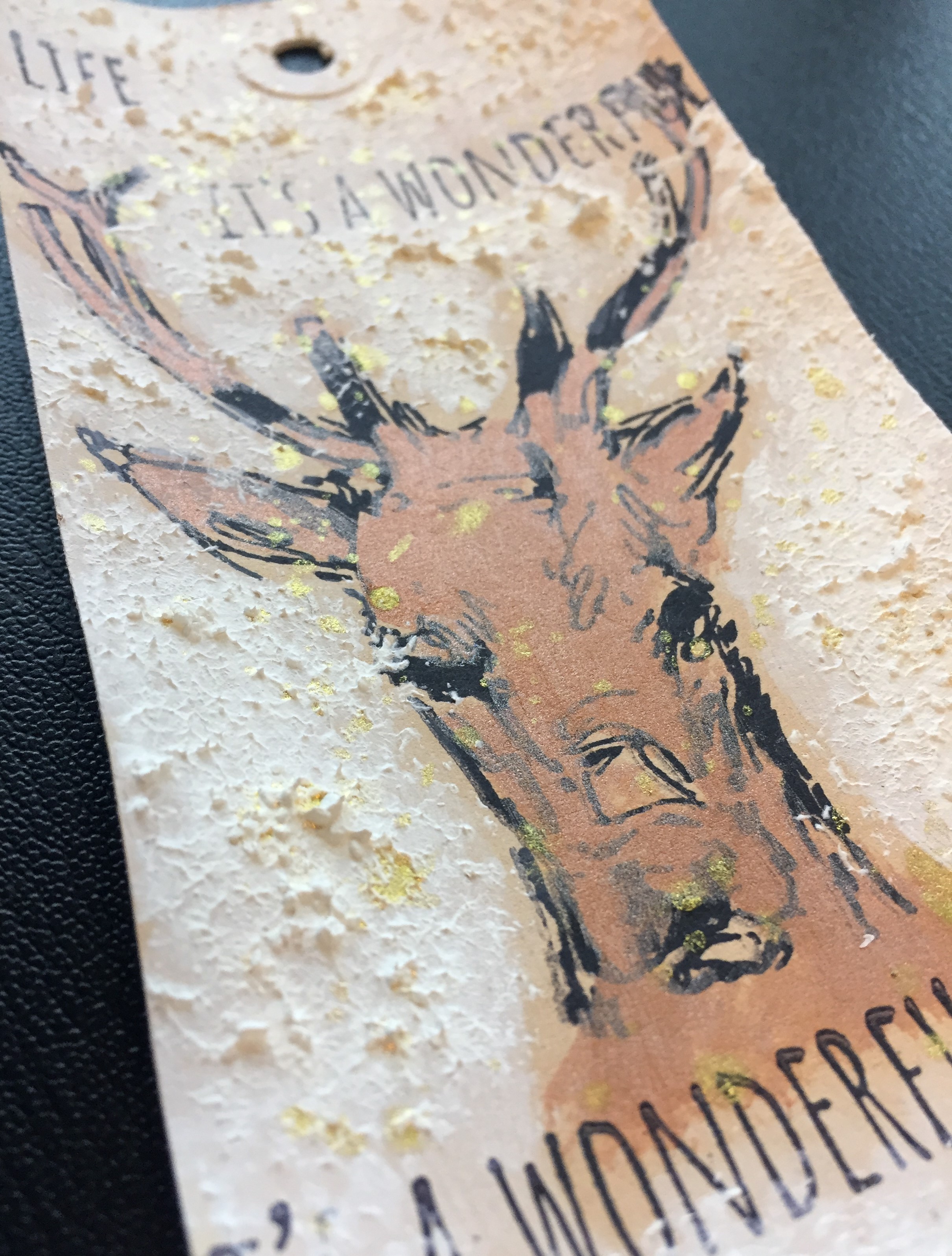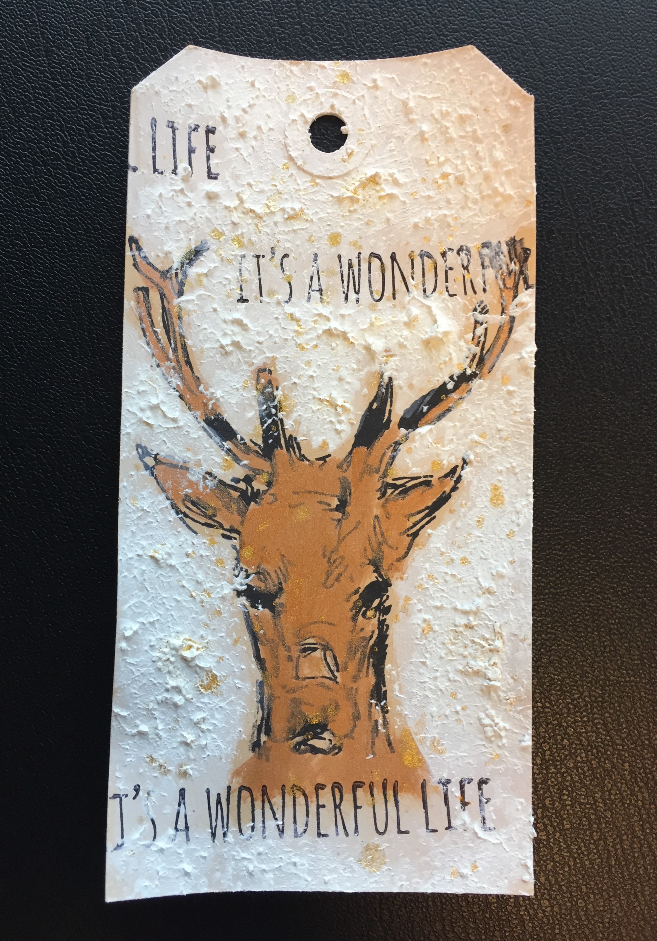 Det har jeg blandt andet gjort på tagget med hjorten, hvor ansigtet er farvelagt med fortyndet maling. Det er lavet på en base, som er farvelagt med malingen i White. Derudover har jeg dækket tagget med Snow Paste de steder, hvor jeg ikke har stemplet. Til sidst har jeg splattet med Shimmer Spritz i Gold.