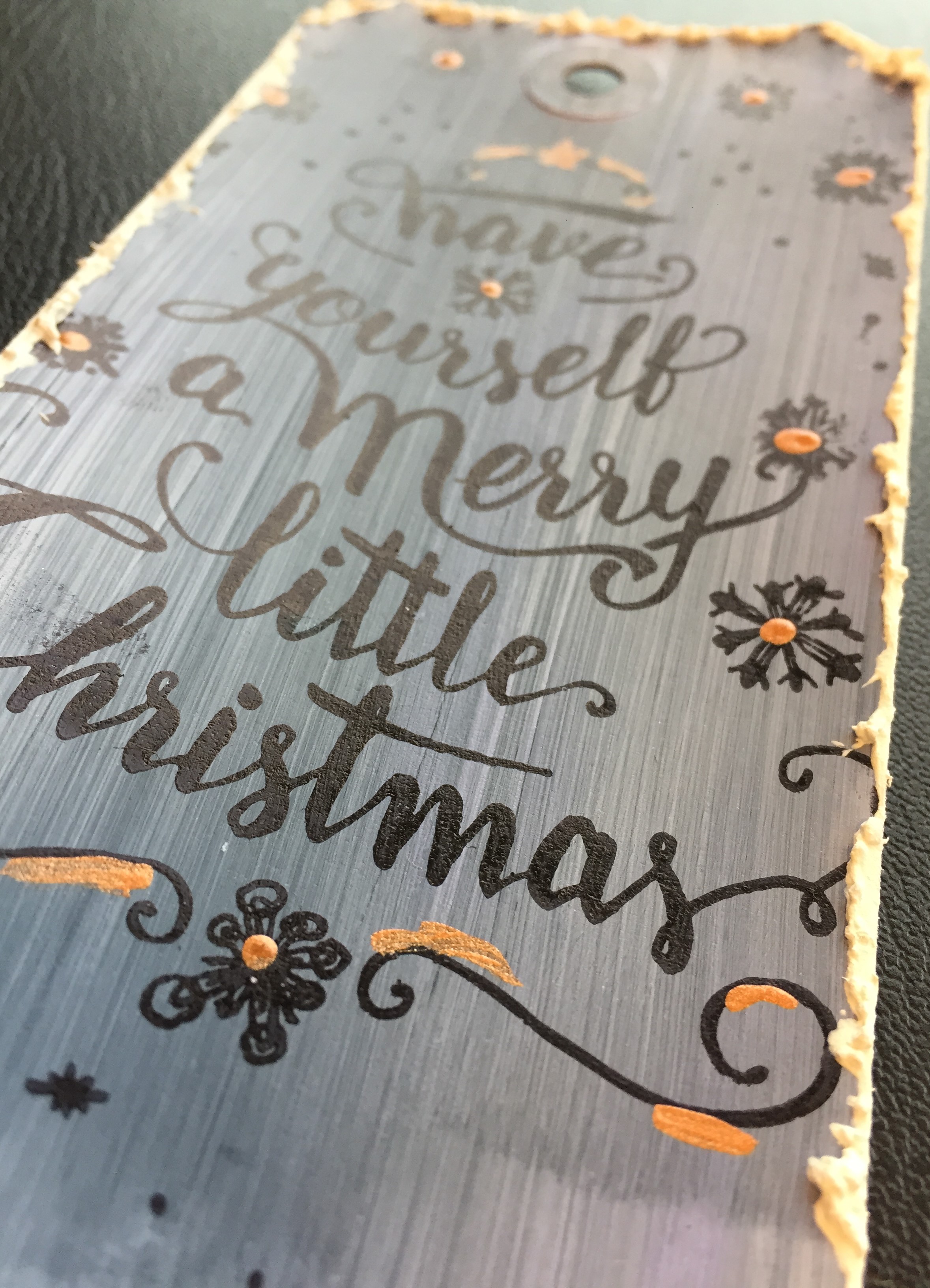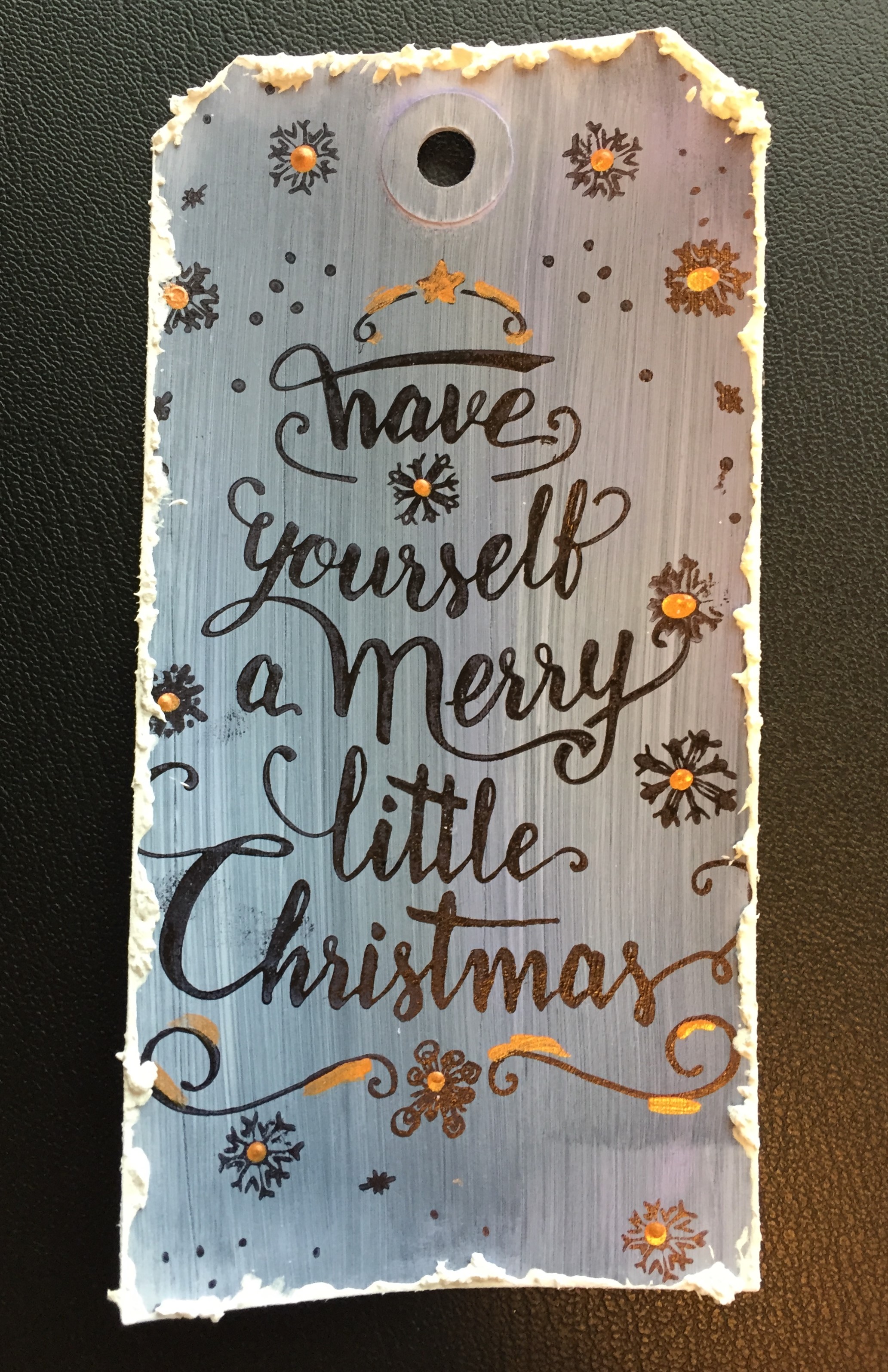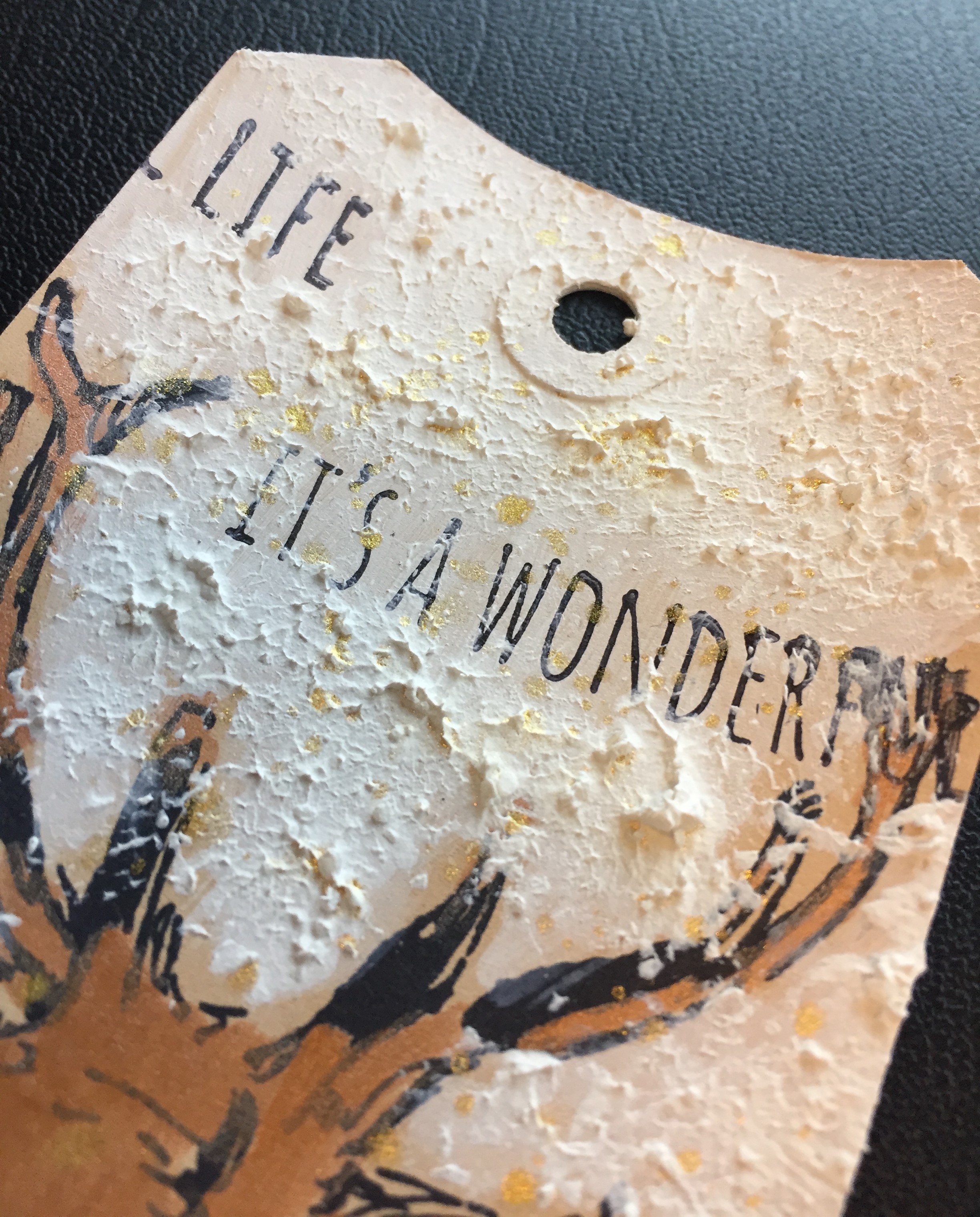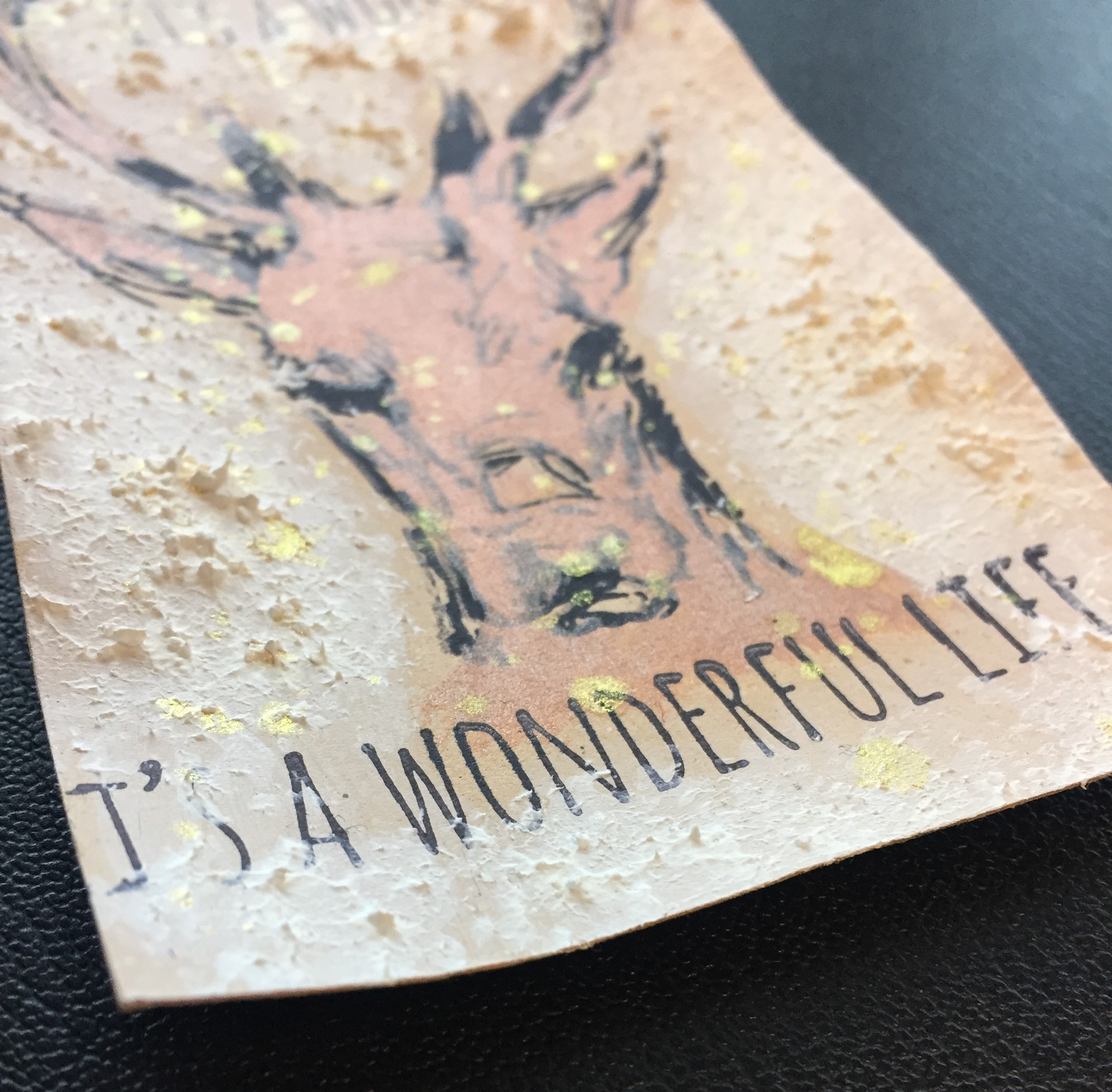 Det har jeg blandt andet gjort på tagget med hjorten, hvor ansigtet er farvelagt med fortyndet maling. Det er lavet på en base, som er farvelagt med malingen i White. Derudover har jeg dækket tagget med Snow Paste de steder, hvor jeg ikke har stemplet. Til sidst har jeg splattet med Shimmer Spritz i Gold.