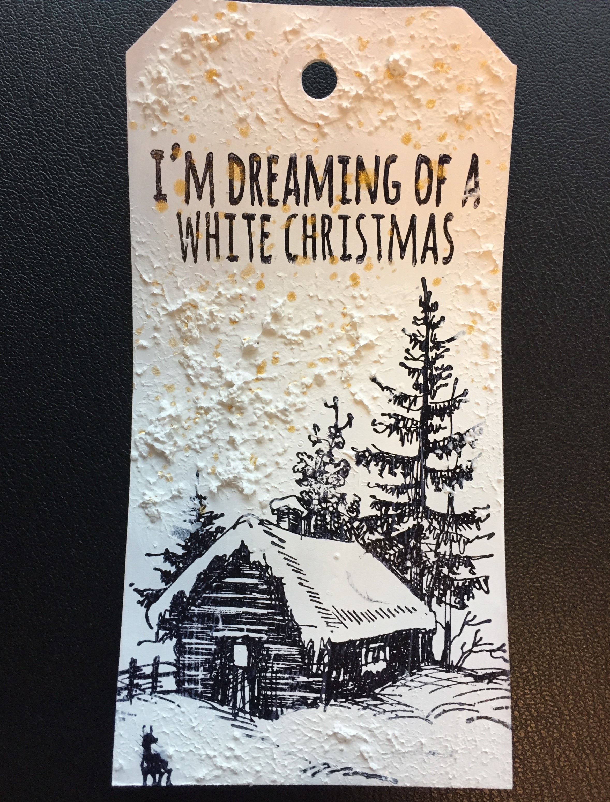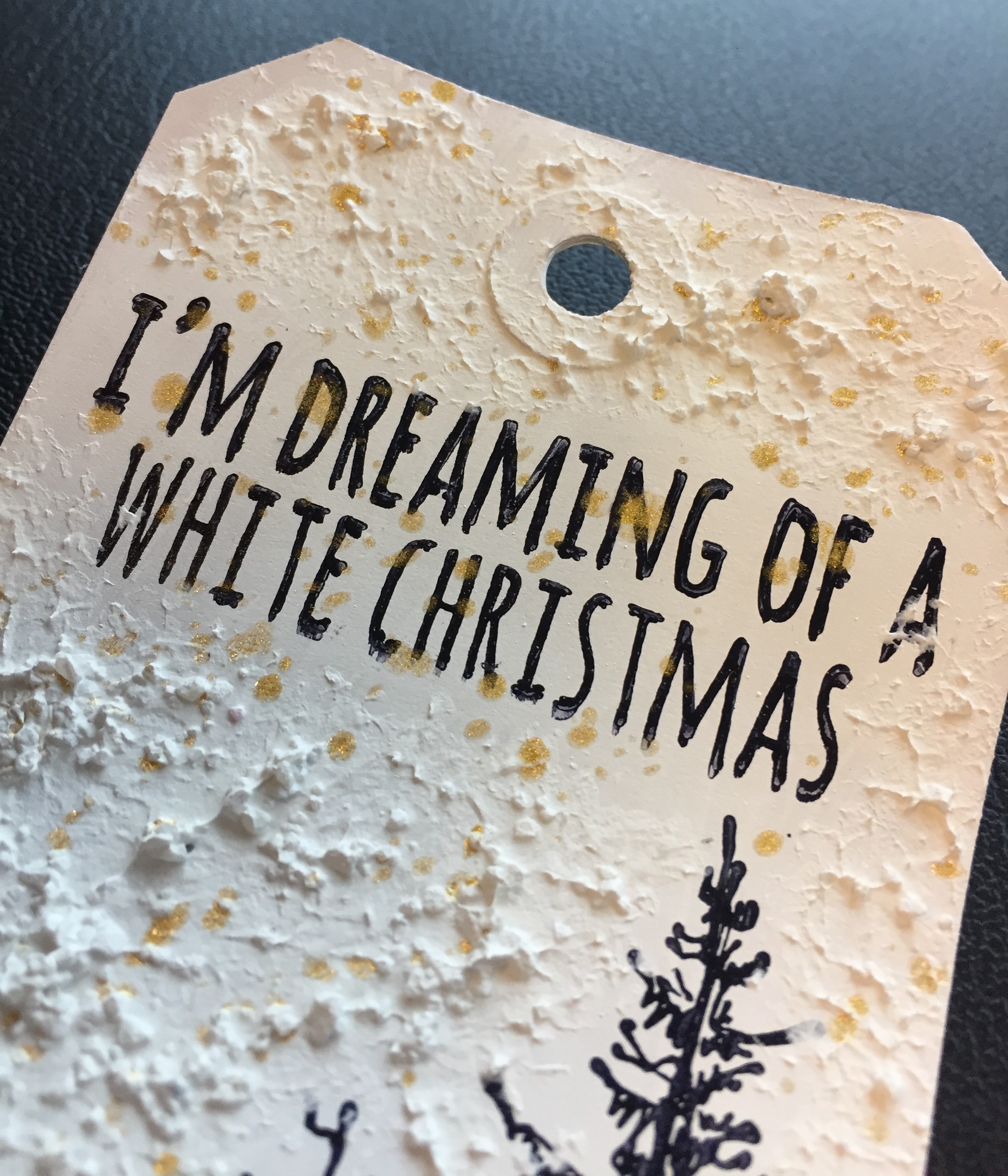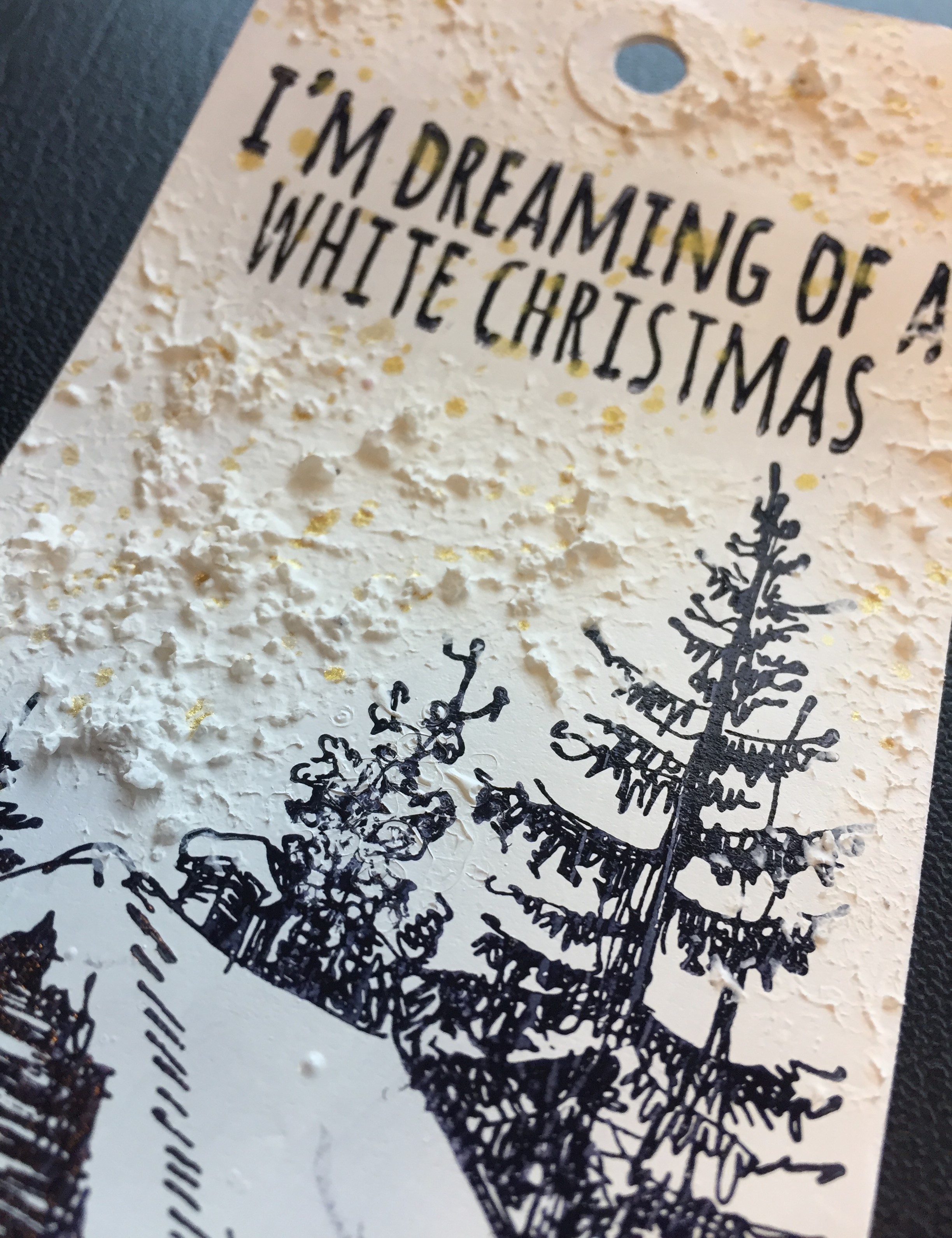 På tagget med huset har jeg brugt White på hele baggrunden. Derefter har jeg tørret det, og stemplet mit motiv. Jeg har så påført Snow Paste med en finger, tørret det, og til sidst splattet med Shimmer Spritz spray i Gold.