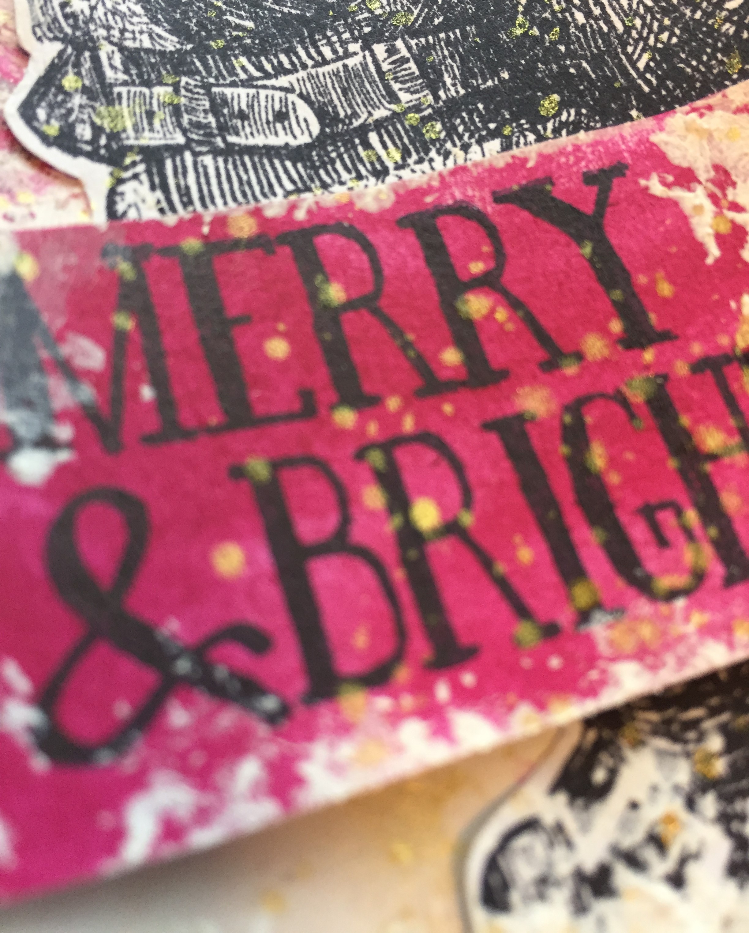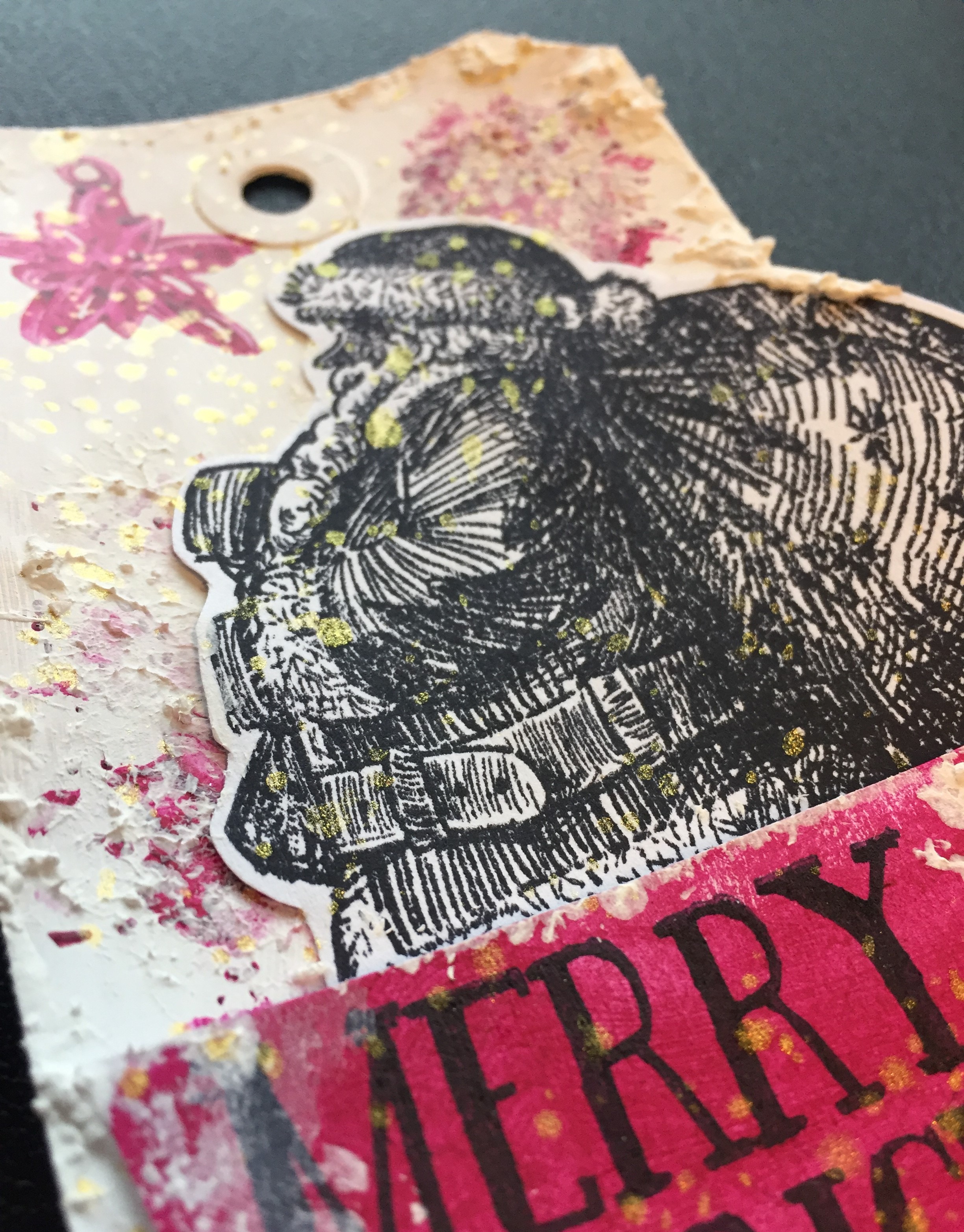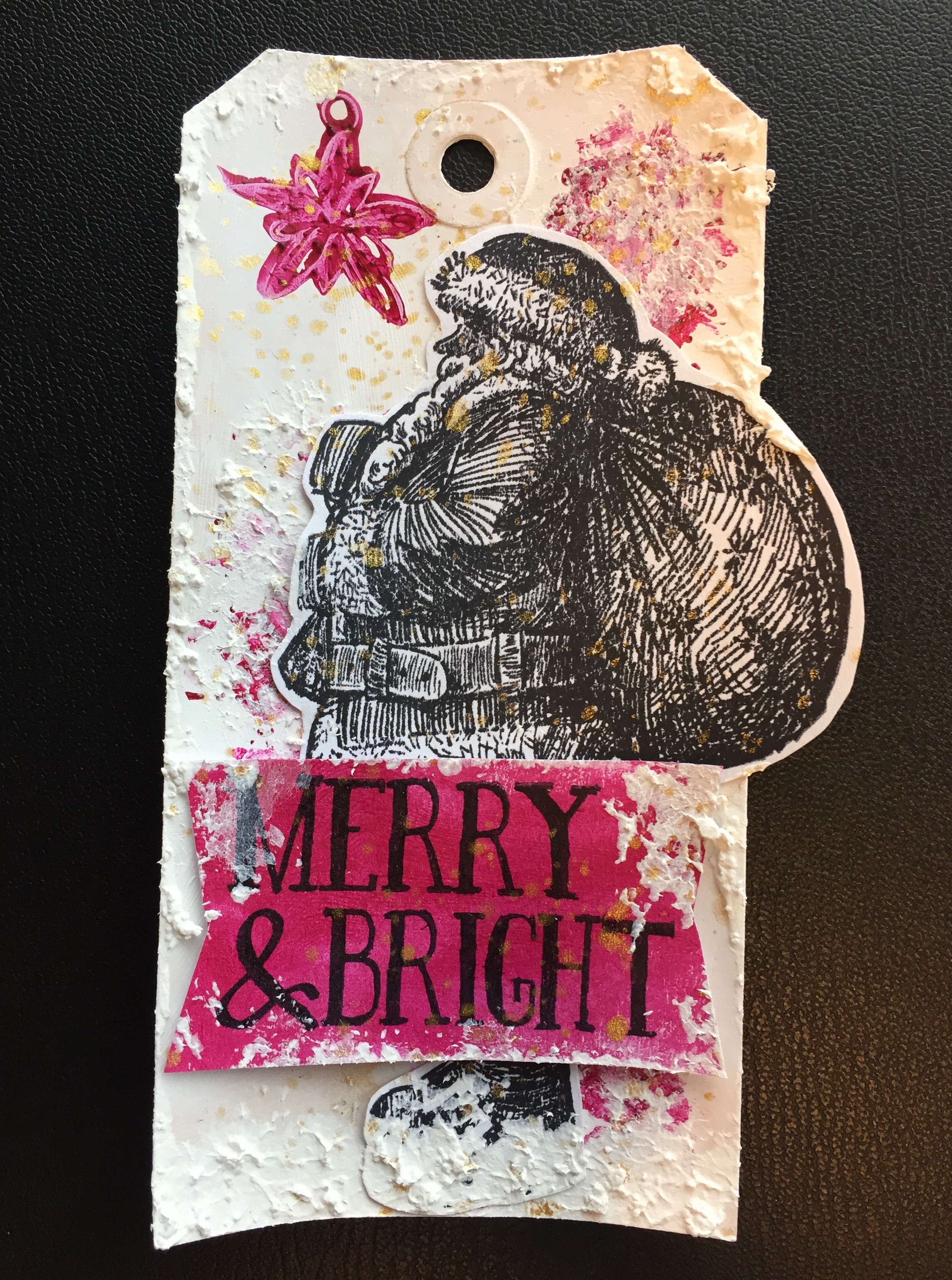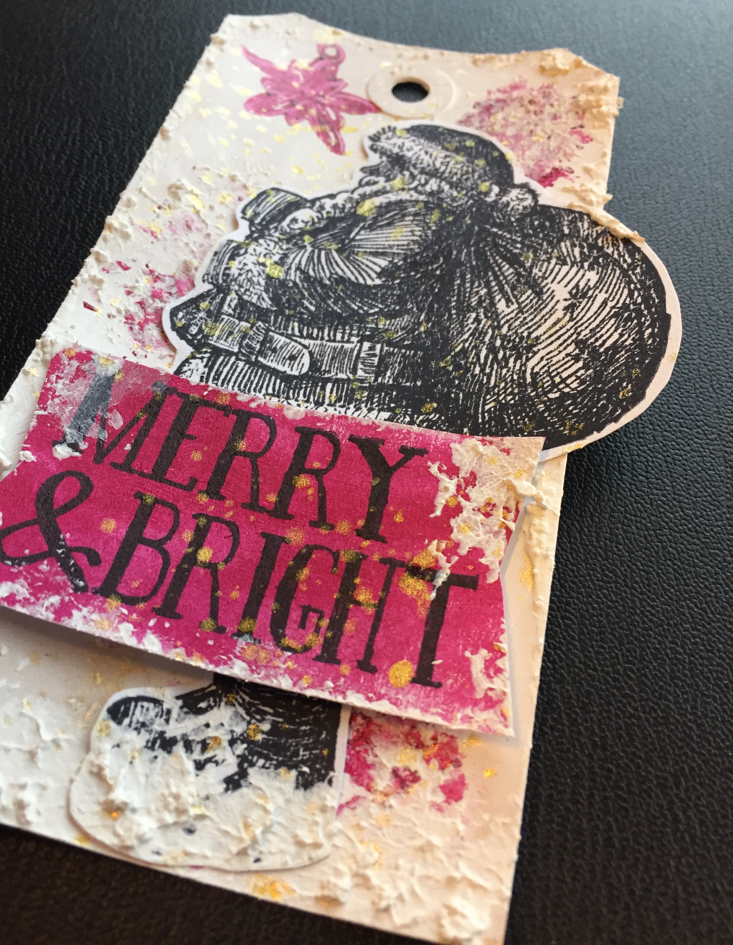 På tagget med julemanden har jeg på baggrunden brugt White over det hele. Da det var tørt, har jeg brugt farven Fuchsia gennem en stencil. Derefter har jeg sporadisk brugt Snow Paste inden, jeg har sat min julemand på med 3d tape. Teksten er stemplet på et stykke hvidt karton, som er dækket med farven Fuchsia og derefter klippet ud i hånden. Igen har jeg sluttet af med at lave splats i guld.