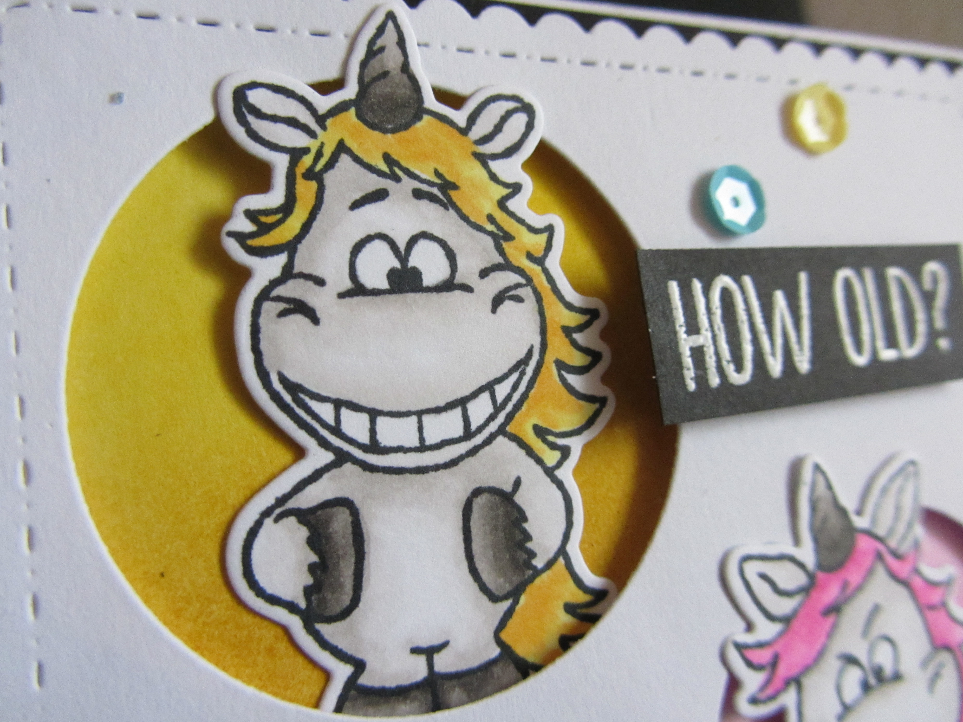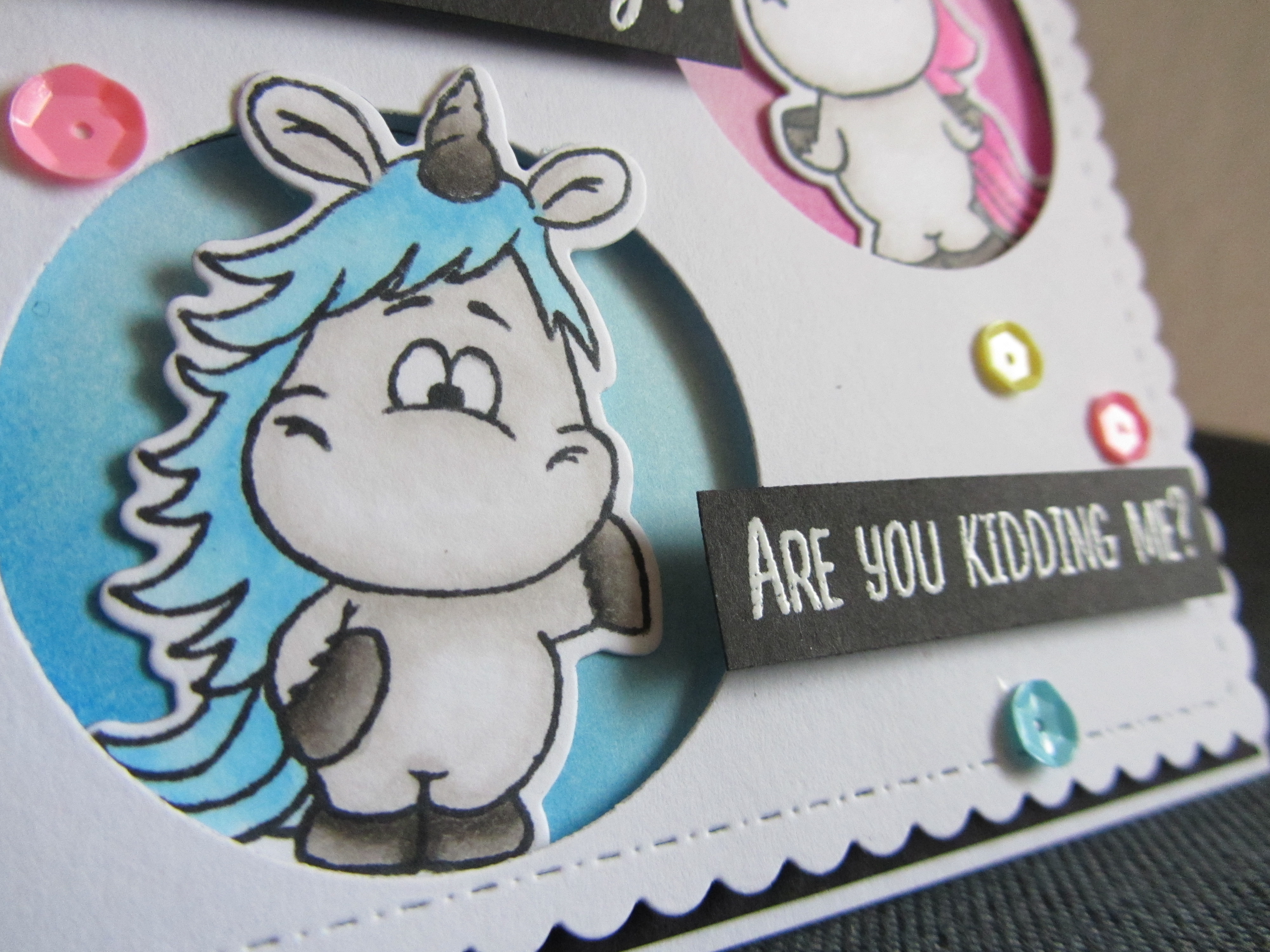 Jeg har stemplet enhjørningerne med Memento i Tuxedo Black, og har derefter farvelagt dem med Copics. Til sidst har jeg skåret dem ud med dies'ene, der passer til stempelsættet.
