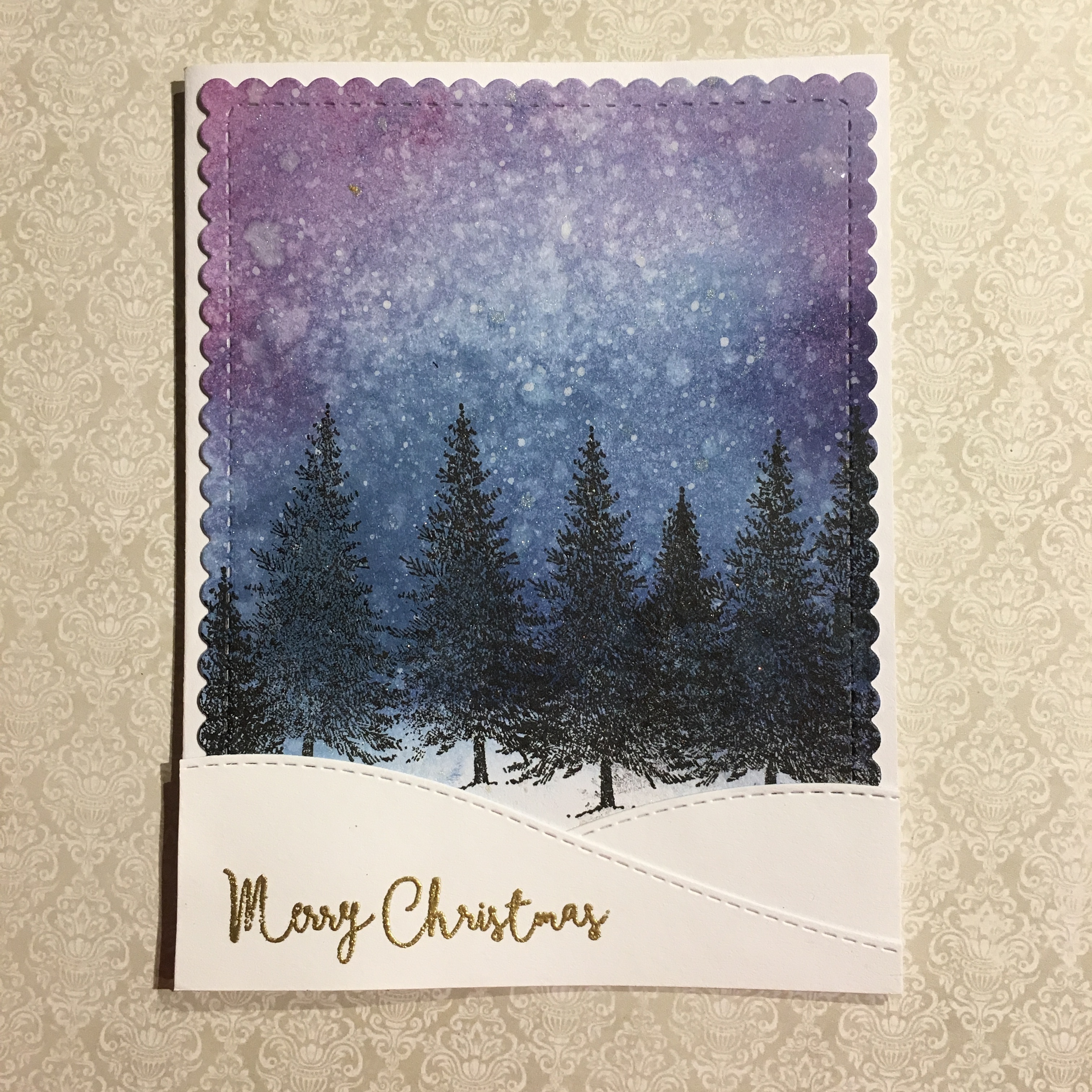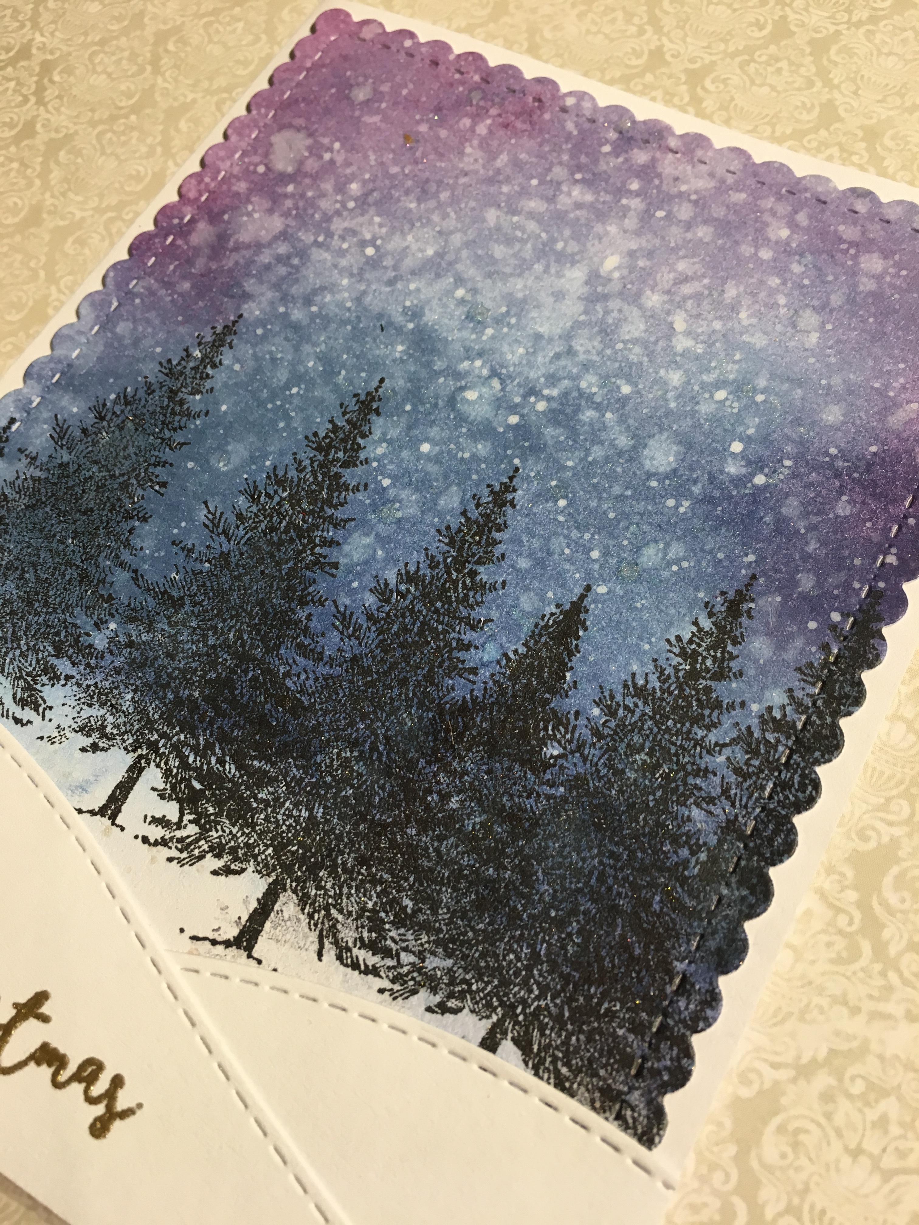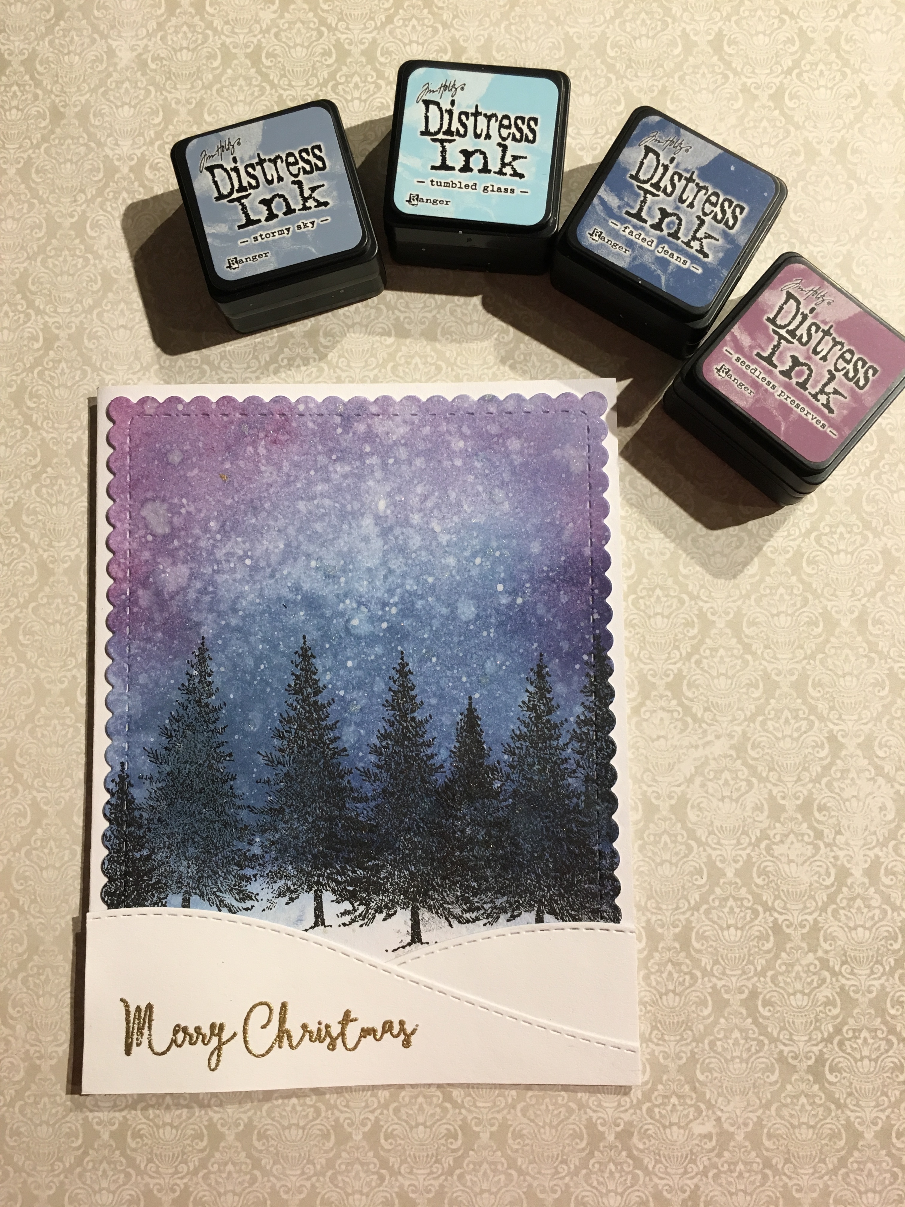 Jeg startede med at lave en baggrund med Distress Inks. Jeg har brugt 3 forskellige blå farver og en lilla til den øverste del af himlen. Jeg har ikke sværtet på den nederste del af papiret, da dette så bliver sneen.