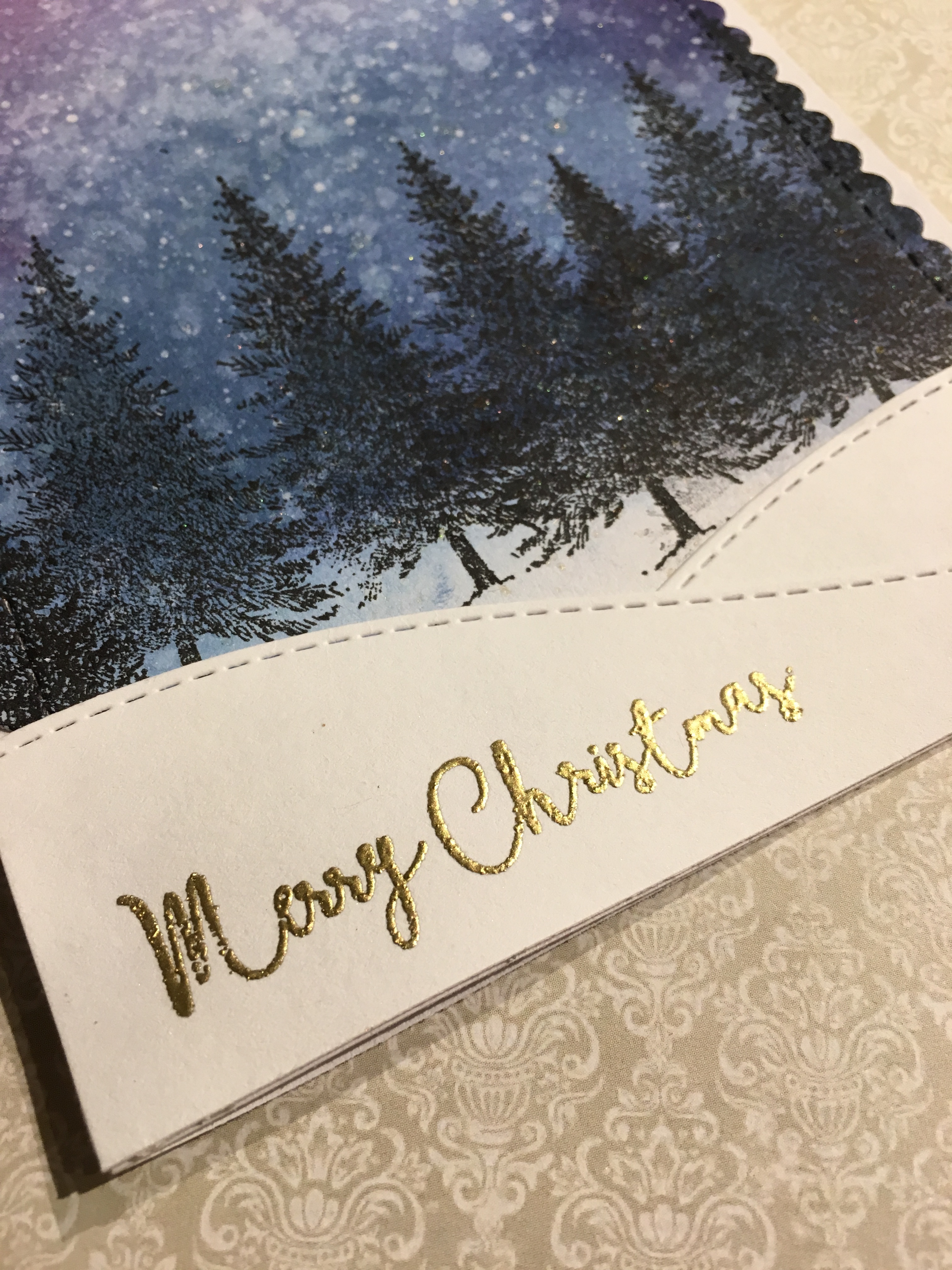 Til slut har jeg stemplet titlen "Merry Christmas", som stammer fra sættet Avery Elle's Winter Woodland Wonders. Jeg har heat embosset teksten vha. Versamark og en lækker embossing pulver i guld. Inden da har jeg penslet feltet af med "farmor" (antistatisk pulver), så pulveret kun klistrede fast på teksten.