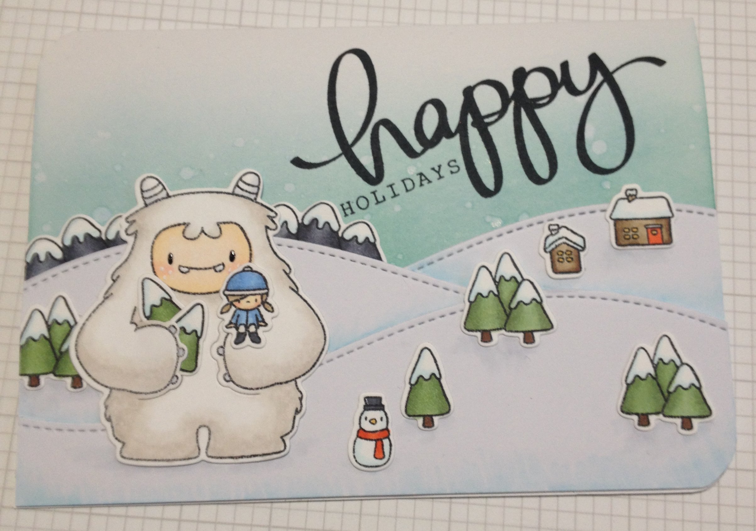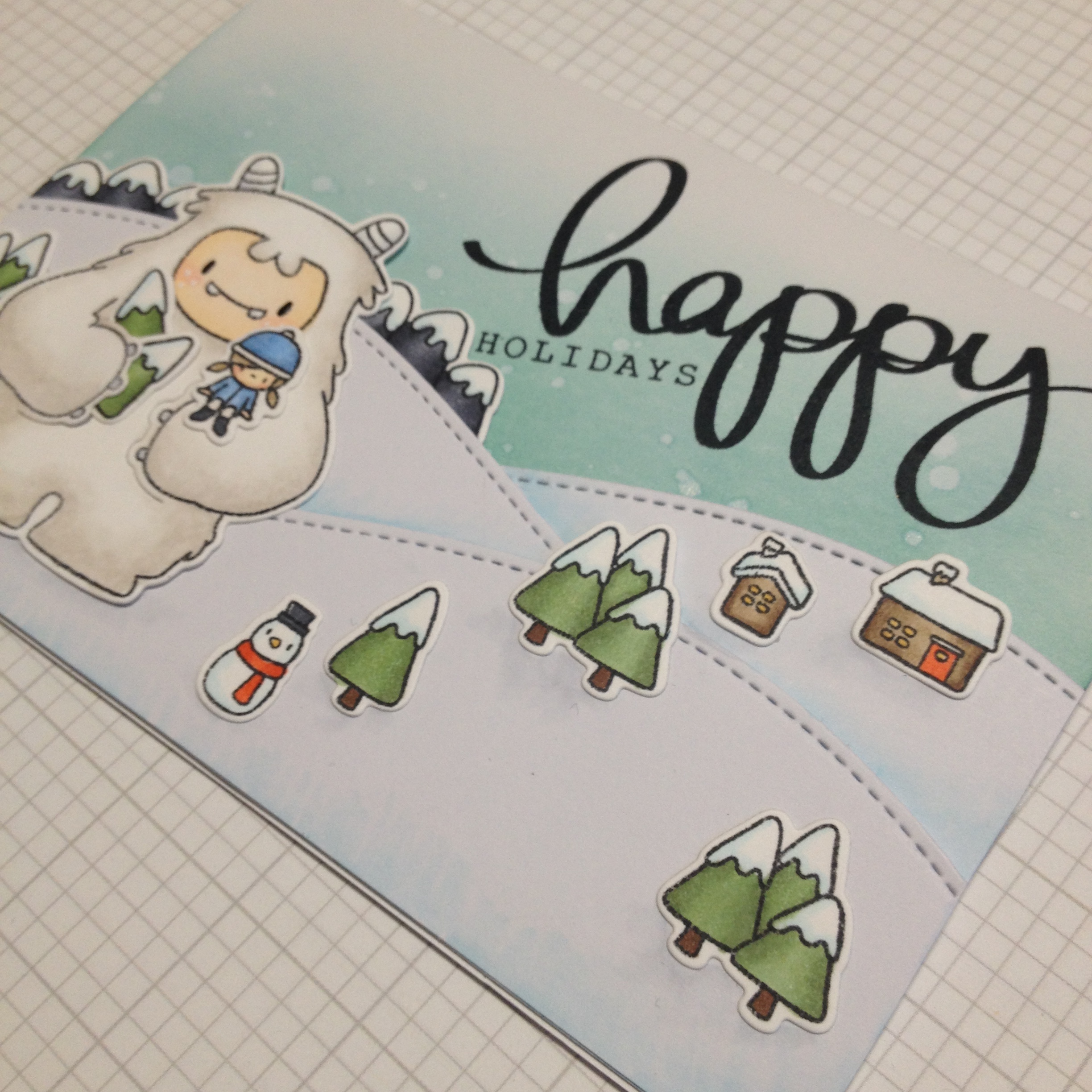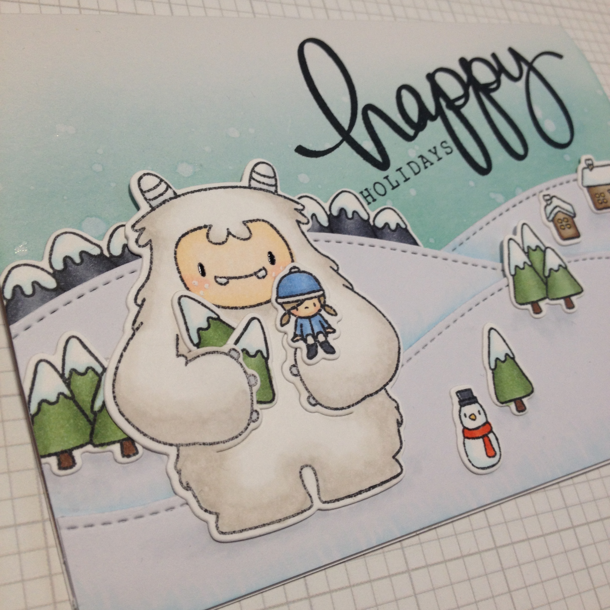 PÅ dagens kort har jeg farvelagt mine forskellige motiver med mine copics (se farver i bunden af indlægget), stanset dem ud med de tilhørende dies, som oven i købet skærer ud ved yetiens hænder så han kan holde fast på ting. Endelig har jeg brugt en sort og hvid glaze pen på min yeti - blandt andet til at farve hans tænder, øjne og små prikker på kinderne.