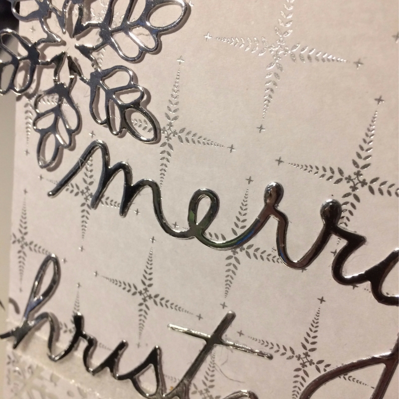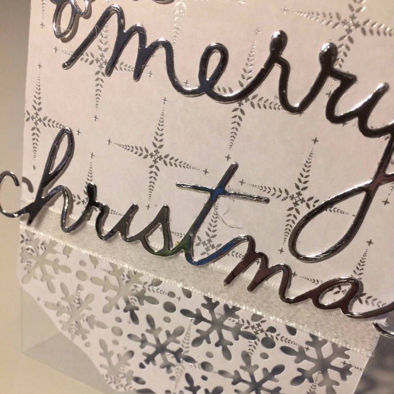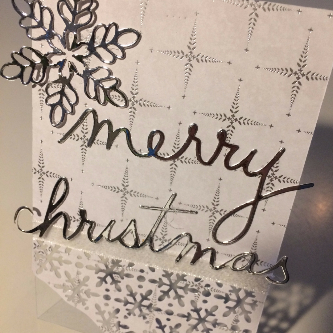 Jeg er ret vild med de lækre diessæt med Merry og Christmas. I sættene er der ordene med 3 forskellige skrifttyper. Her har jeg brugt den lækre sammenhængende skrift - skåret i sølv folie karton, og med et stykke glitterbånd under. Faktisk er det sat på, fordi diesen med udstansninger i papiret var en anelse skævt, og det kunne så rettes op med båndet, og samtidig giver det en god overgang til teksten.