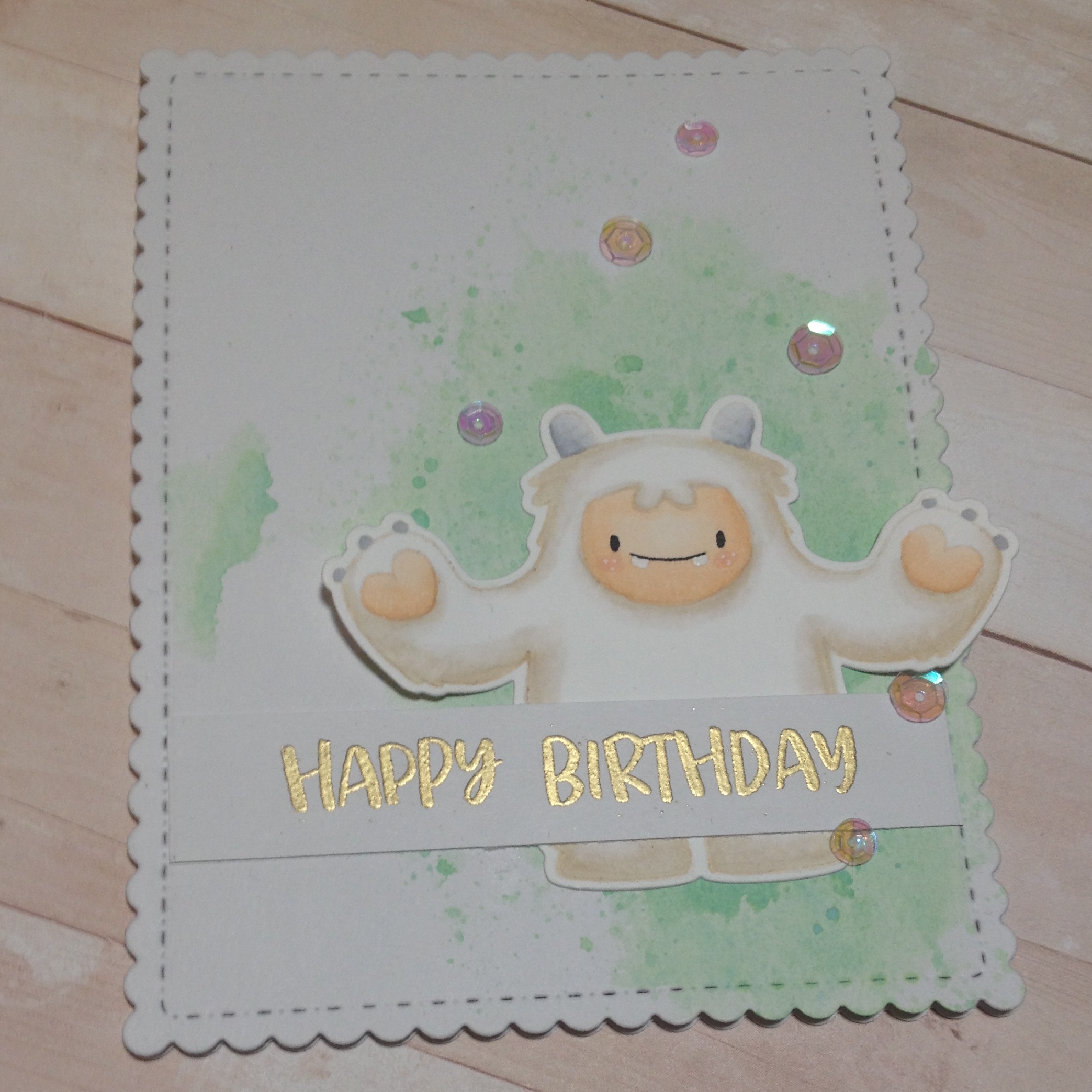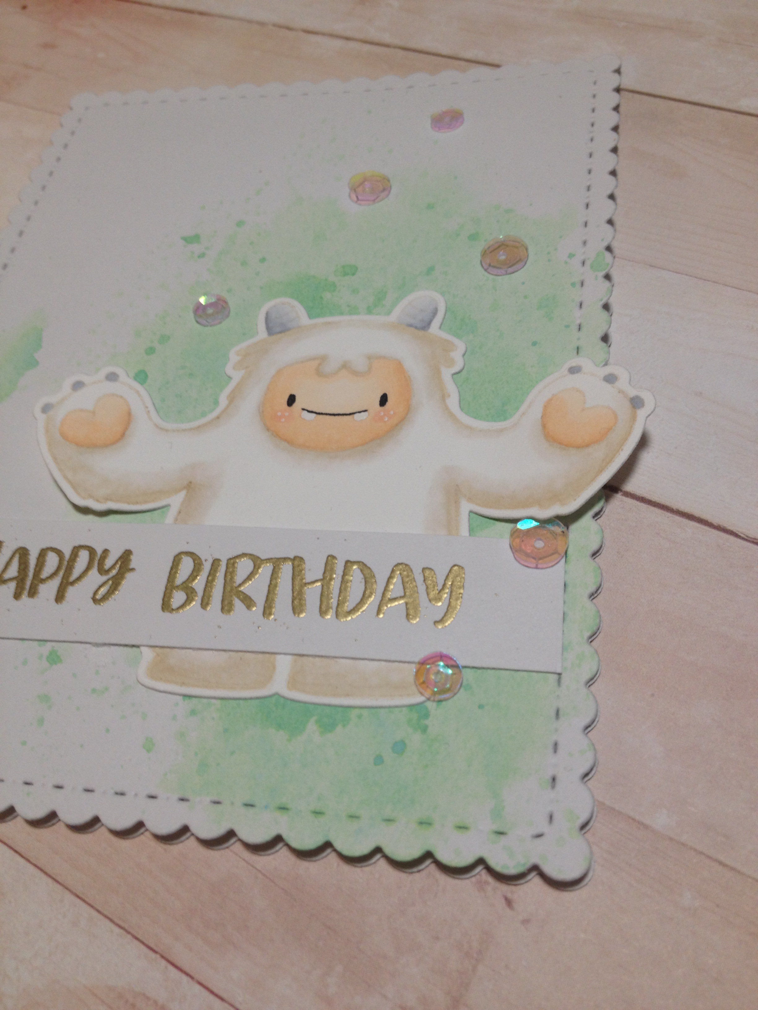 Som jeg også har nævnt tidligere er jeg helt forelsket i de søde yetier fra Mama Elephant, så selvfølgelig skulle jeg finde noget hvor jeg kunne bruge dem hele året rundt, derfor blev det til dette fine fødselsdagskort.