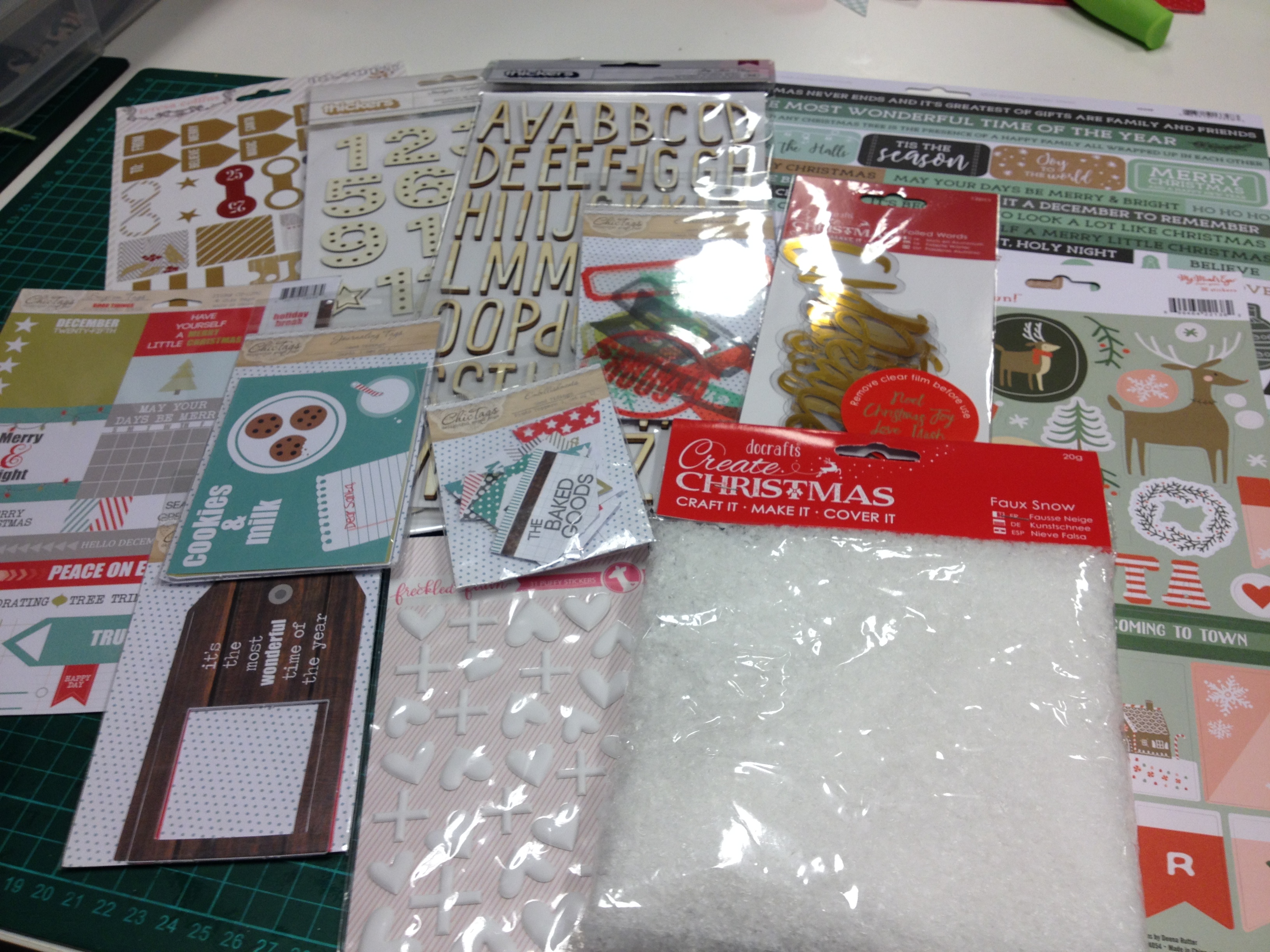 Og her er pynten jeg har valgt. Det er et godt miks af diecuts, stickers, bogstaver og tal, samt lidt sne. Jeg har generelt valgt at lægge mit fokus på stickers og diecuts, fordi det er meget nemt, og det er sådan det skal være med dette album, for at jeg skal have en chance for at nå i mål med det. Det kunne jeg forestille mig, du godt kender til :-)