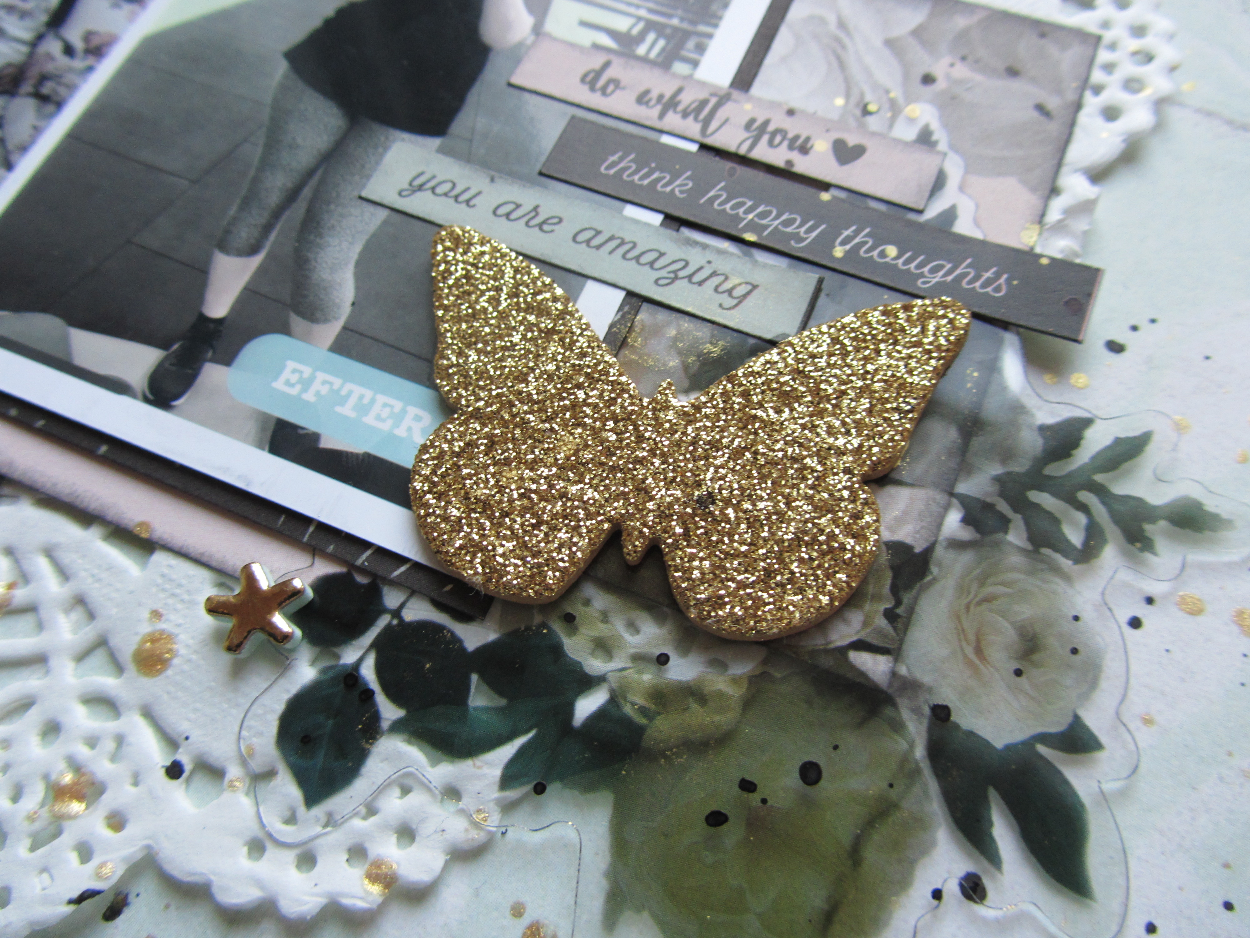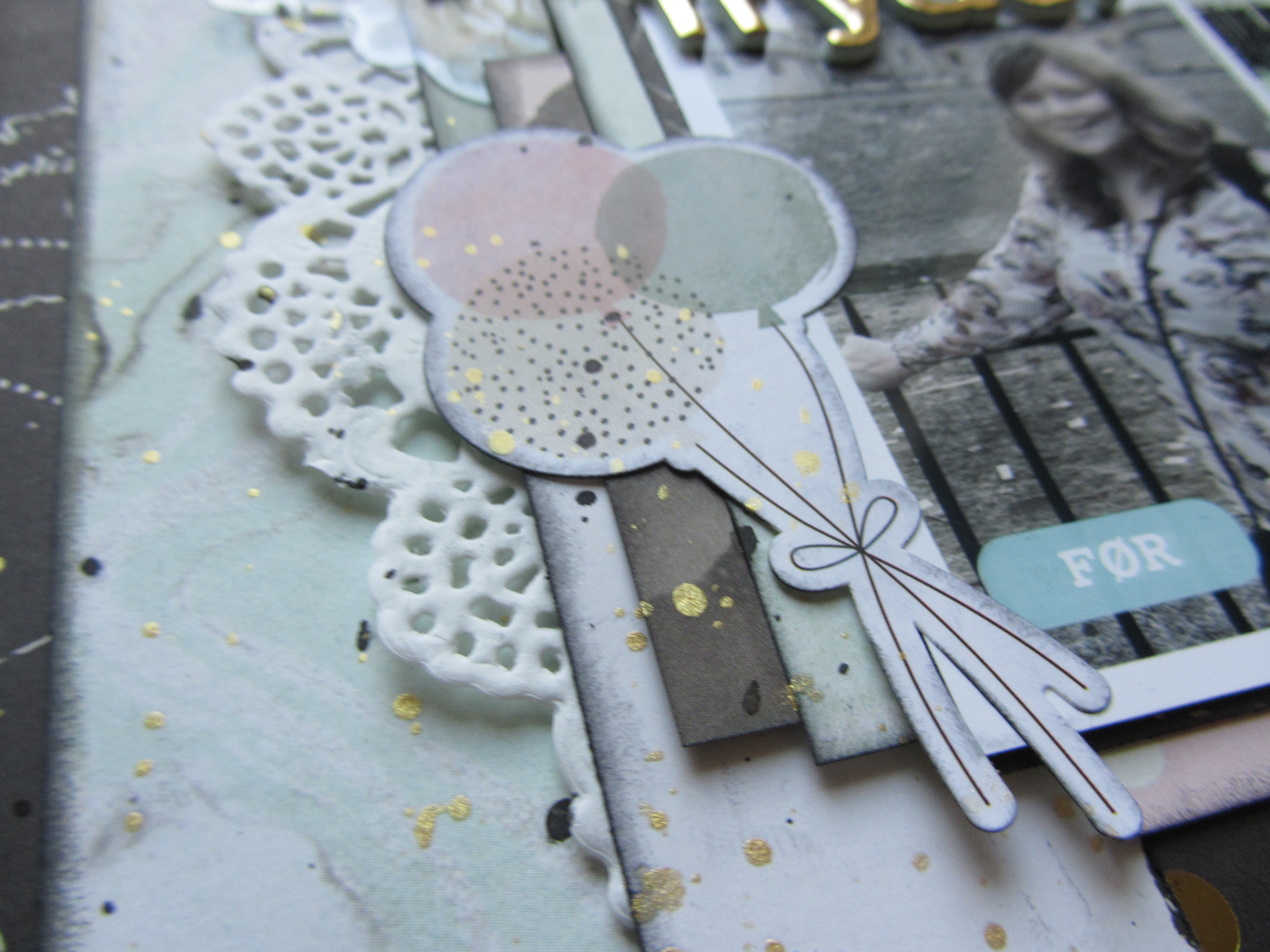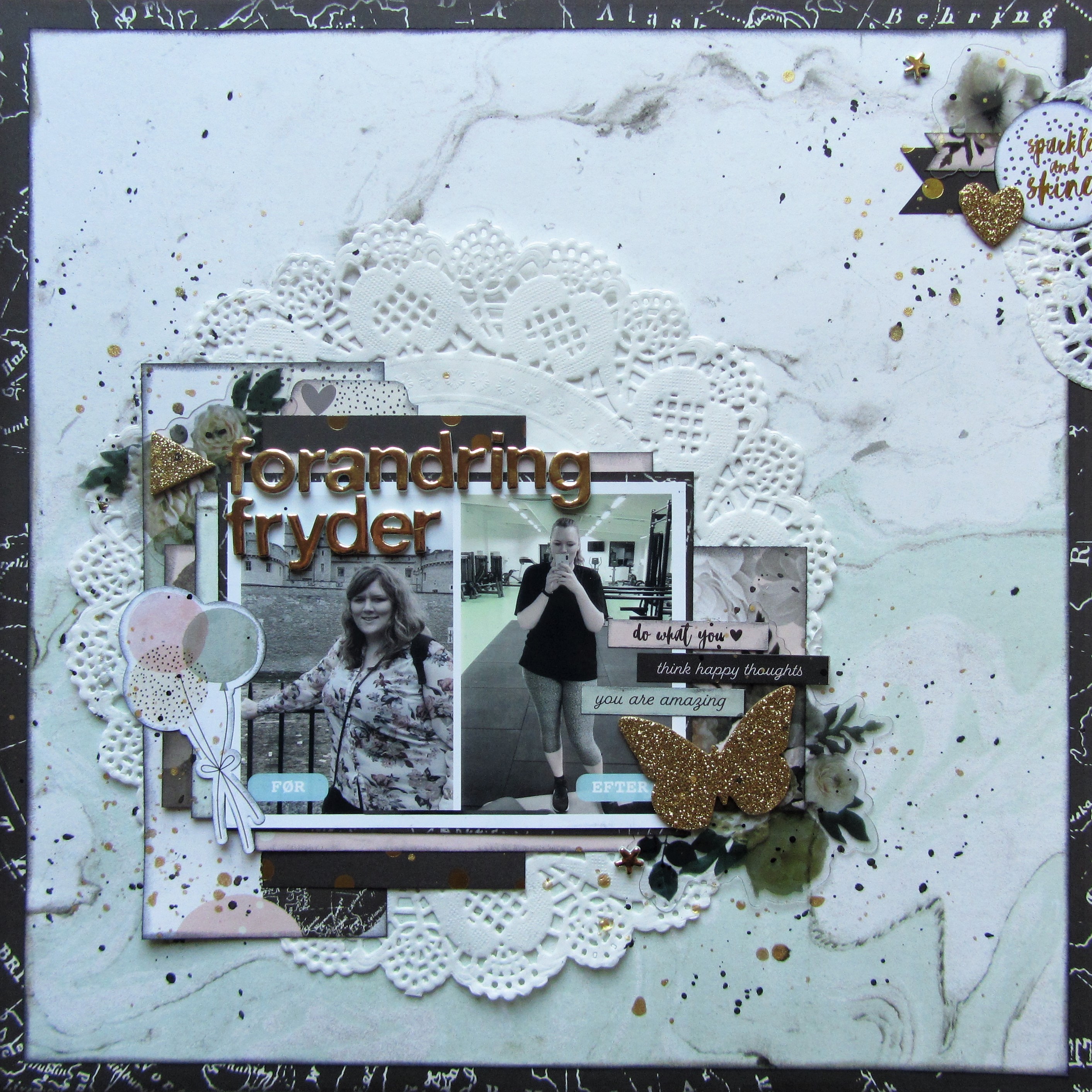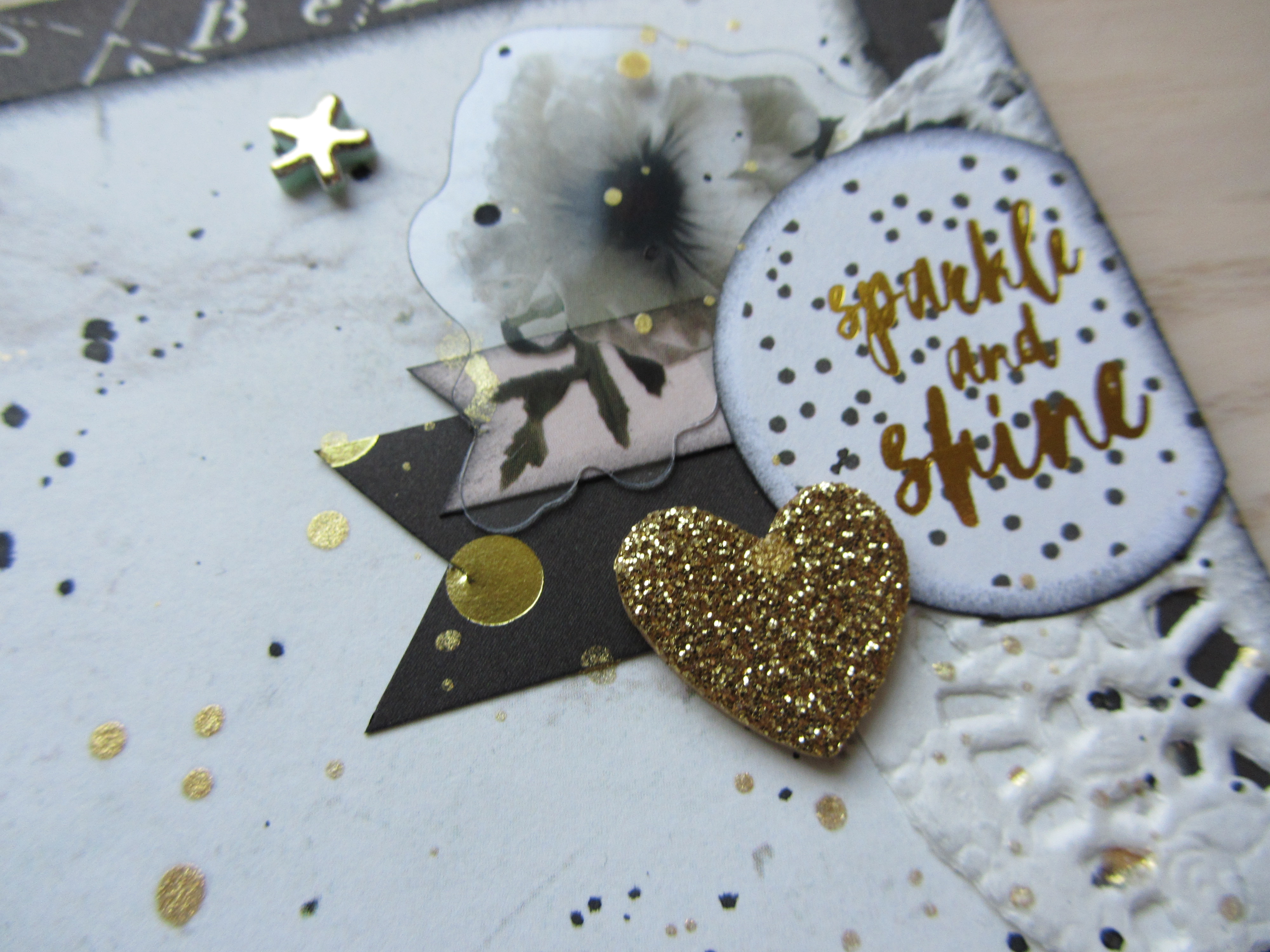 Som afslutning har jeg lavet splats med Heidi Swapp Color Shine i Gold og Dylusions Ink Sprays i Black Marble.
