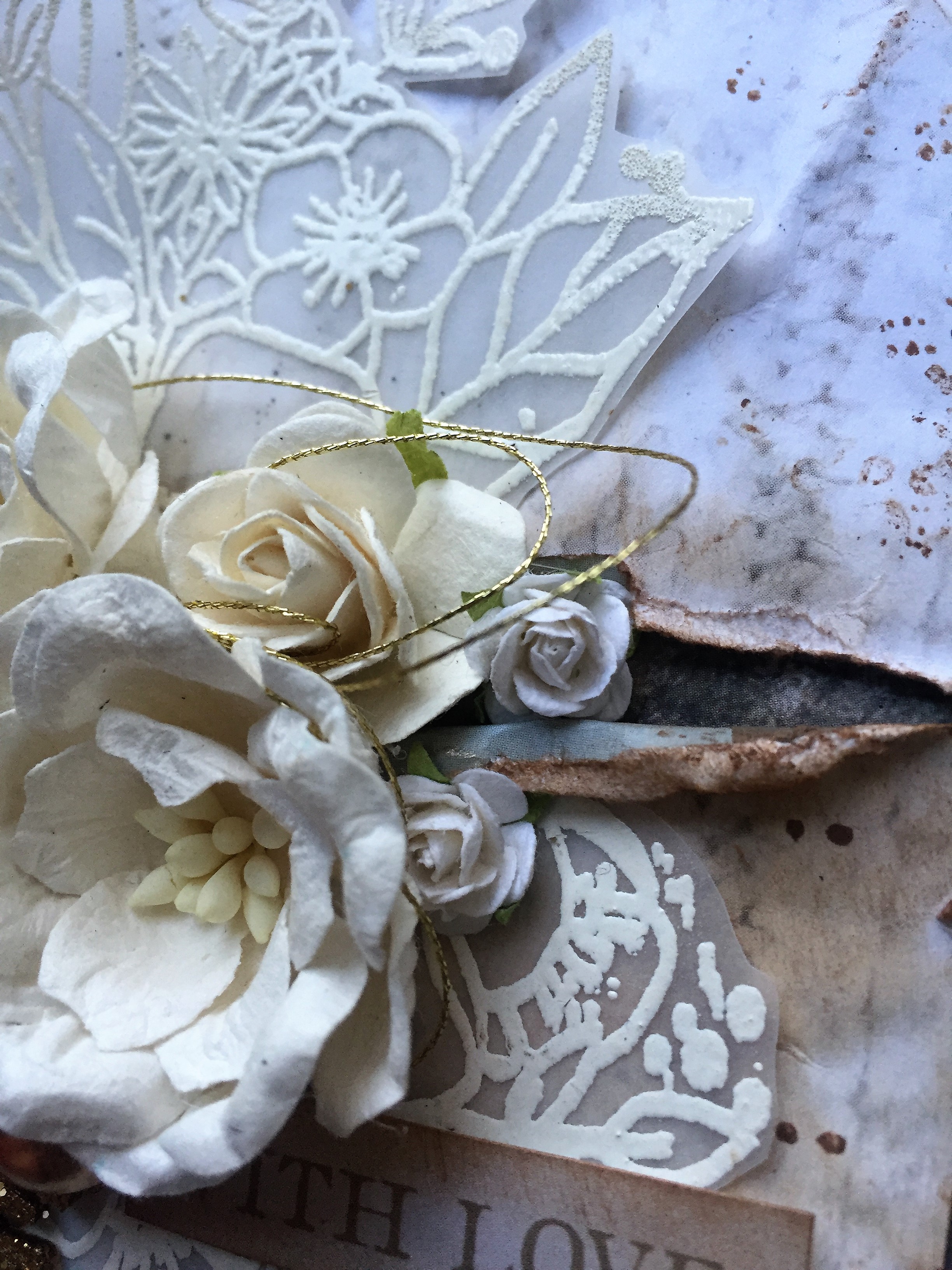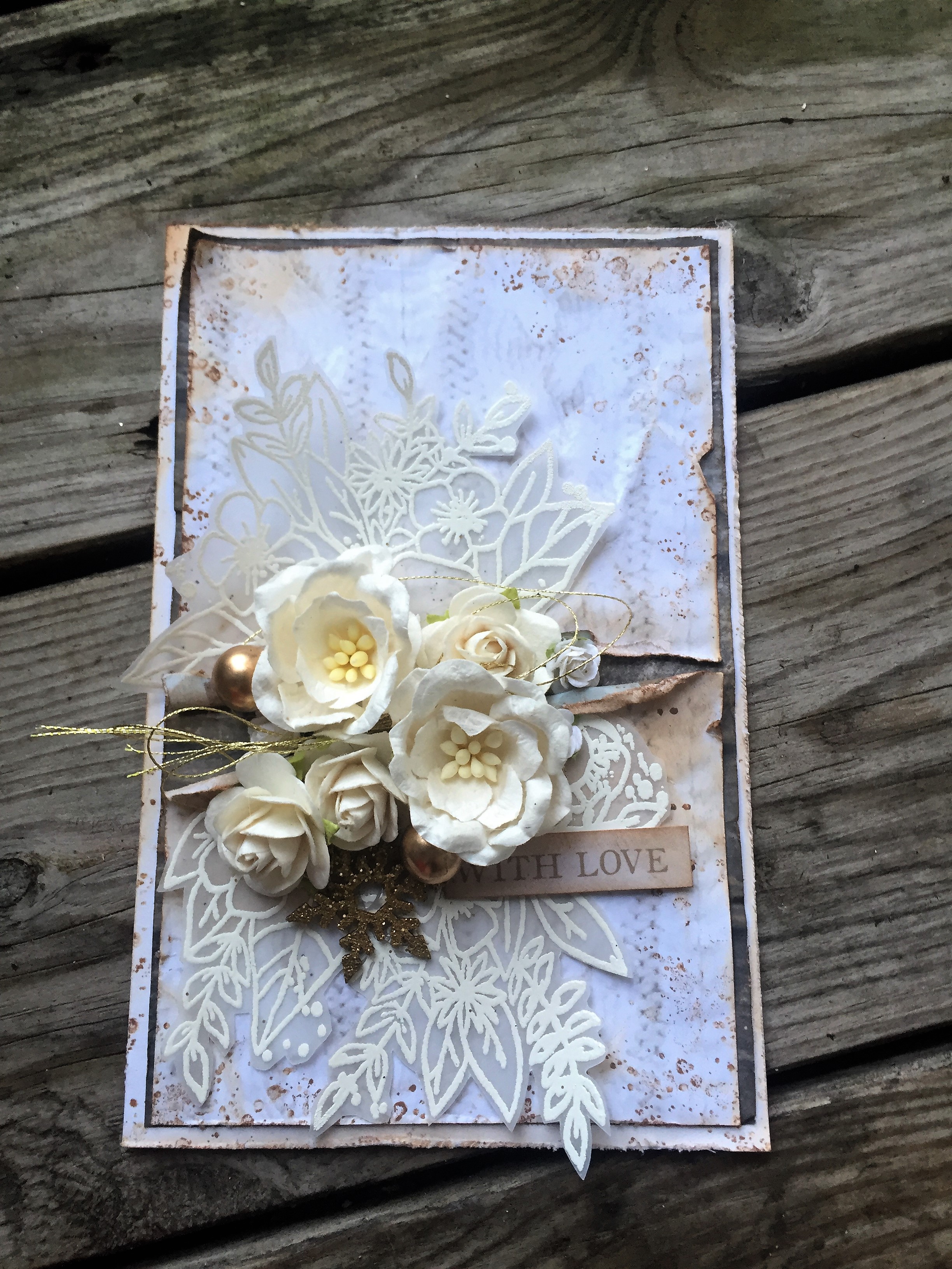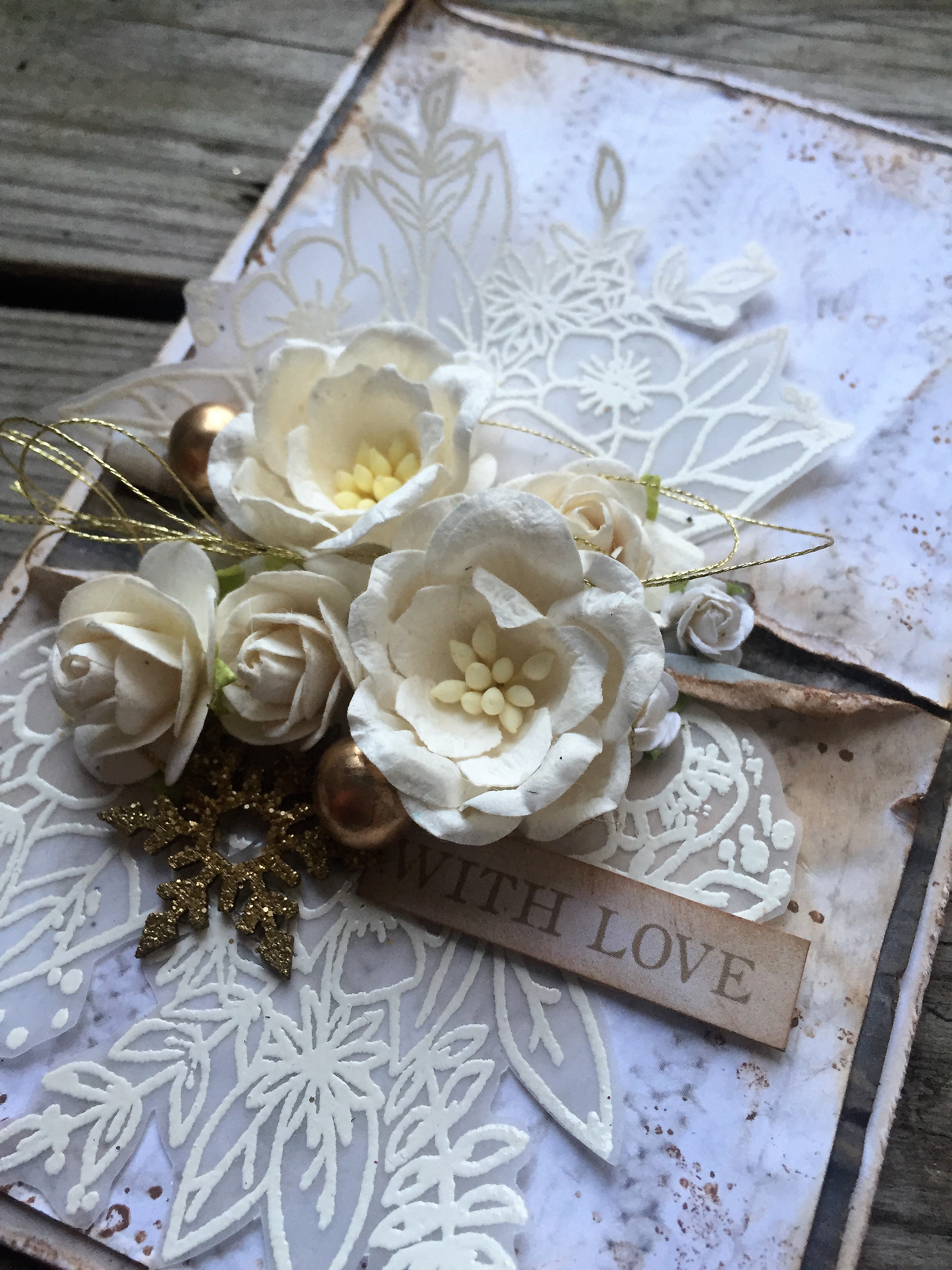 Pynten er simpel med masser af lækre blomster i hvide, små guldkugler, guld tråd og en lille guldembosset snefnug.