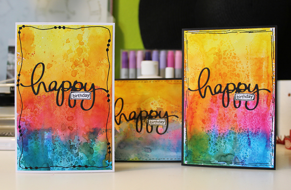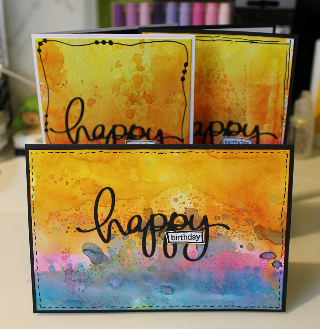 Jeg startede med at trykke mine mini Distress Ink imod mit underlag i 4 striber ved siden af hinanden. Derefter sprøjtede jeg godt med vand på så sværten bliver til små dråber. Så tog jeg mit karton og lagde ned i farven. Det gjorde jeg 3-4 gange og imellem hver gang tørrede jeg mit karton. Da det hele var tørt kunne jeg lave kanterne med min Dylusions paint pen. Ordet happy er en die og birthday er et stempel - begge dele fra