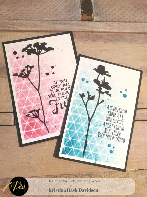 Til de baggrunde jeg i dag har lavet, har jeg brugt en pensel, stencil (Tim Holts THS081) og akvarelpapir, det blev til disse to enkle skønheder.