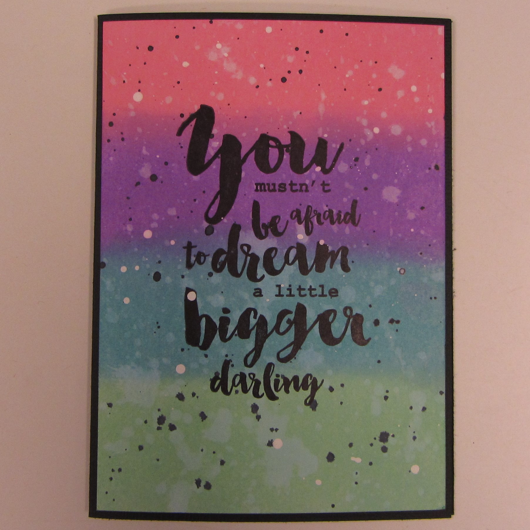 Kortet er, som skrevet, lavet med Distress Oxides. Til splats er der brugt vand, Sharpie og Dylusions ink.Og se så lige det lækre stempel!!