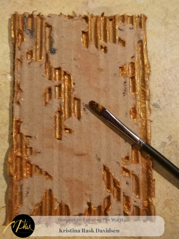Til det ene kort har jeg brugt flere forskellige farver. Først har jeg malet "bølgerne" guldfarvede med en pensel, det kræver ikke den store præcision, da det meste alligevel dækkes bagefter.
