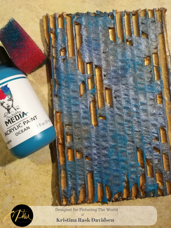 Når bølgerne er tørre kan man med en svamp duppe forskellige farver på, jeg har holdt mig til de blå toner, i den ene maling (sky) tilsatte jeg lidt pigment powder for at få metallic effekt.