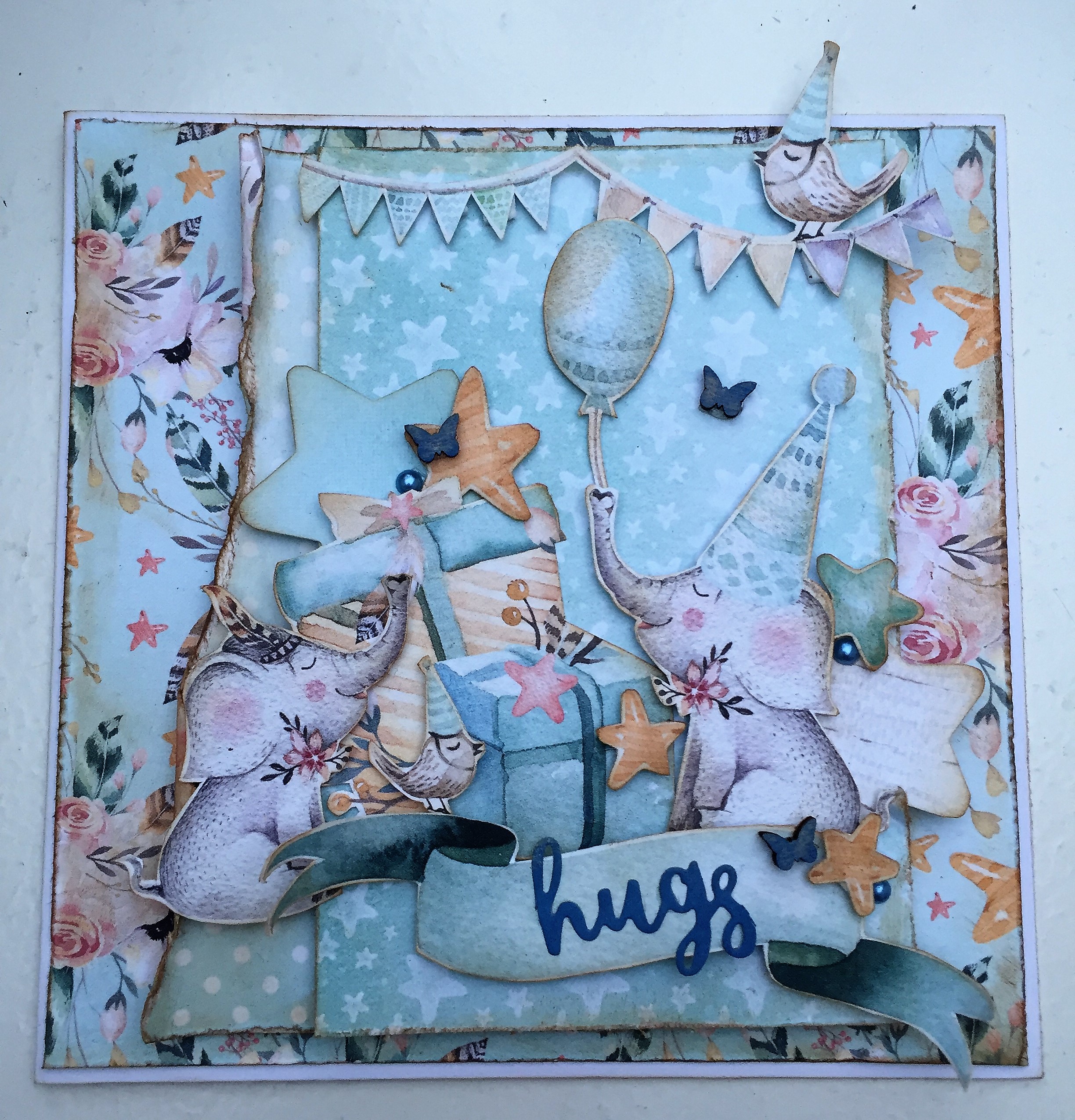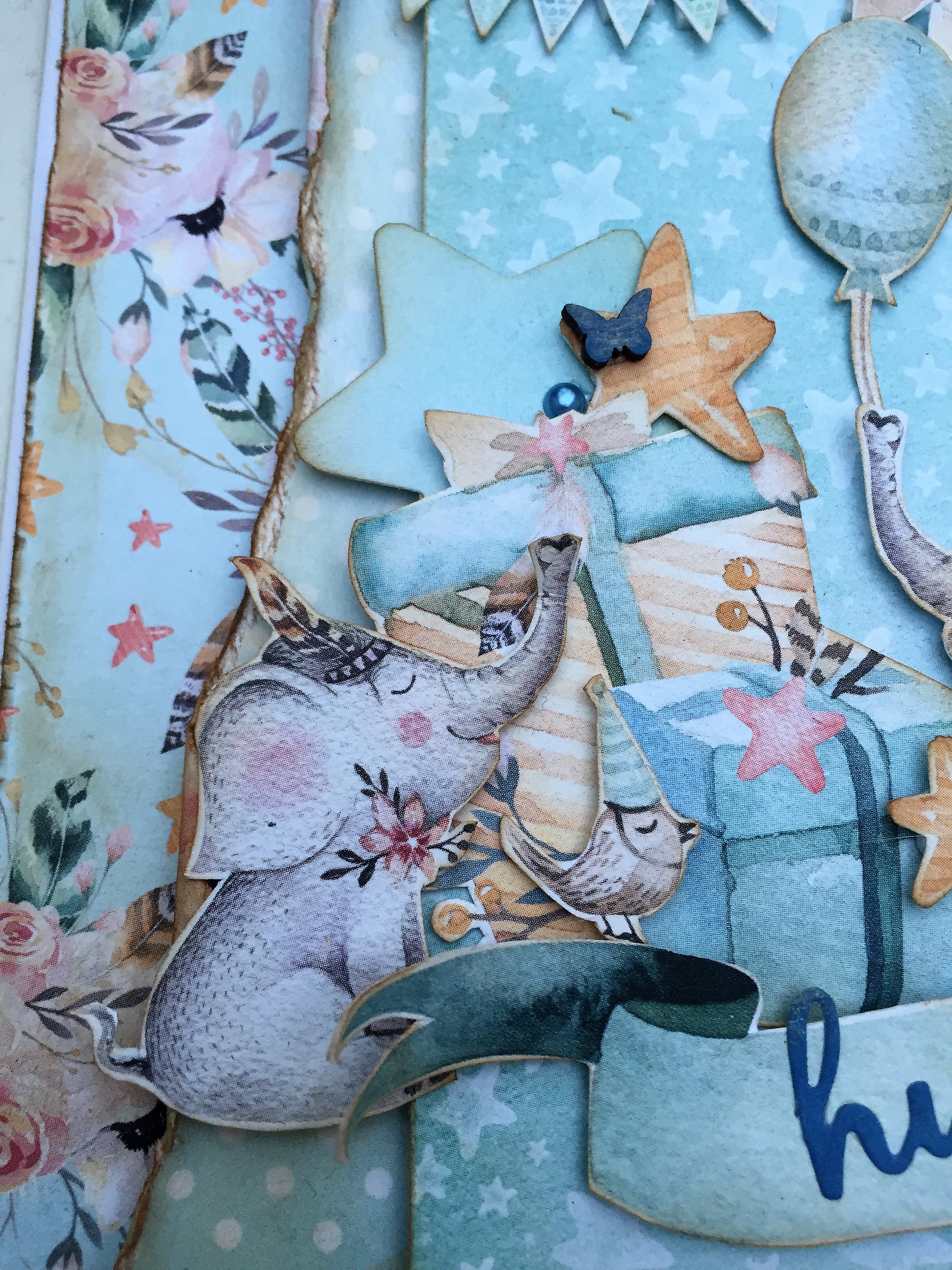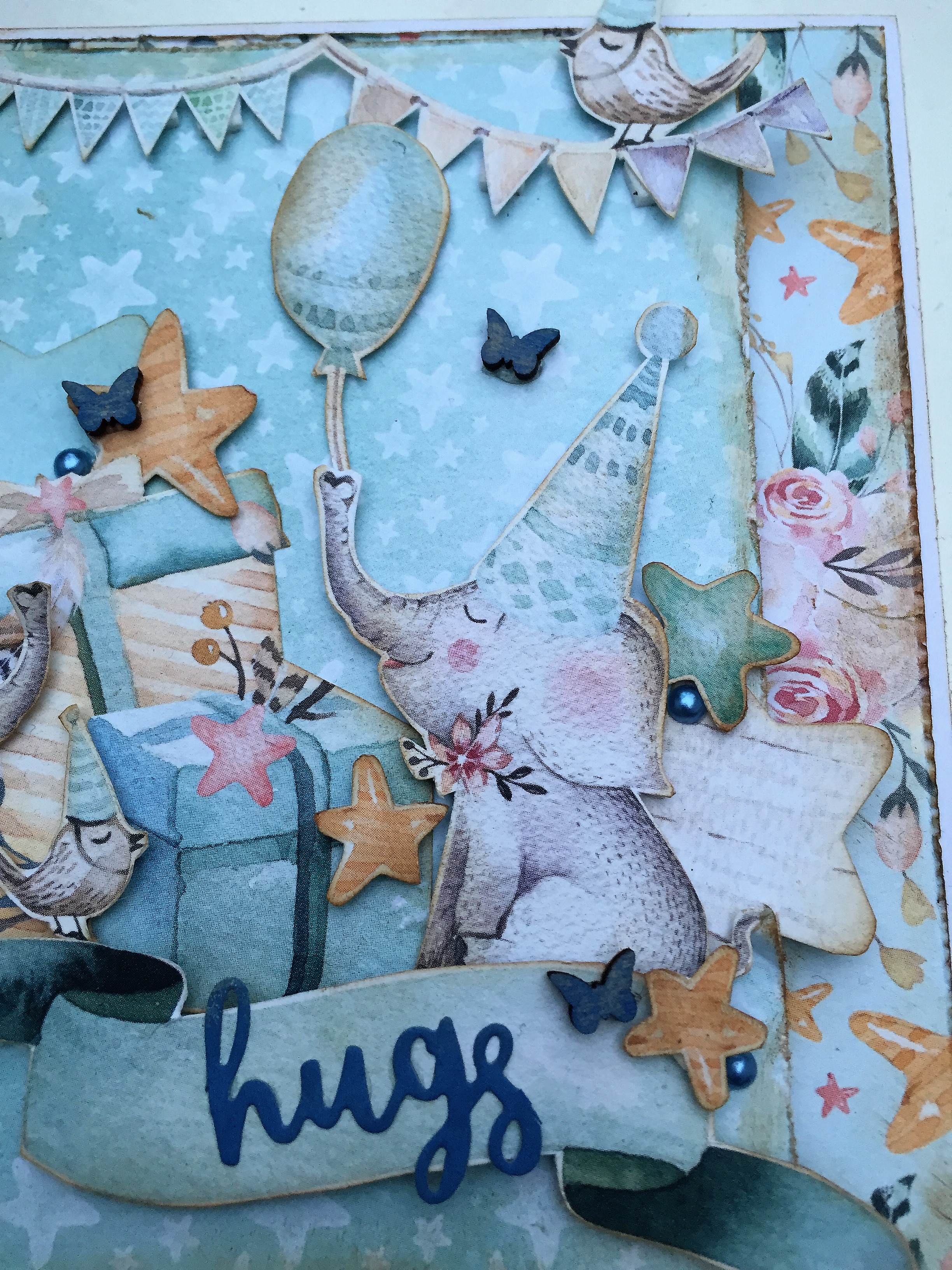 Udover de udklippede figurer, så har jeg stanset nogle stjerner ud og afrundet spidserne, så de passer ind til de små stjerner. Rundt omkring er der små blå halvperler samt træsommerfugle og overskriften er farvet med distress oxide.