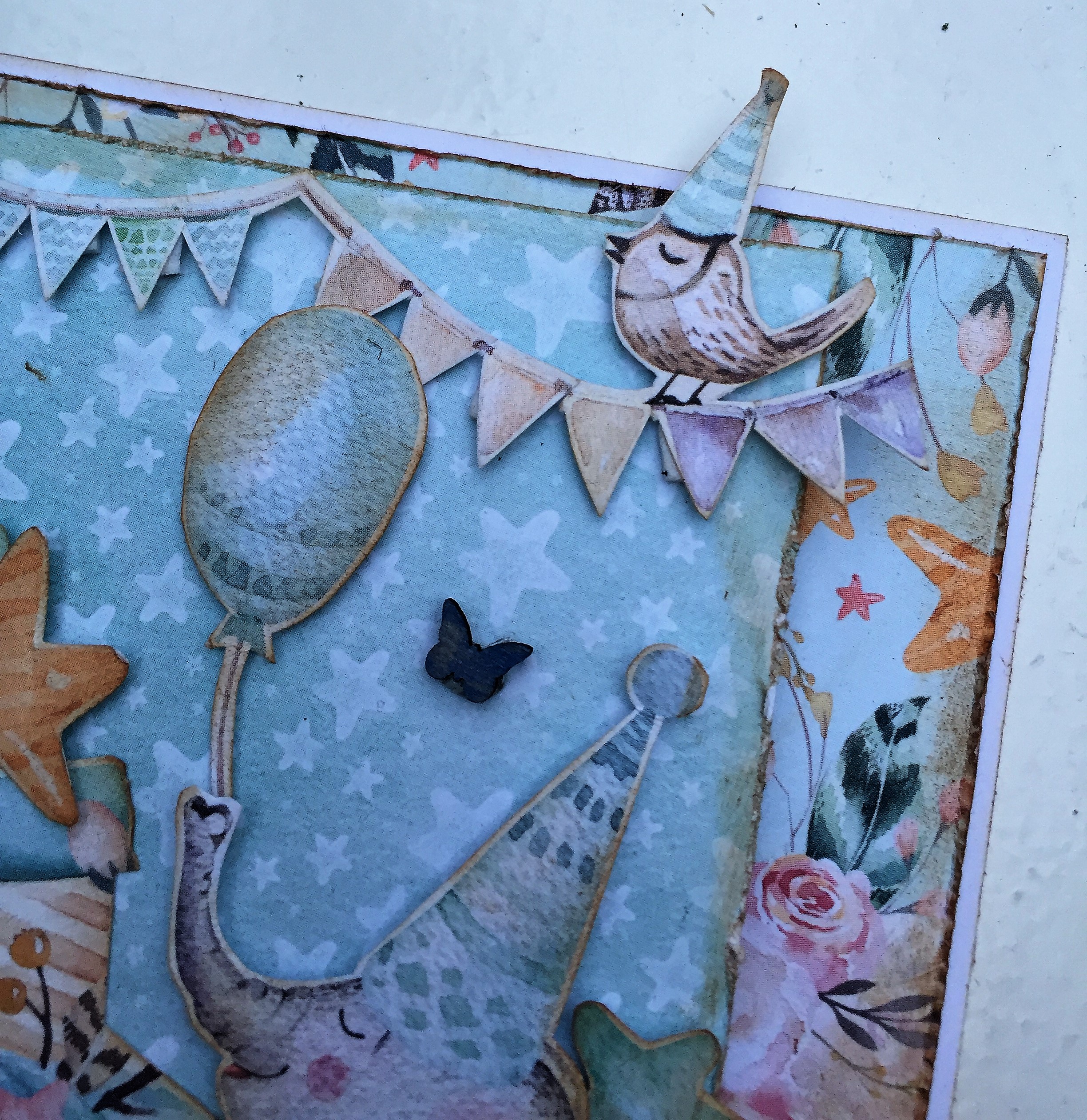 Sød detalje i med et lille flagbanner og fugl i toppen af kortet.