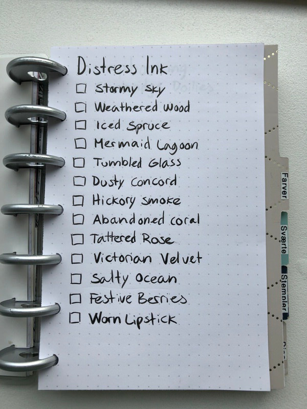 Ønsker: Her har jeg lister over de ting jeg gerne vil investere i, eller kan skrive på ønskelisten når familien eller kæresten spørger - Her er det f.eks. de næste distress inks jeg gerne vil have fingrene i.