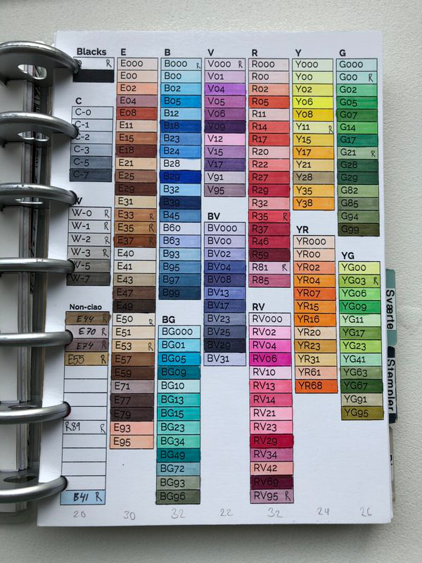 Farver: Her holder jeg styr på alle de ting jeg har til at farve med, dvs. copics, pigment powder, maling osv. Her bruger jeg ofte farvekort printet fra nettet istedet for at skrive det hele ned selv,og hvis jeg ikke kan finde det på nettet har jeg i word nogle gange lavet mine egne oversigter, f.eks. til copic som billede 1.