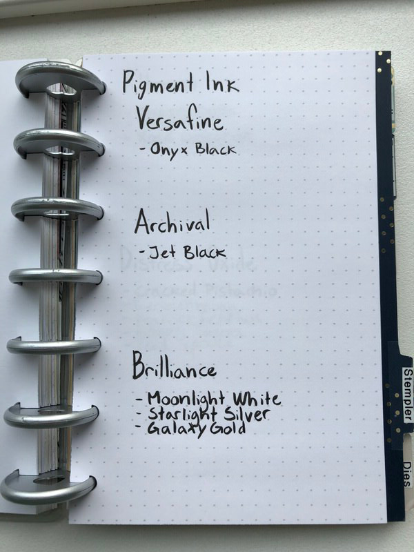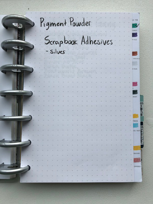 Jeg har delt min bog ind i 12 hoved sektioner: Ideer, Ønsker, Farver, Sværte, Stempler, Dies, Stencils, Embossing, Mists, Pynt, Washi og selvfølgelig en diverse. Herunder vil jeg vise jer lidt billeder fra min bog, som forhåbentlig kan give jer inspiration til hvordan I kan organisere jer.