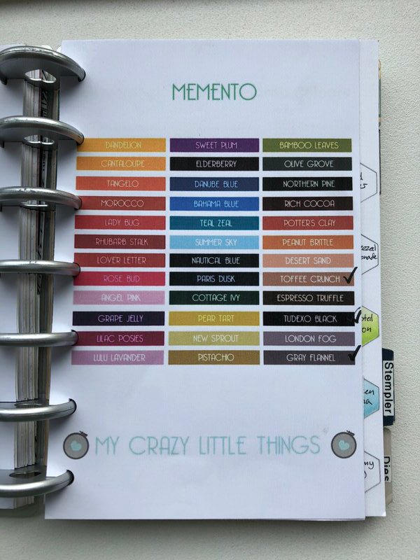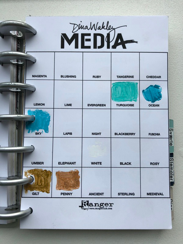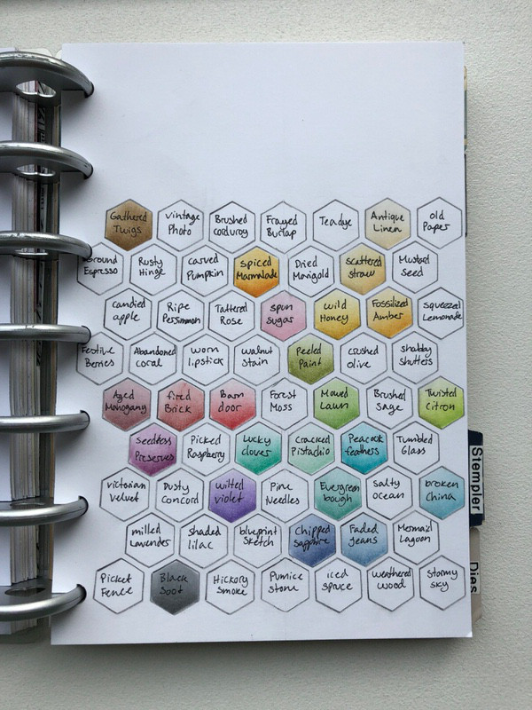 Sværter: Her holder jeg styr på alle de forskellige sværter jeg har. Her bruger jeg også farvekort printet fra nettet, eller som med distress ink har jeg lavet min egen lille stencil med en sekskant og tegnet alle farverne op. På den måde kan jeg bruge mit blending tool til at fylde farven ind når jeg får en ny, og faktisk se hvordan farven ser ud.