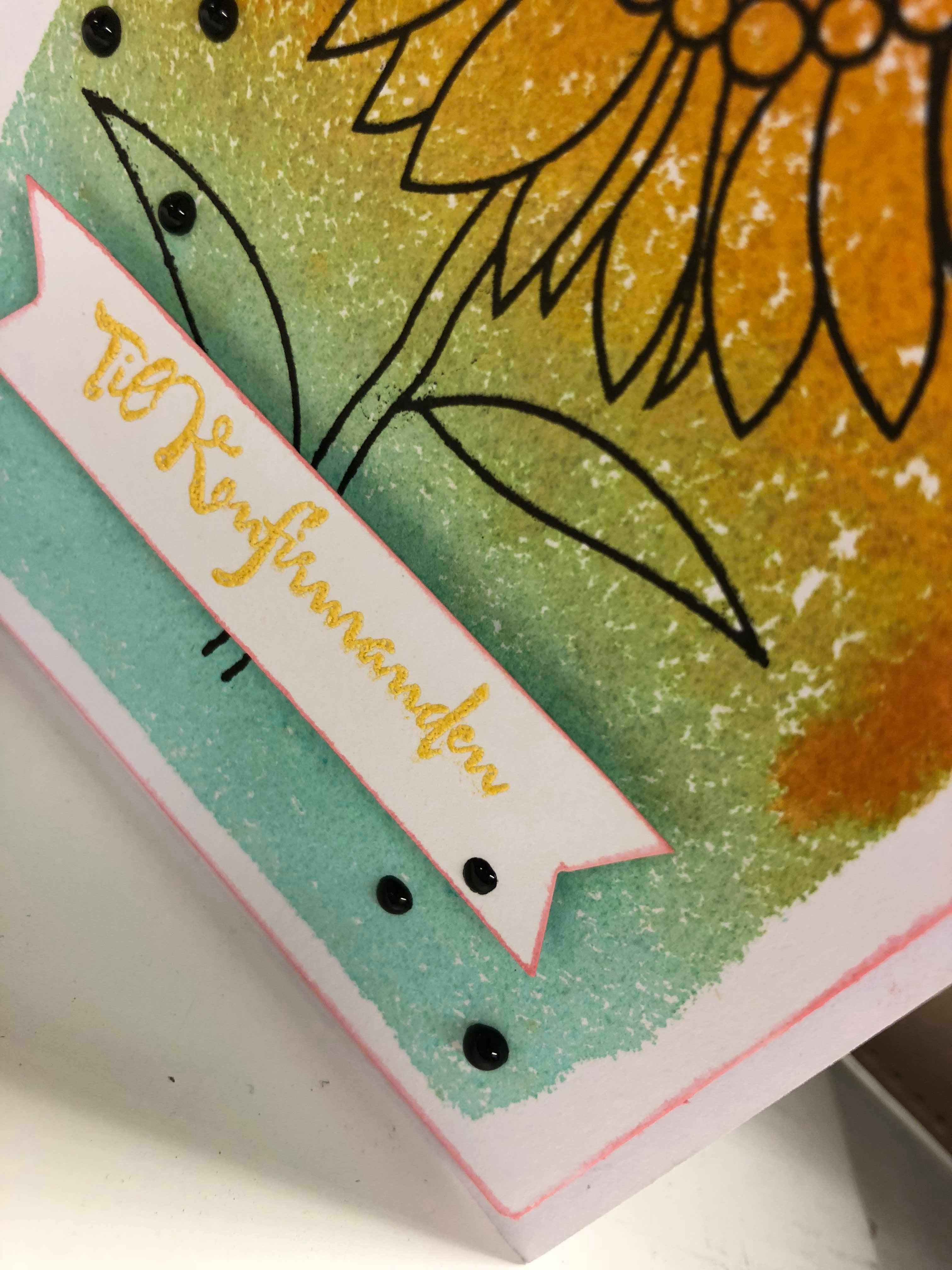 Efter det var tørt stemplede jeg mit motiv med Archival Ink i Jet Black fra Krumsping. Teksten er embosset med en gul embossingpulver.