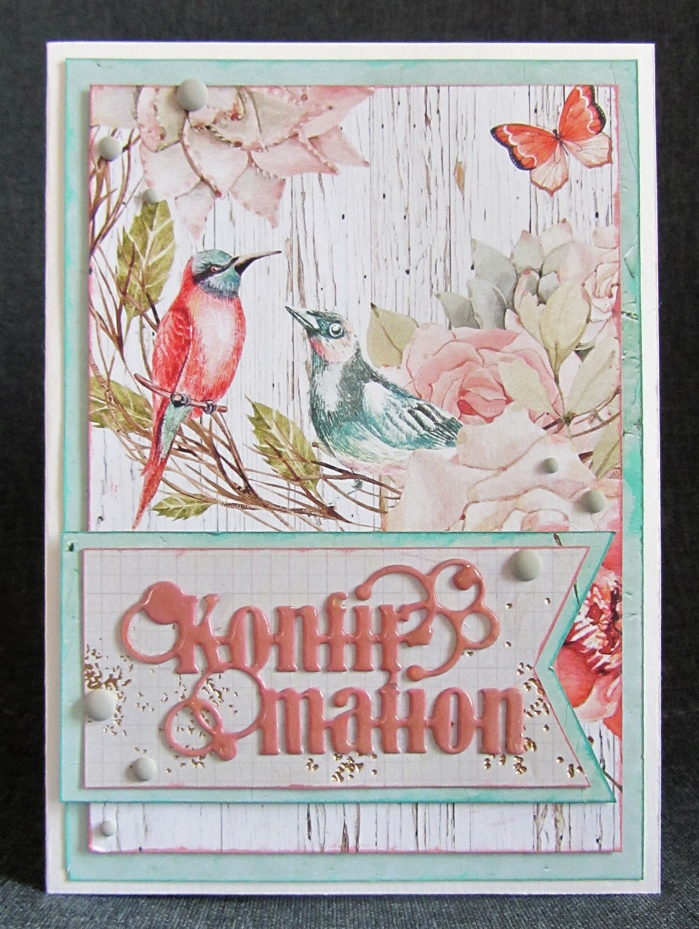 Jeg har brugt papirer fra Birdsong kollektionen, som er en del af Mintay produkterne, der er designet af Karola. Derudover er der også brugt et enkelt papir med lækre foliedetaljer fra Prima.