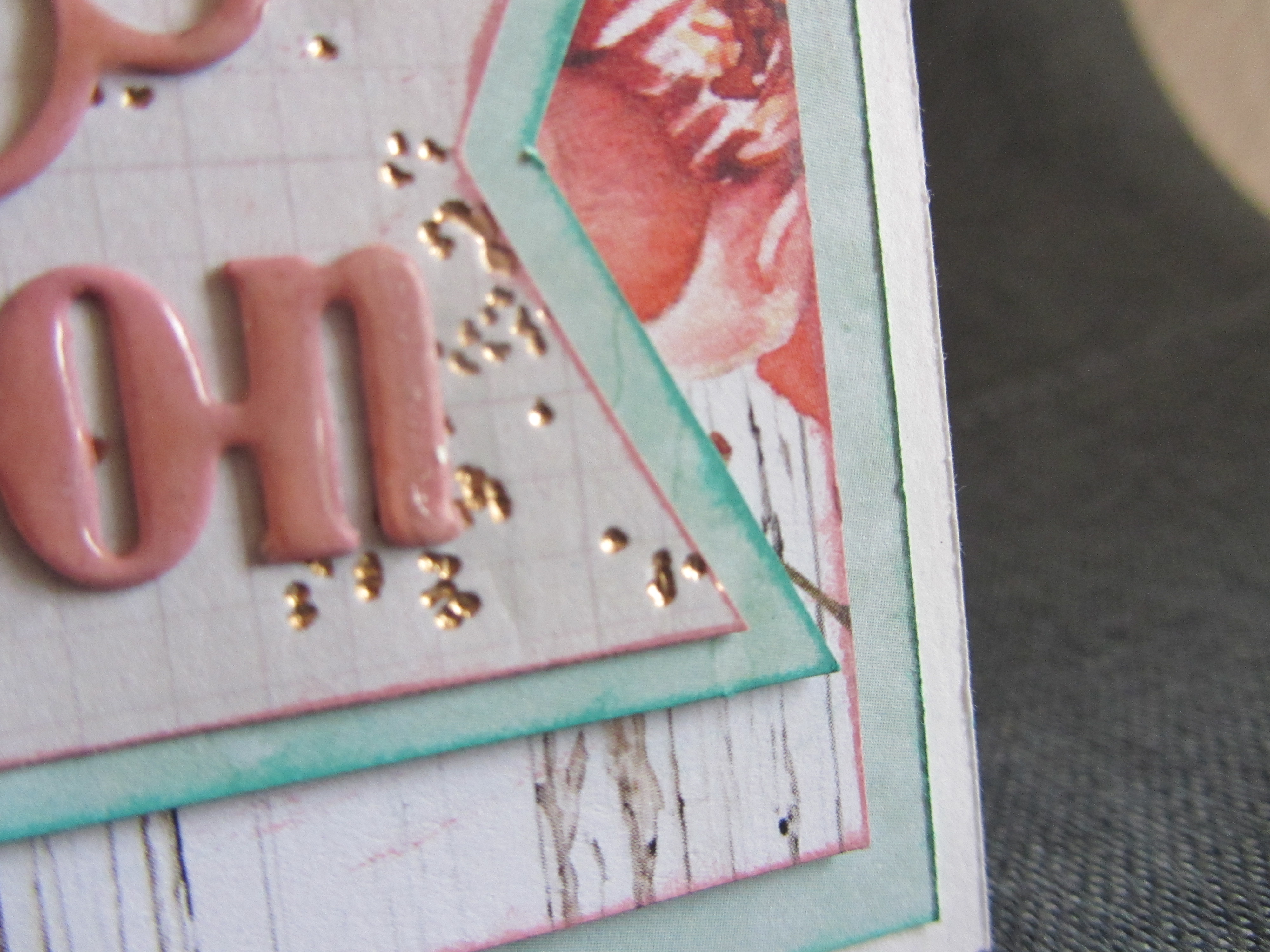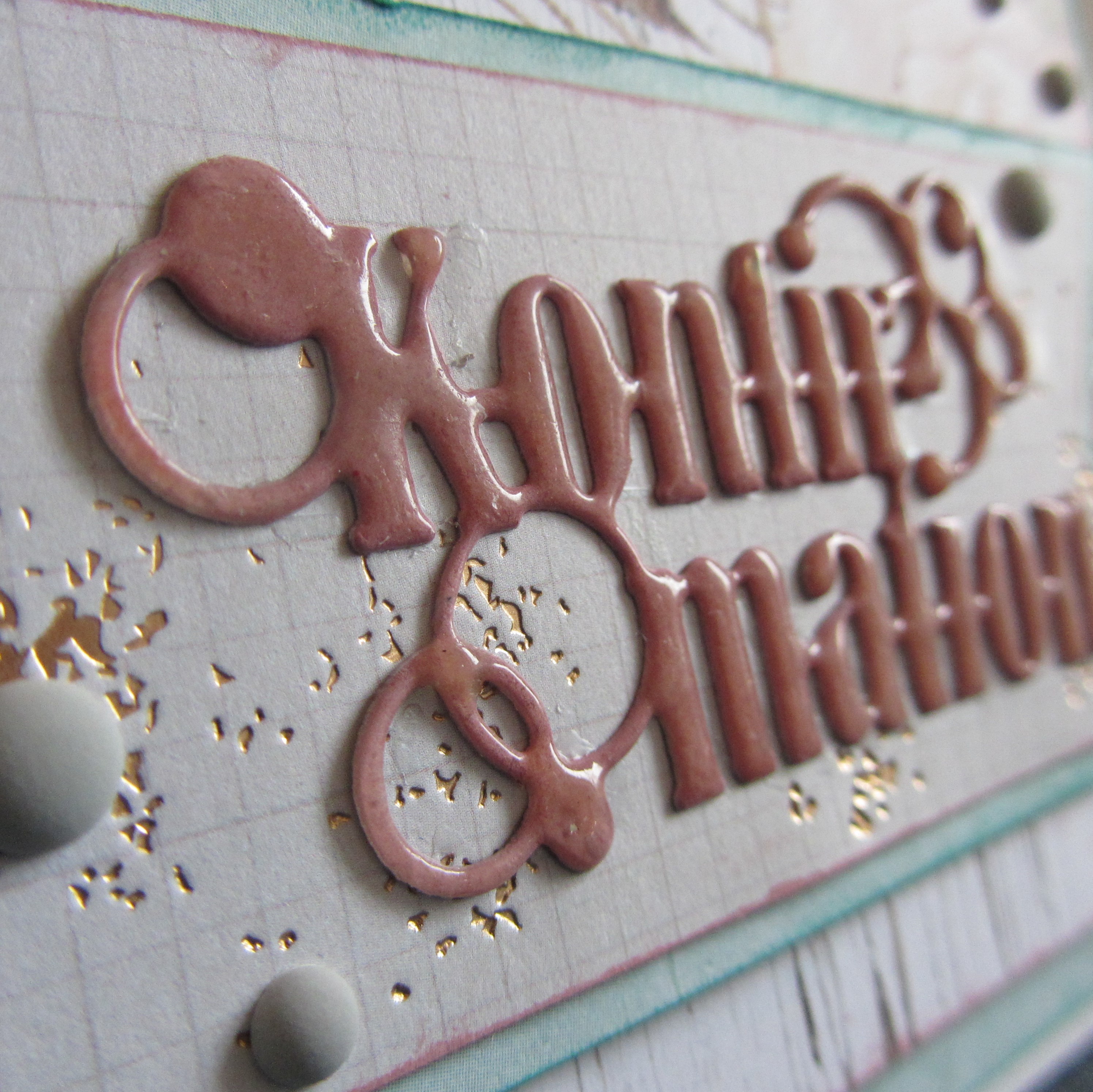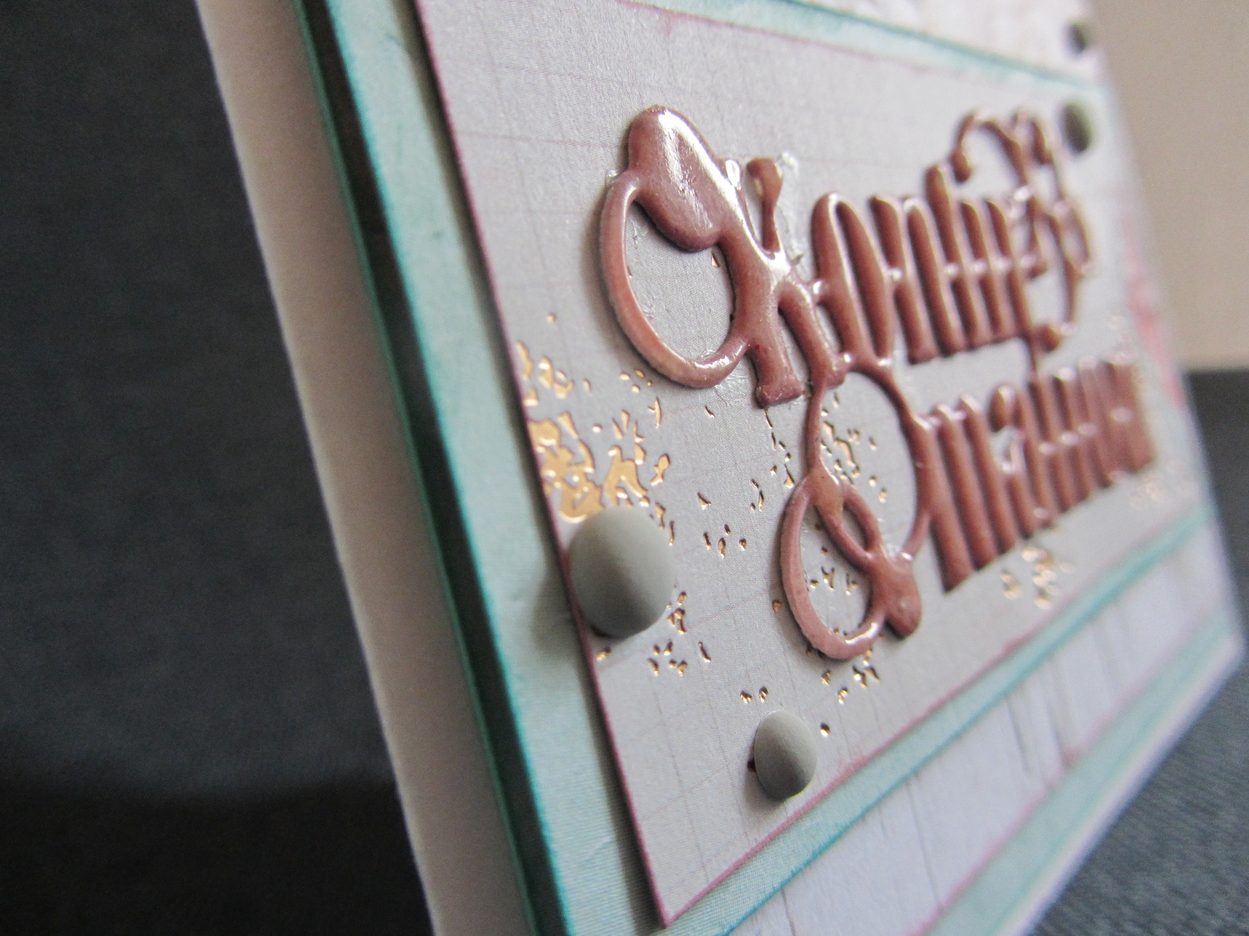 Teksten er en die fra By Lene. Jeg har startet med at farvelægge et lyst stykke karton med en stempelsværte i en farve, der matcher papirerne. Det er en fed måde at lave sit eget matchende papir på. Jeg har brugt en Versamagic sværte, som er en pigmentsværte, og derfor kan den embosses. Så efter jeg havde udskåret dien og påført sværte, embossede jeg med klar embossingpulver. Derefter påførte jeg Versamark sværte og embossede igen med klar embossingpulver. Dette gentog jeg en 4-5 gange, så jeg til sidst får en tekst, der har en tyk enamel lignende overflade.