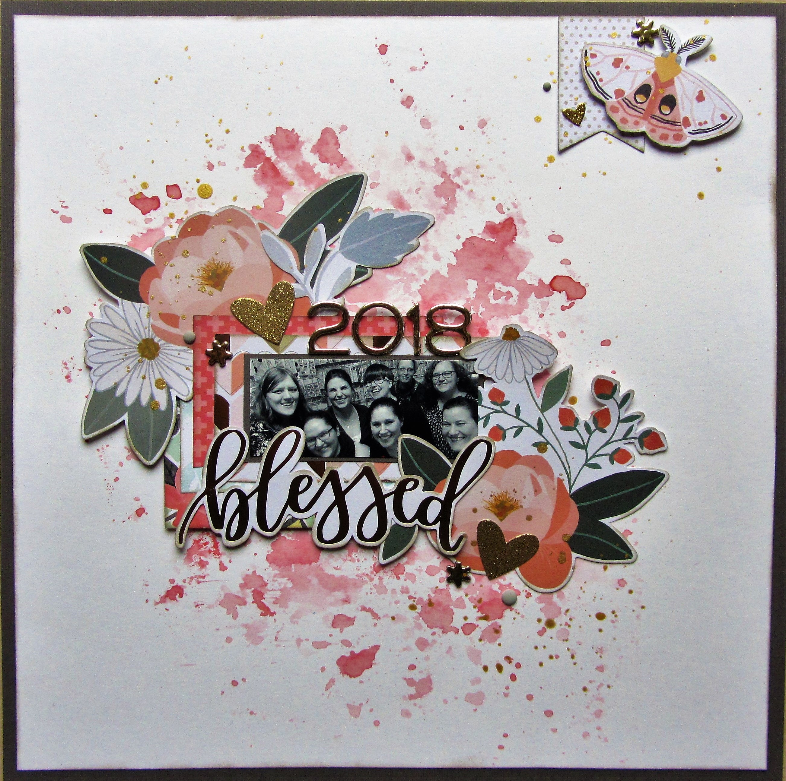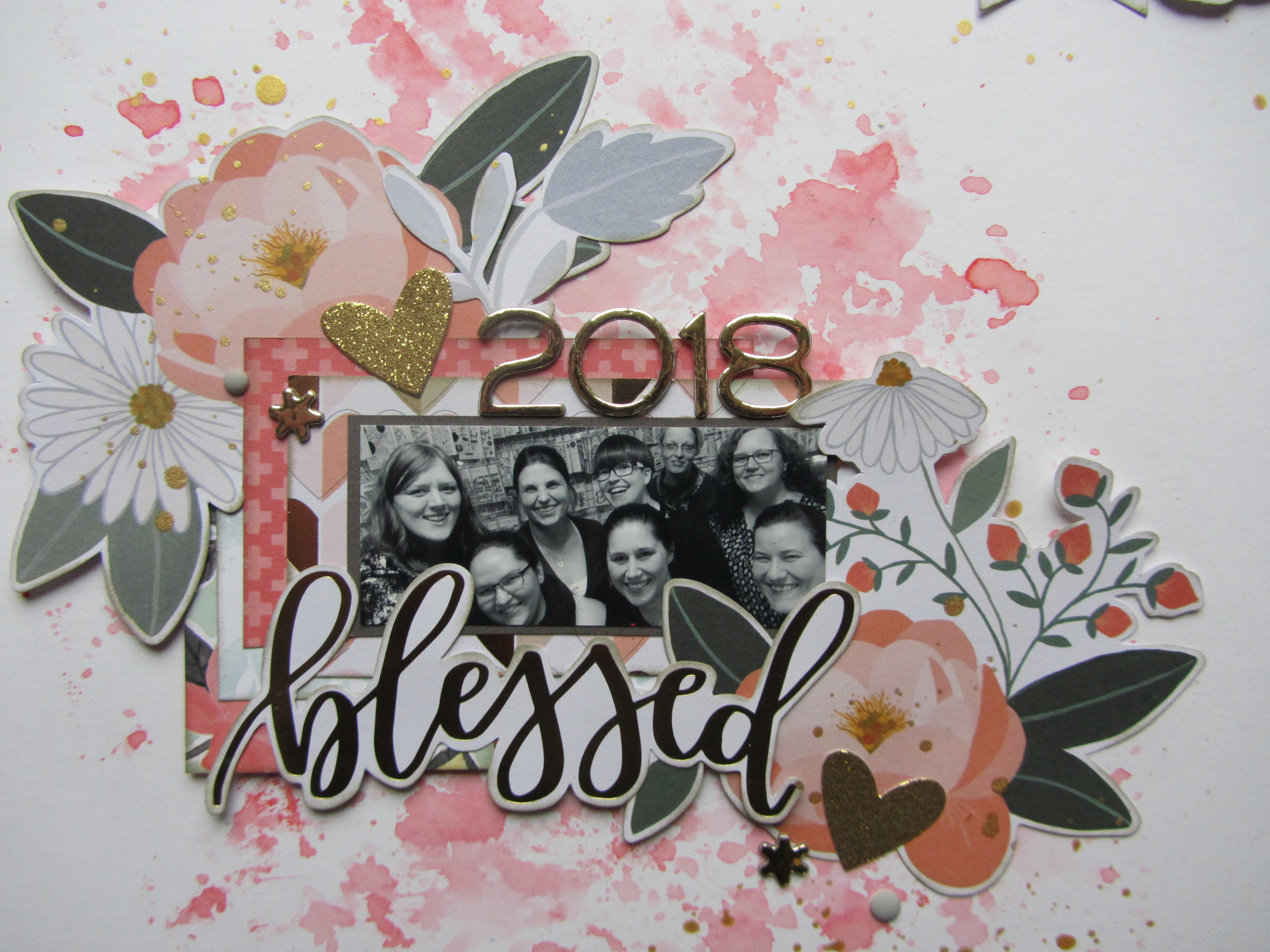De store blomster og ordet Blessed fra diecut pakken er gode som blikfang, da de er store. Tallene er fra et sæt Thickers i guld, som matcher diecutsene.