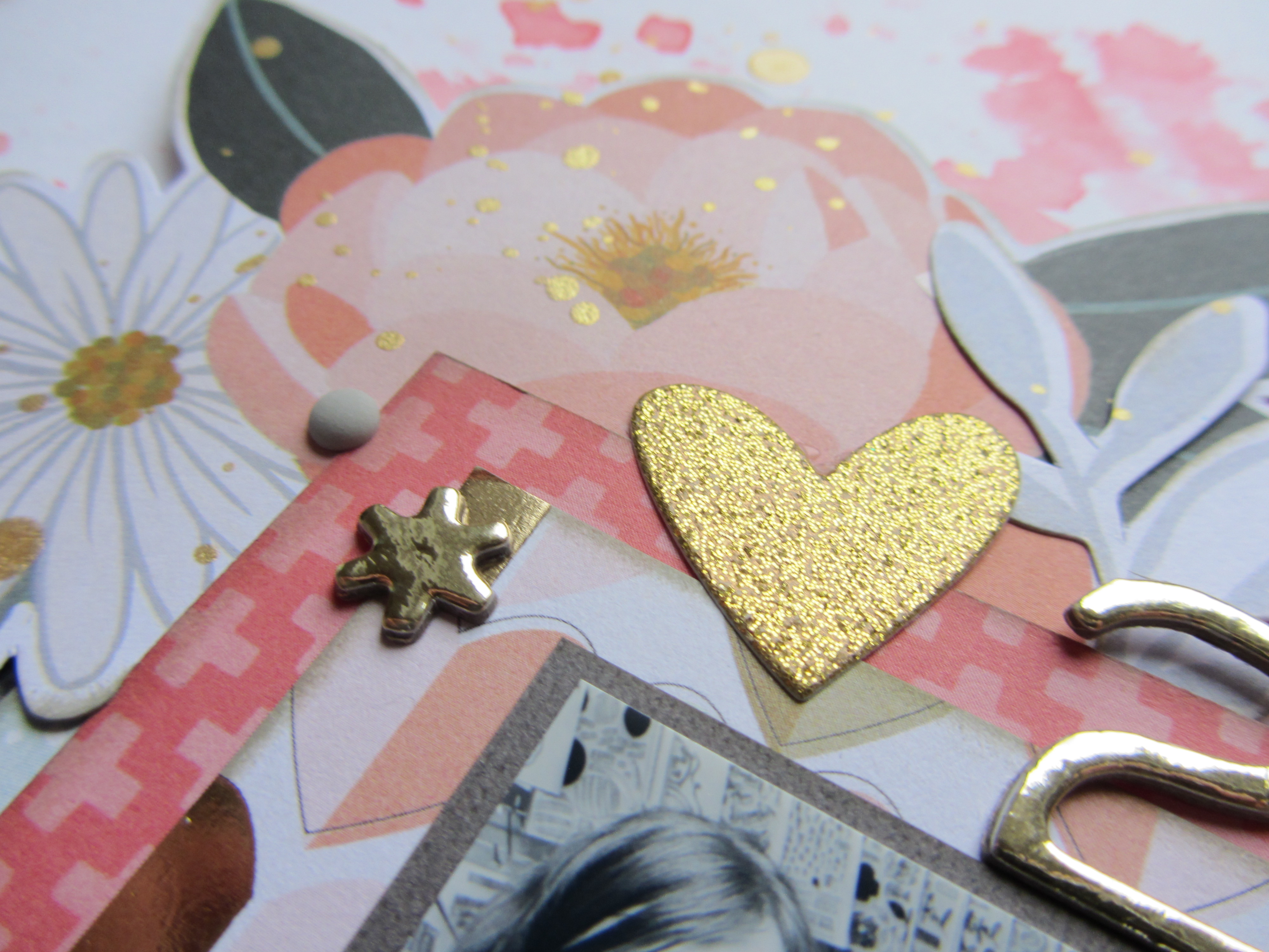 Jeg har ud af guldglimmer karton skåret nogle hjerter, som er pålimet så de danner en visuel trekant, der skaber en rækkefølge for øjet rundt på layoutet.